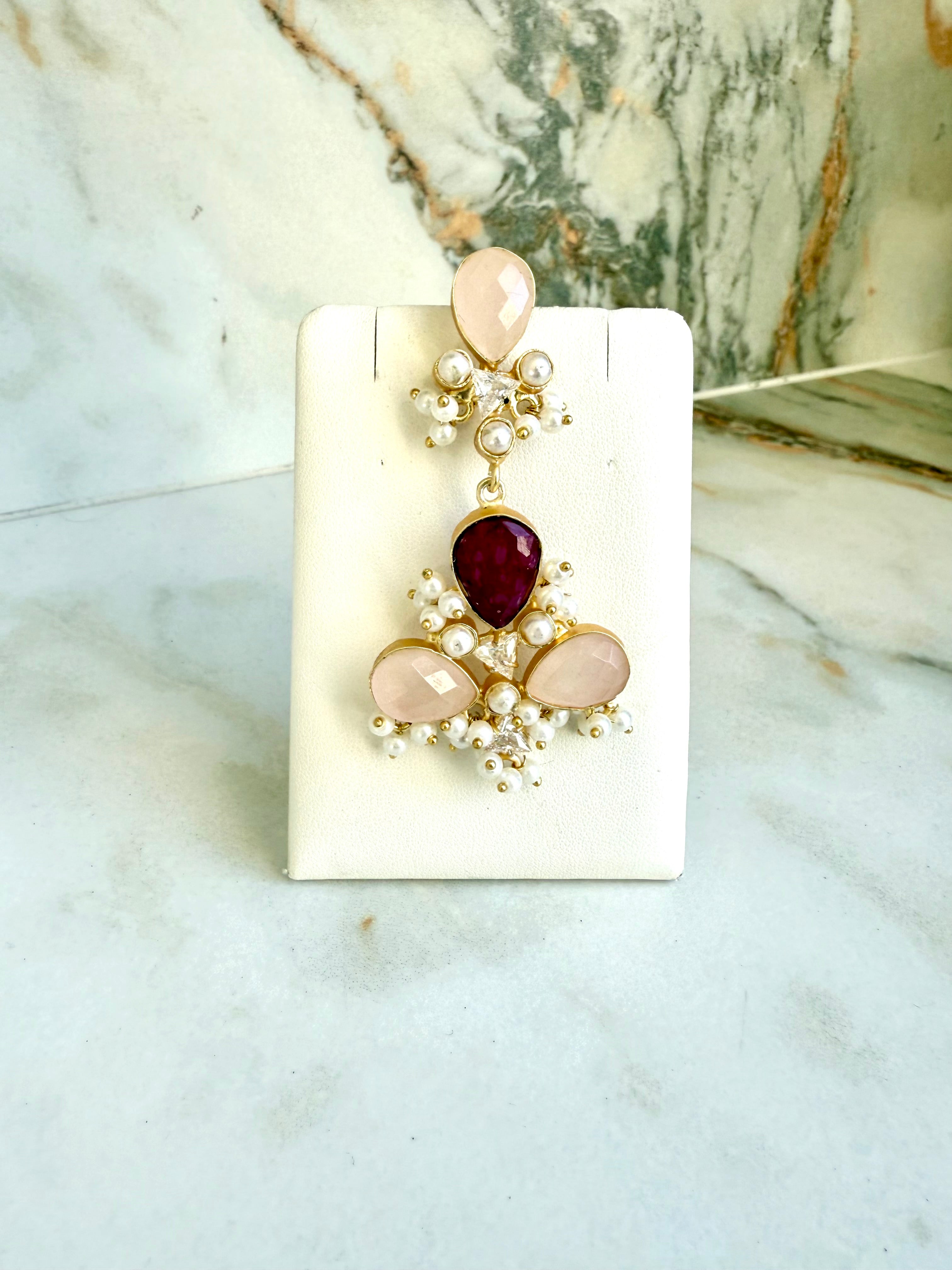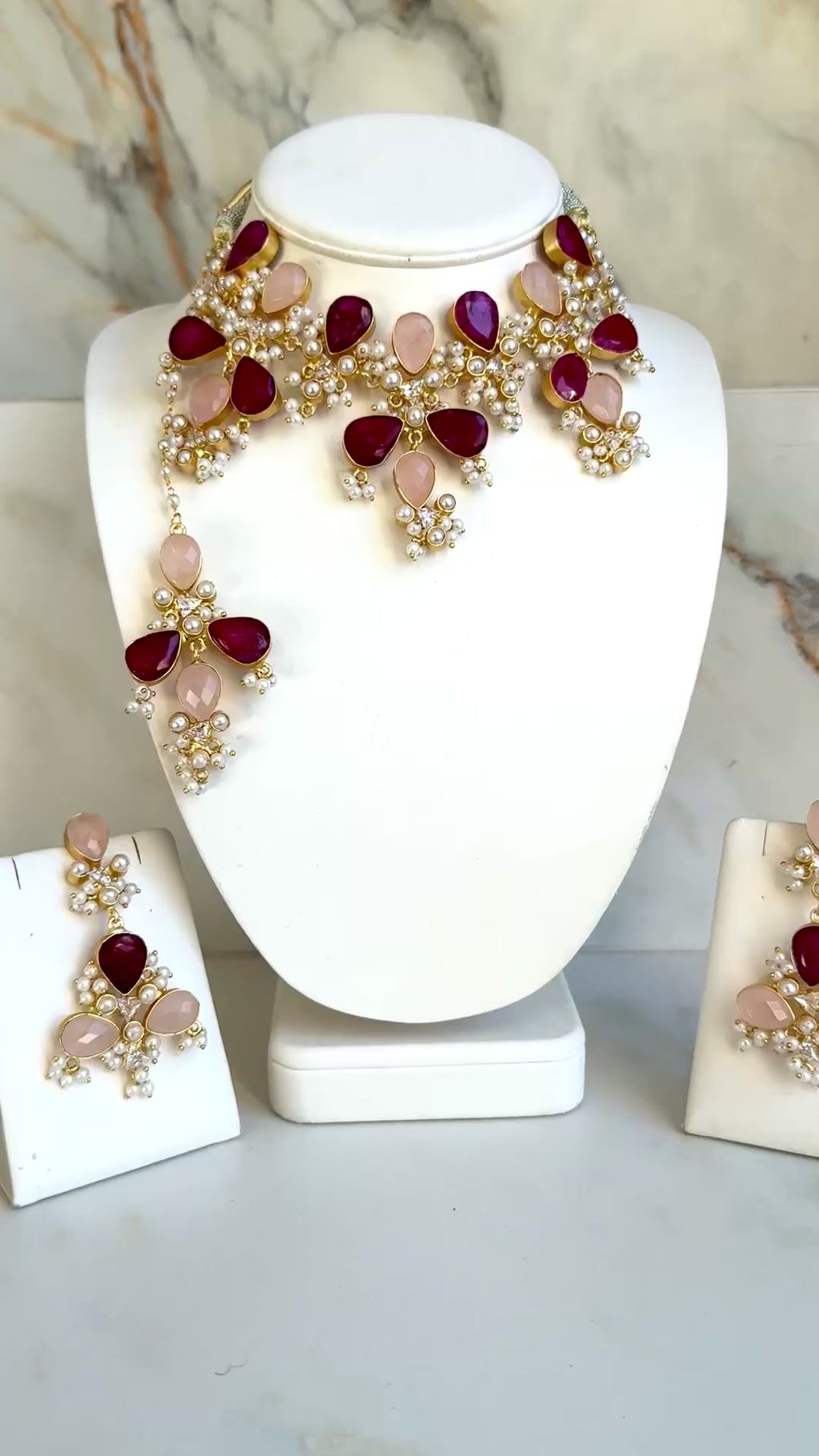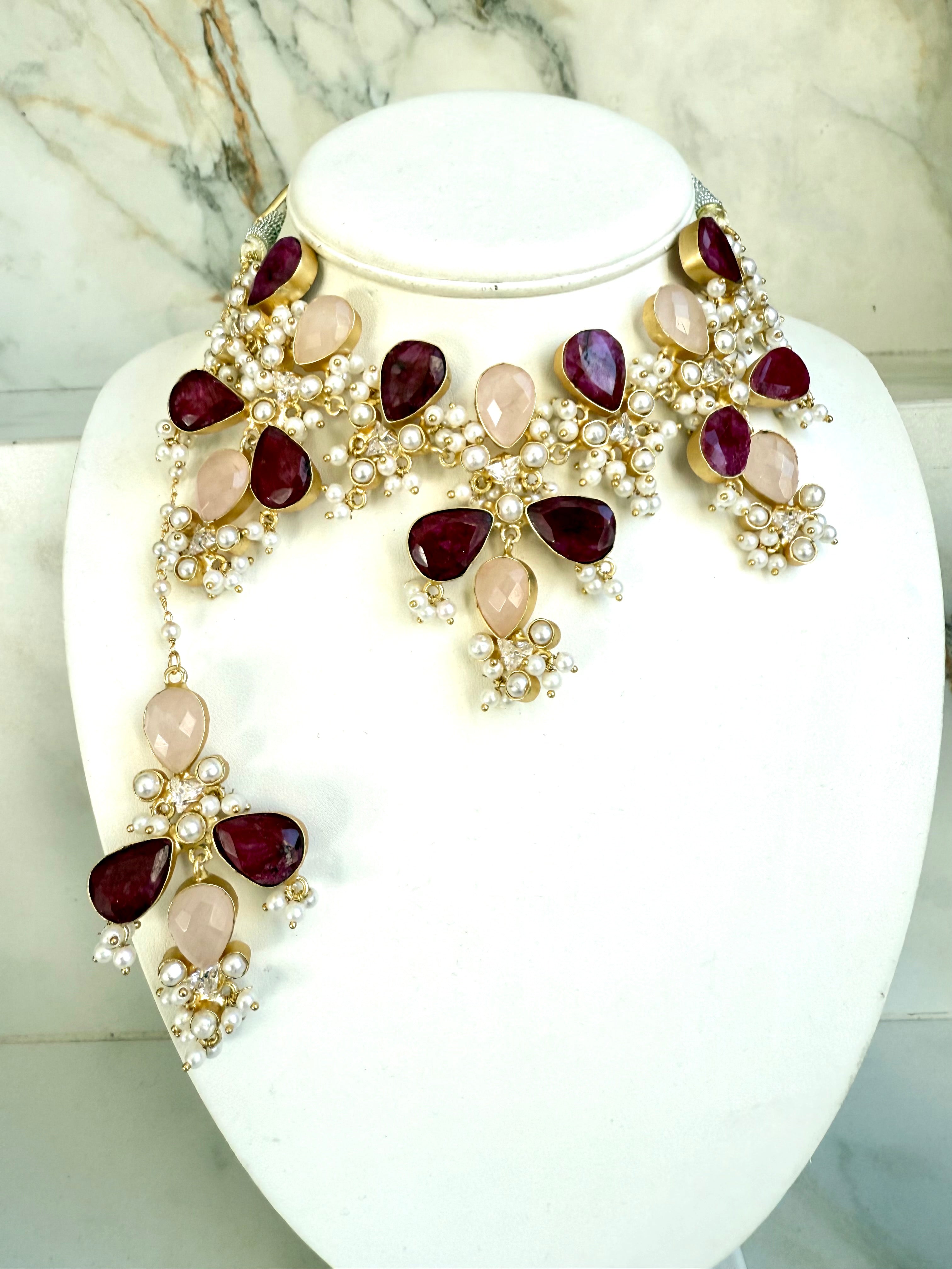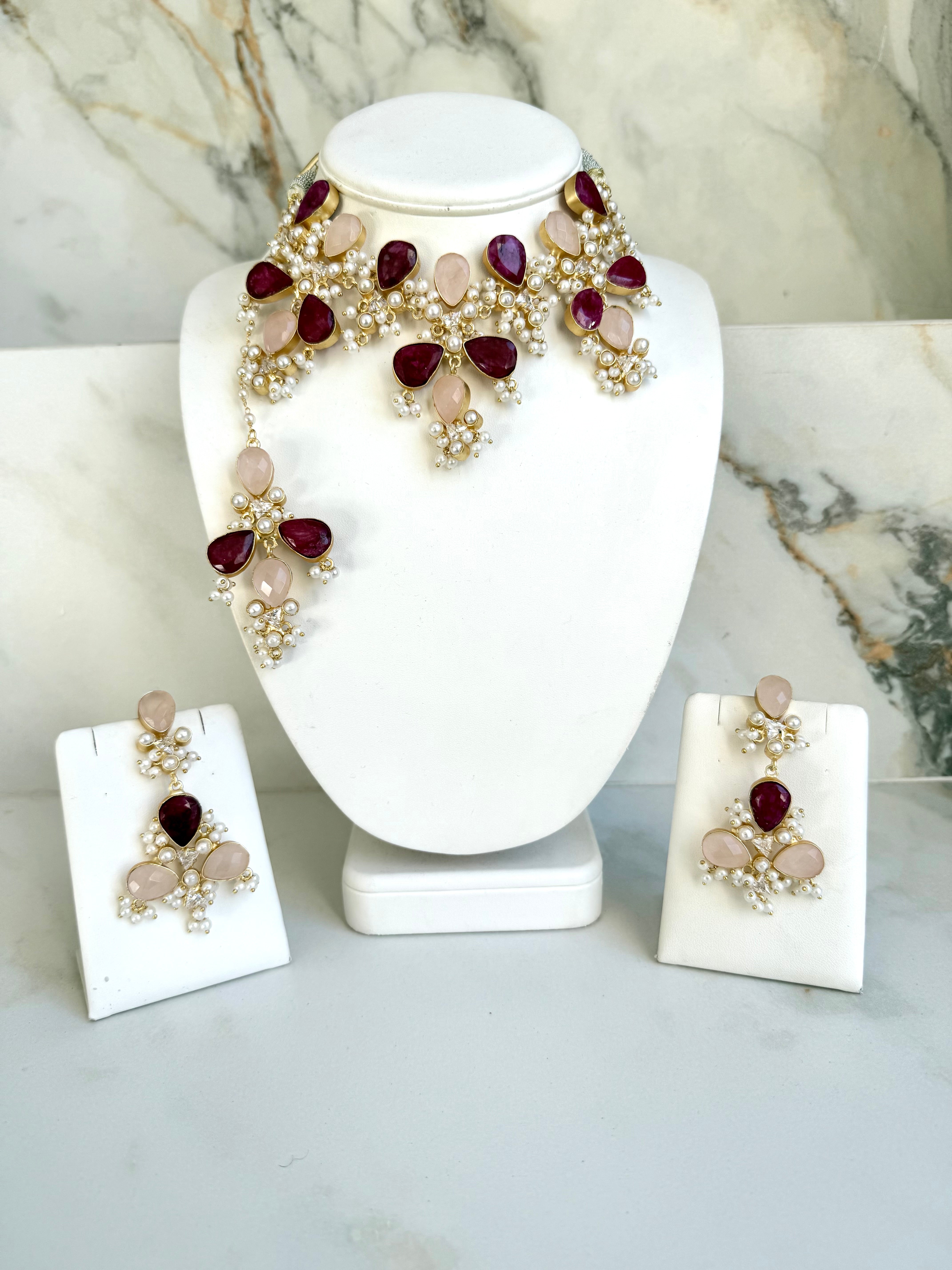 Elevate your elegance with our Ruby Set, a breathtaking fusion of m charm and regal craftsmanship. This statement choker is adorned with soft pink gemstone cabochons, artfully arranged in a floral-inspired design and delicately accented with lustrous pearls. Paired with matching earrings, the set exudes grace, making it perfect for weddings, festive occasions, or modern celebrations where tradition meets sophistication.