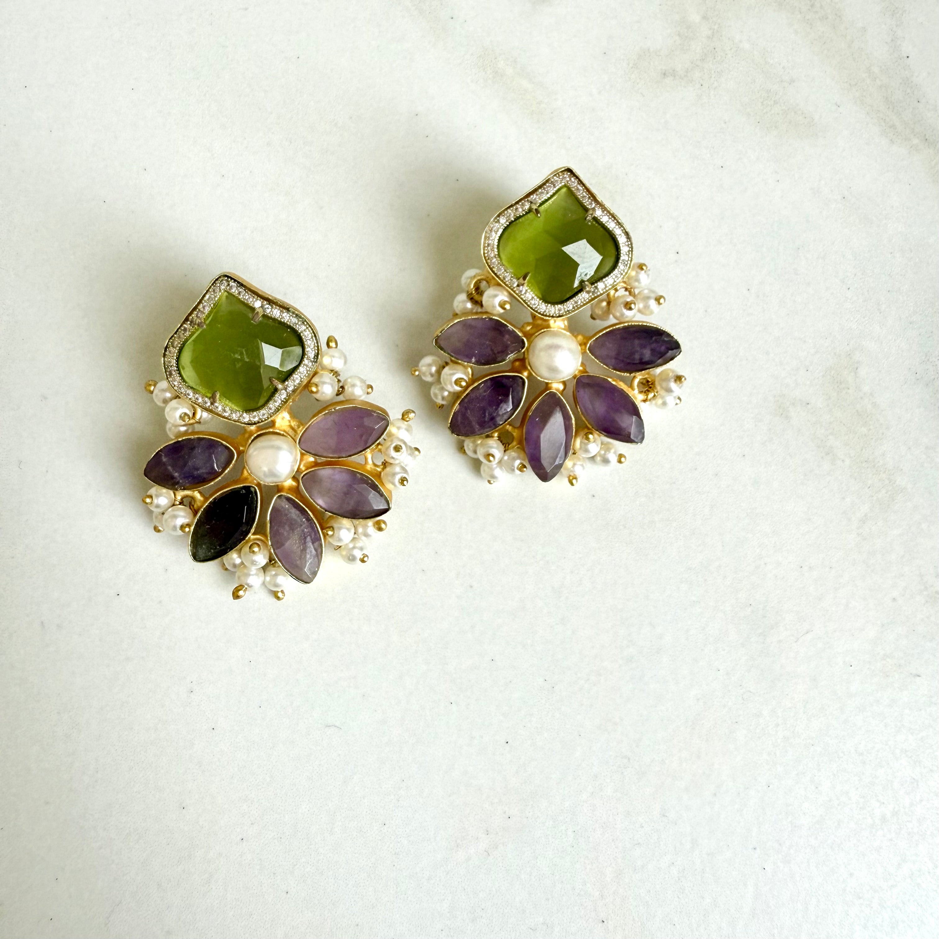 luxurious pair of handcrafted earrings featuring a lime-toned faceted gemstone at the top, encircled by delicate cubic zirconia. Below, a floral arrangement of purple marquise-cut stones radiates around a central luminous pearl, accented with dainty pearl clusters. Set in a rich gold-plated frame, these earrings blend earthy elegance with a fresh pastel charm, perfect for festive occasions or refined everyday wear.