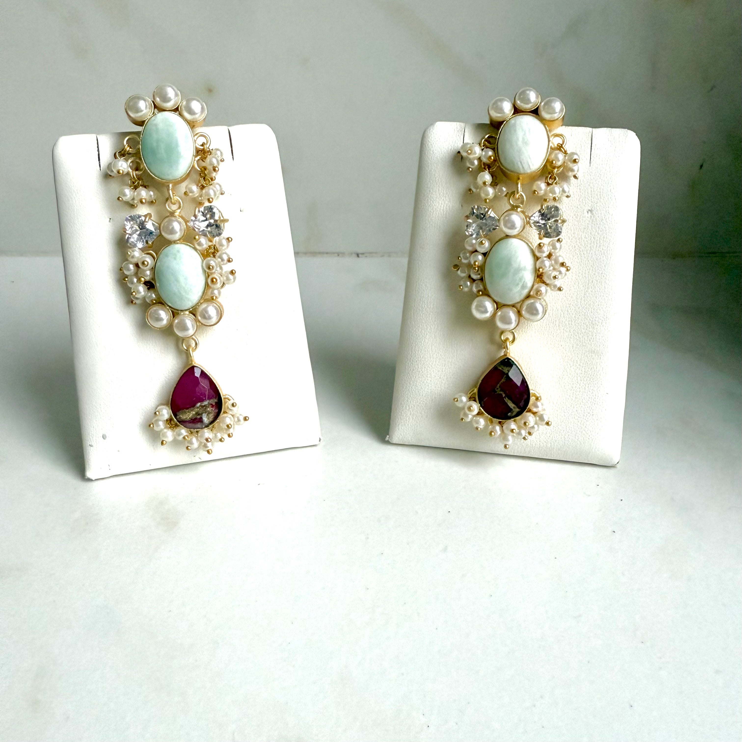 Upgrade your jewelry collection with these elegant Amy Long Drop Earrings. Made with stunning amazonite stones, each earring boasts a ruby bottom for added sophistication. Elevate your style with these unique and eye-catching earrings.