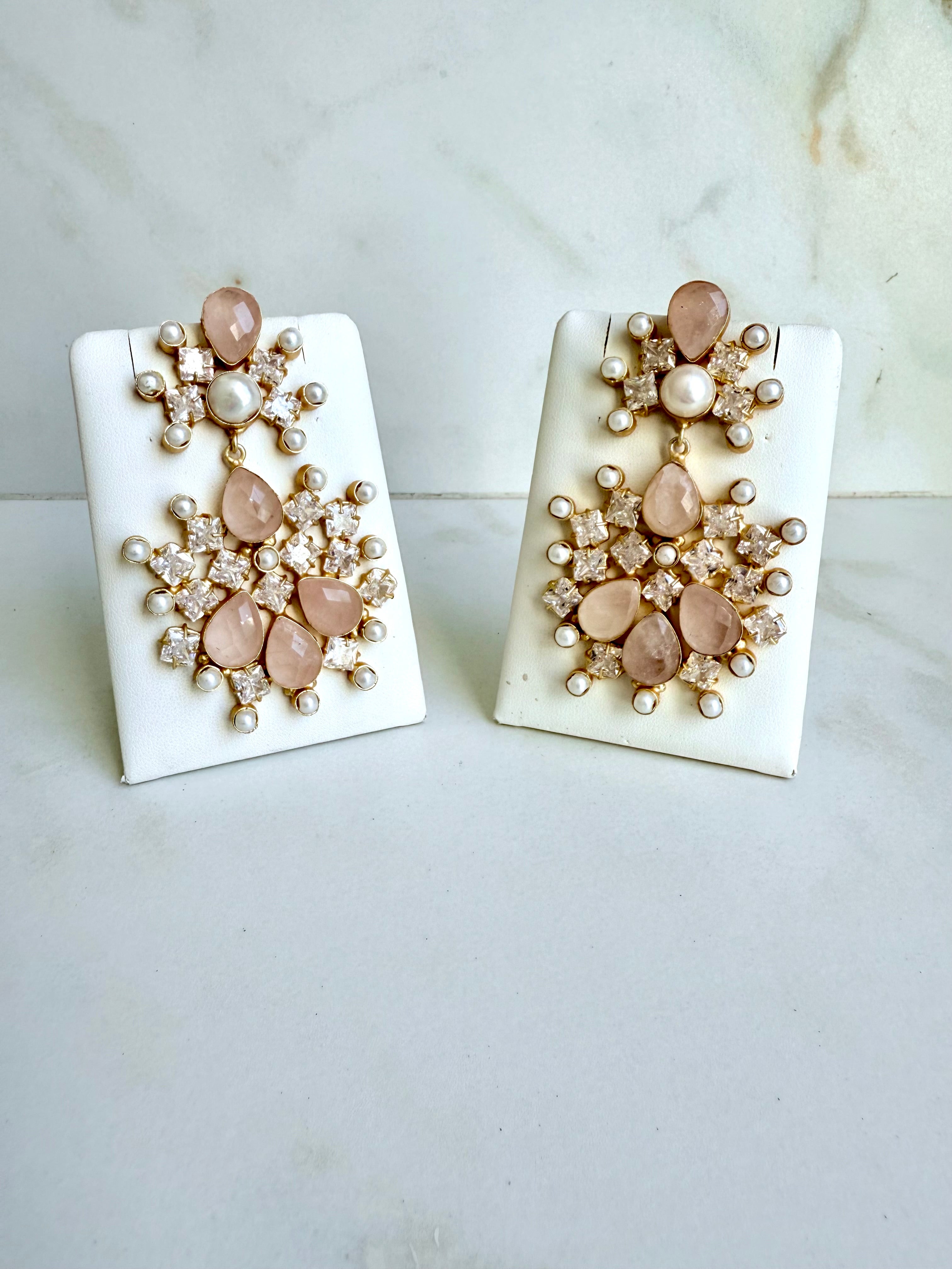 Unveil your royal charm with Meeraa Jewels’ Bloom Earrings. Handcrafted with precision, these stunning earrings showcase rich -hued stones in a floral cascade, framed with glimmering zircon crystals and classic pearls. Set in a high-shine gold-tone finish, this piece perfectly balances traditional grandeur and modern finesse. A statement accessory for weddings, festive soirées, or elegant celebrations.