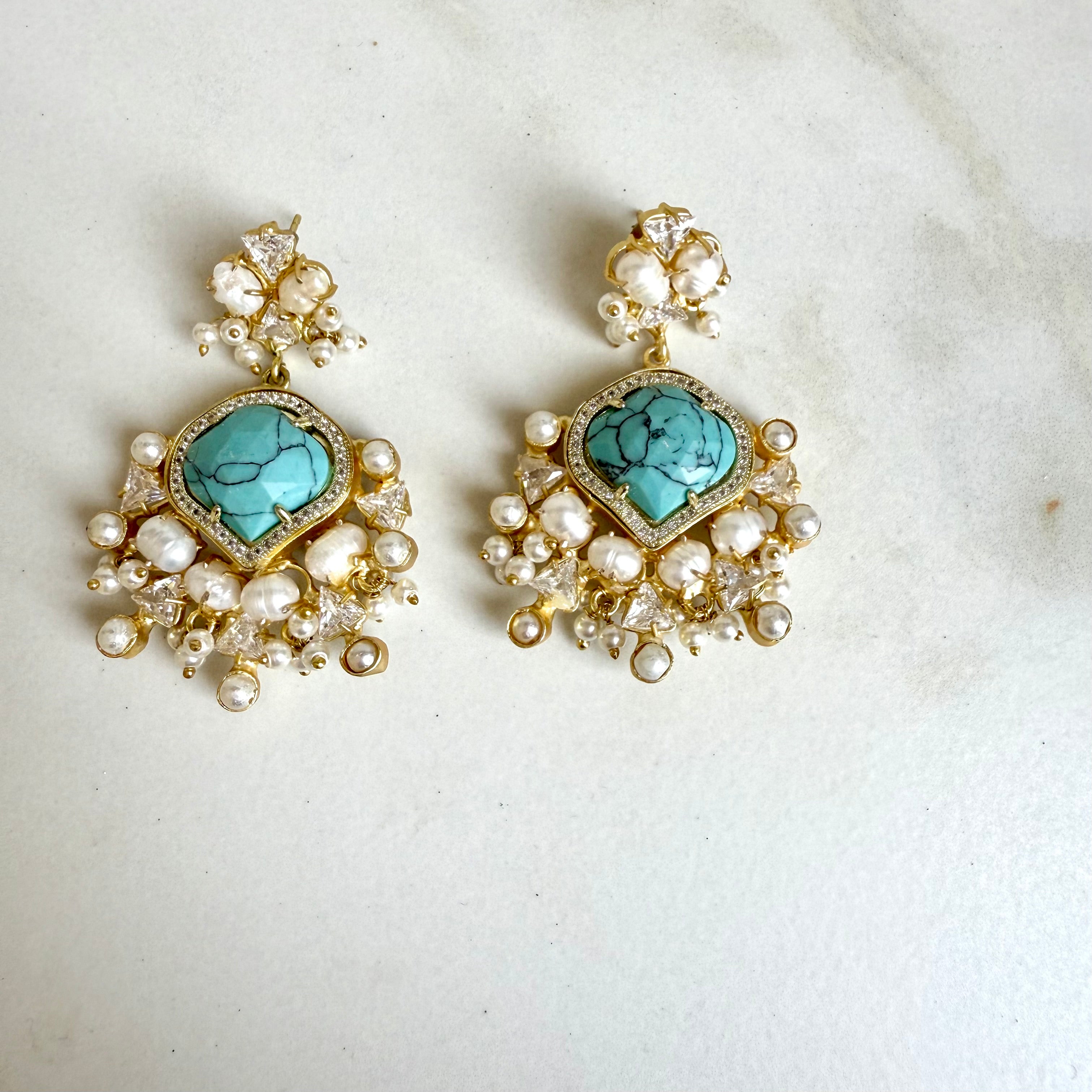 These graceful chandelier earrings feature a faceted Mona lisa gemstone at the center, framed with delicate crystal accents in a gold-plated setting. A cascade of lustrous pearls and cubic zirconia clusters surrounds the design, creating a rich, elegant texture. Perfect for weddings, festive celebrations, and refined evening wear, these earrings blend soft feminine tones with timeless sophistication.