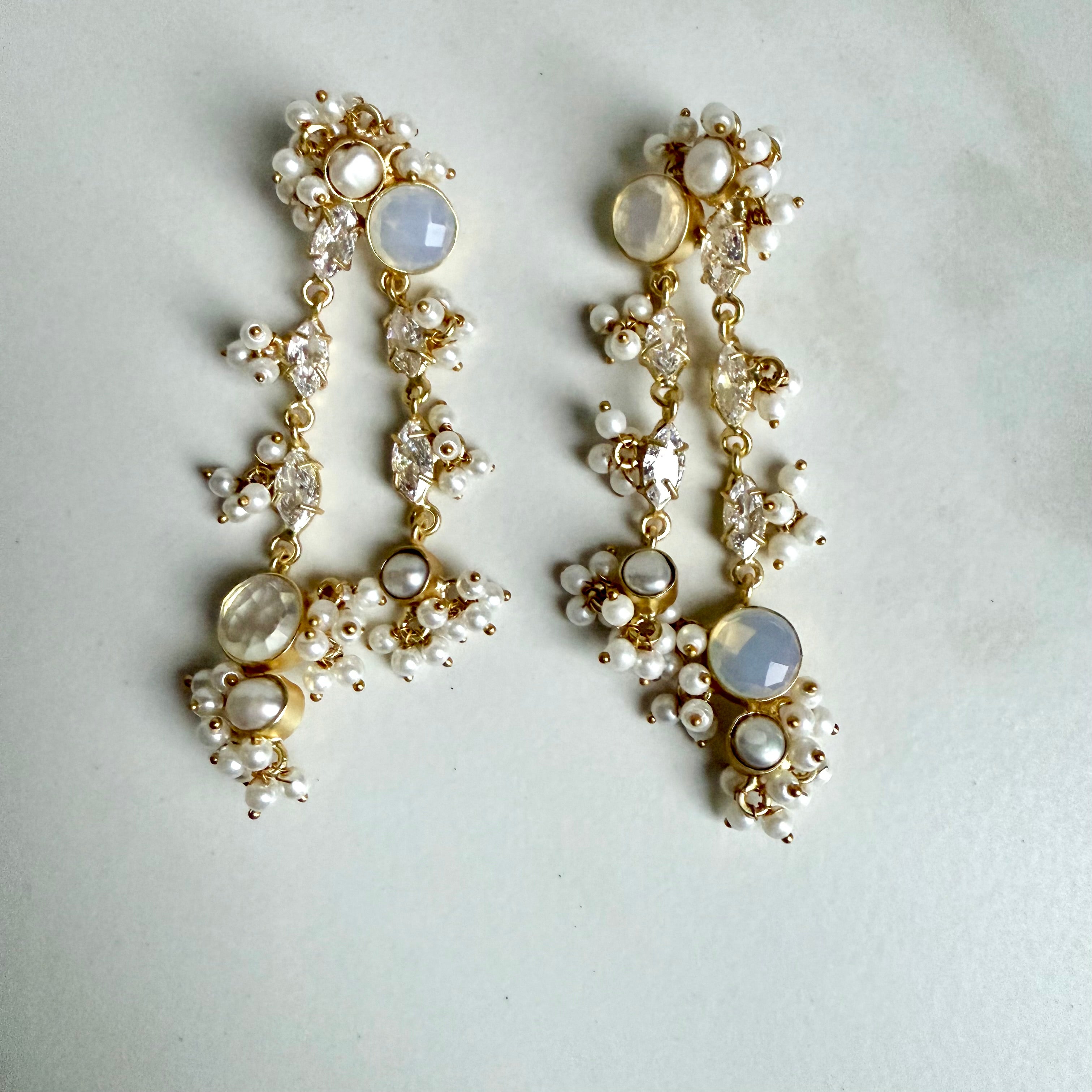 Radiating timeless grace, there’s Selenite Danglers are a poetic blend of vibrant gemstones and delicate pearls. Handcrafted in gold-plated settings, each earring features deep ruby cabochons paired with translucent green prehnite stones and clusters of fine pearls. The cascading silhouette moves gracefully, catching light with every turn — perfect for festive occasions, weddings, or elevating a classic saree look.