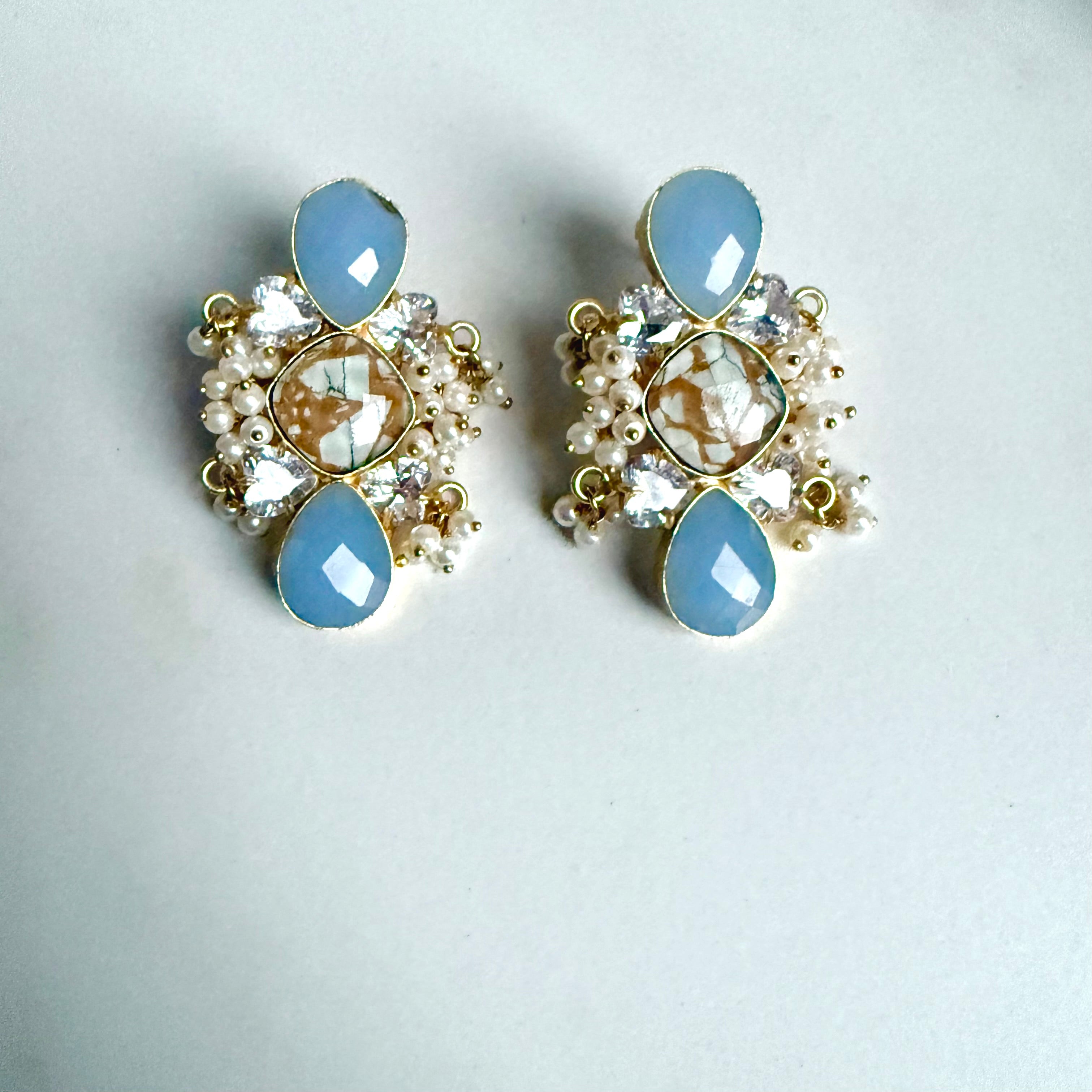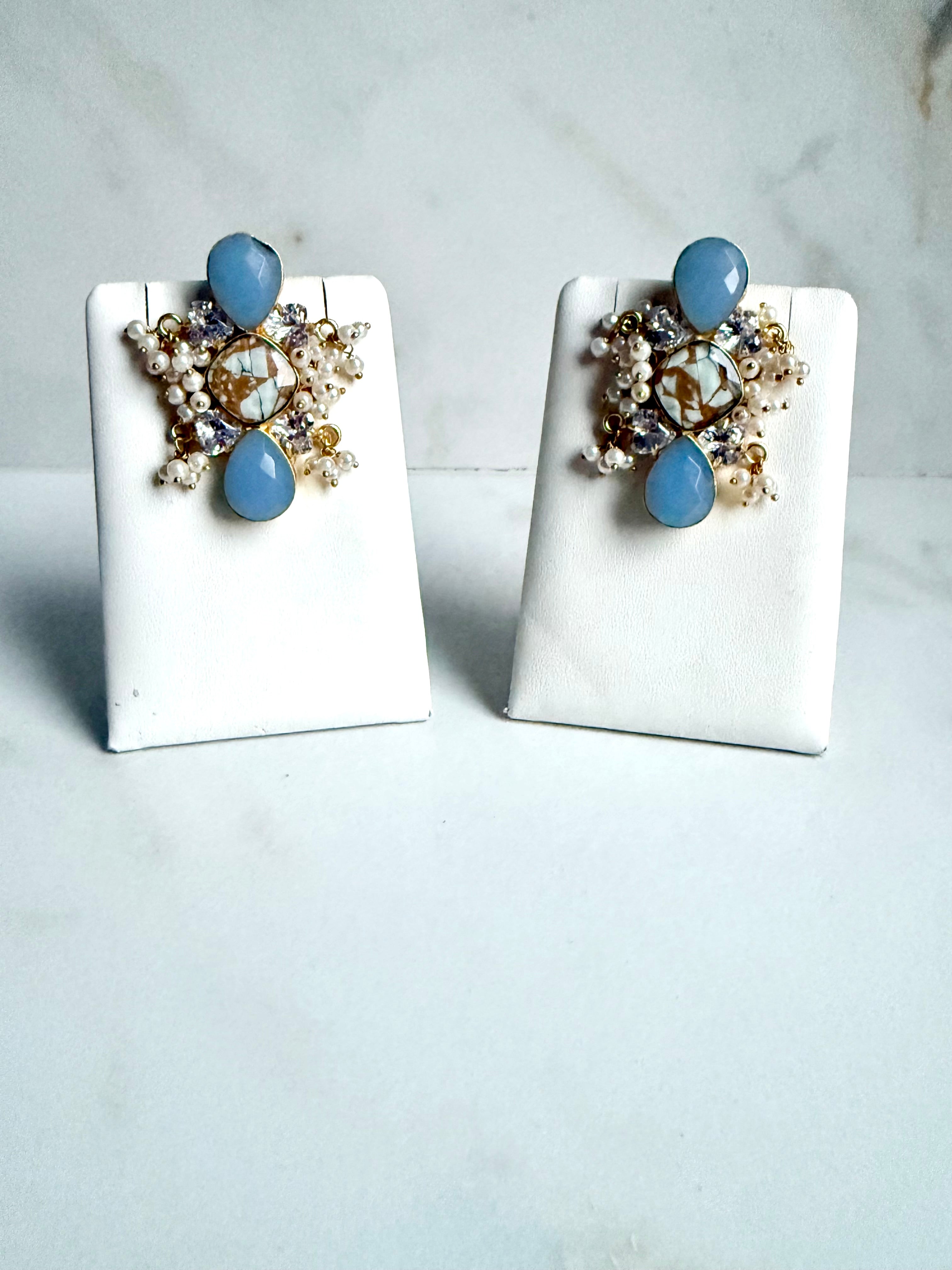 Introducing Liberty Marble Mosaic Earrings. Our stunning design features a gorgeous mosaic center, accented with sparkling crystals and elegant pearls. Elevate your style with these must-have earrings, perfect for any occasion. Expertly crafted to add a touch of elegance to any outfit.