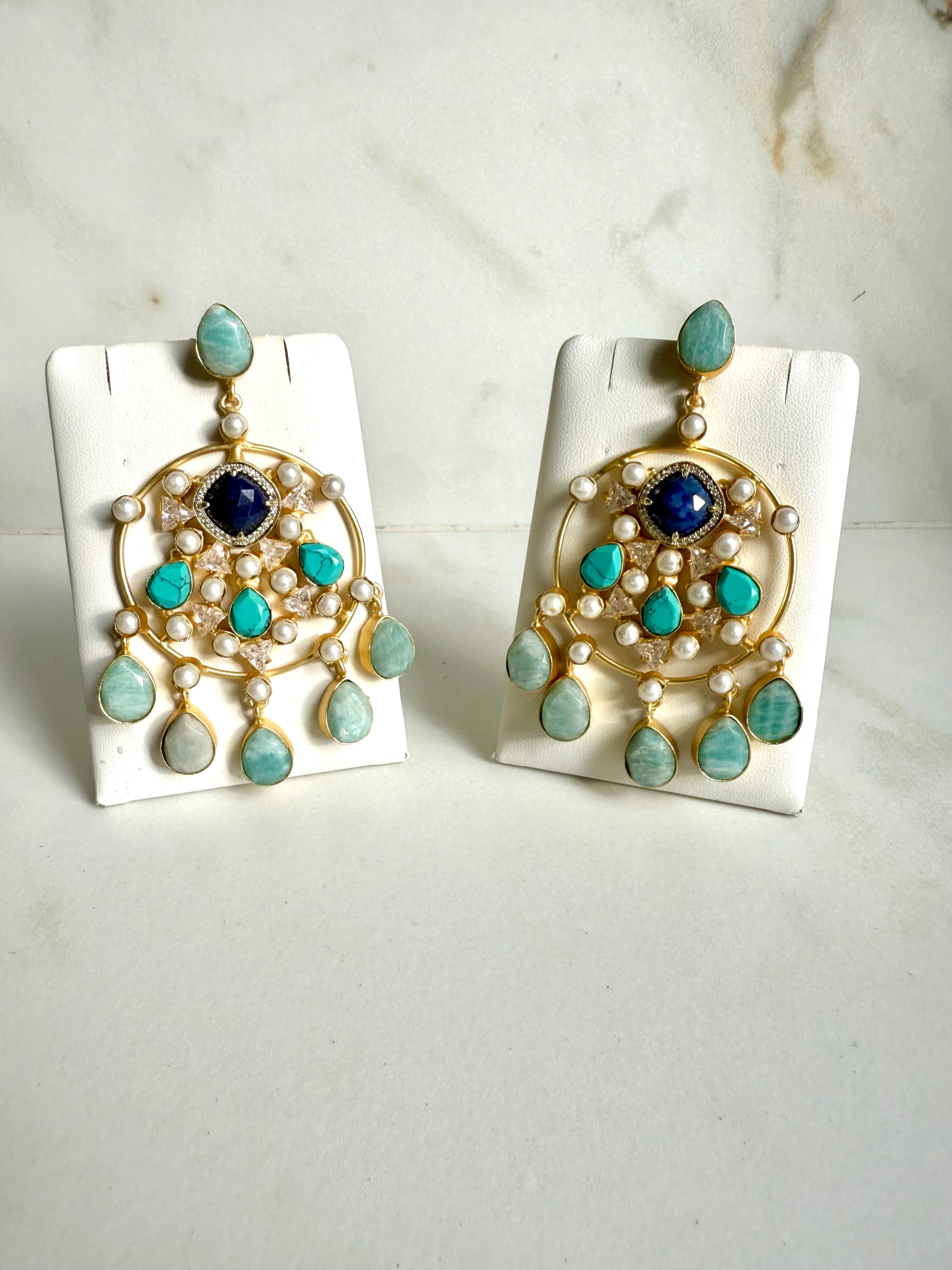 Inspired by the serene beauty of the sea, these statement chandelier earrings feature a captivating mix of deep navy, turquoise, and aquamarine gemstones, accented with lustrous pearls and sparkling cubic zirconia. Set in a gold-plated frame, the intricate floral and drop design adds a touch of elegance and grandeur, perfect for festive occasions, weddings, or evening glamour. Lightweight yet striking, they bring a refreshing pop of color to any ensemble.