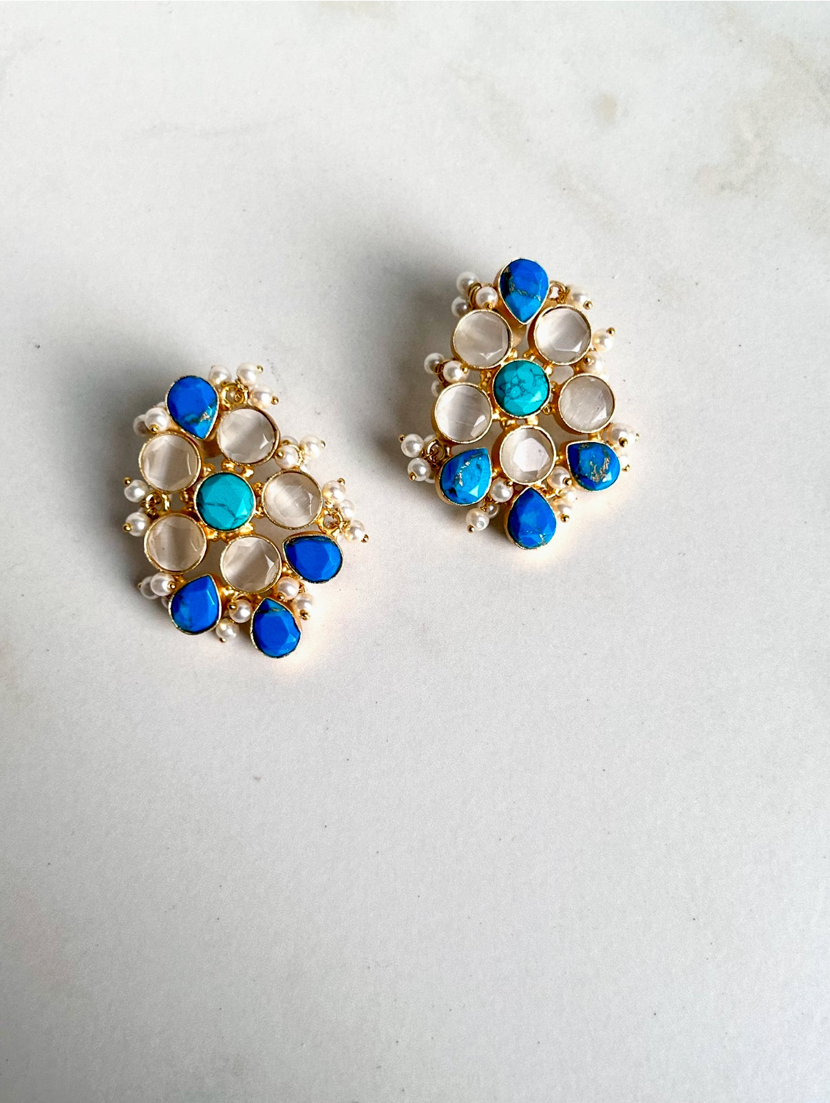 Elevate your elegance with the these Blue Earrings, a dazzling fusion of ethereal charm and traditional craftsmanship. Featuring radiant round-cut gemstones that shimmer, these earrings are beautifully accented with white pearls and sparkling cubic zirconia. Set in a classic gold-tone frame and finished with clusters of delicate pearls, they are perfect for festive occasions, bridal ensembles, or as a standout accessory for any elegant affair