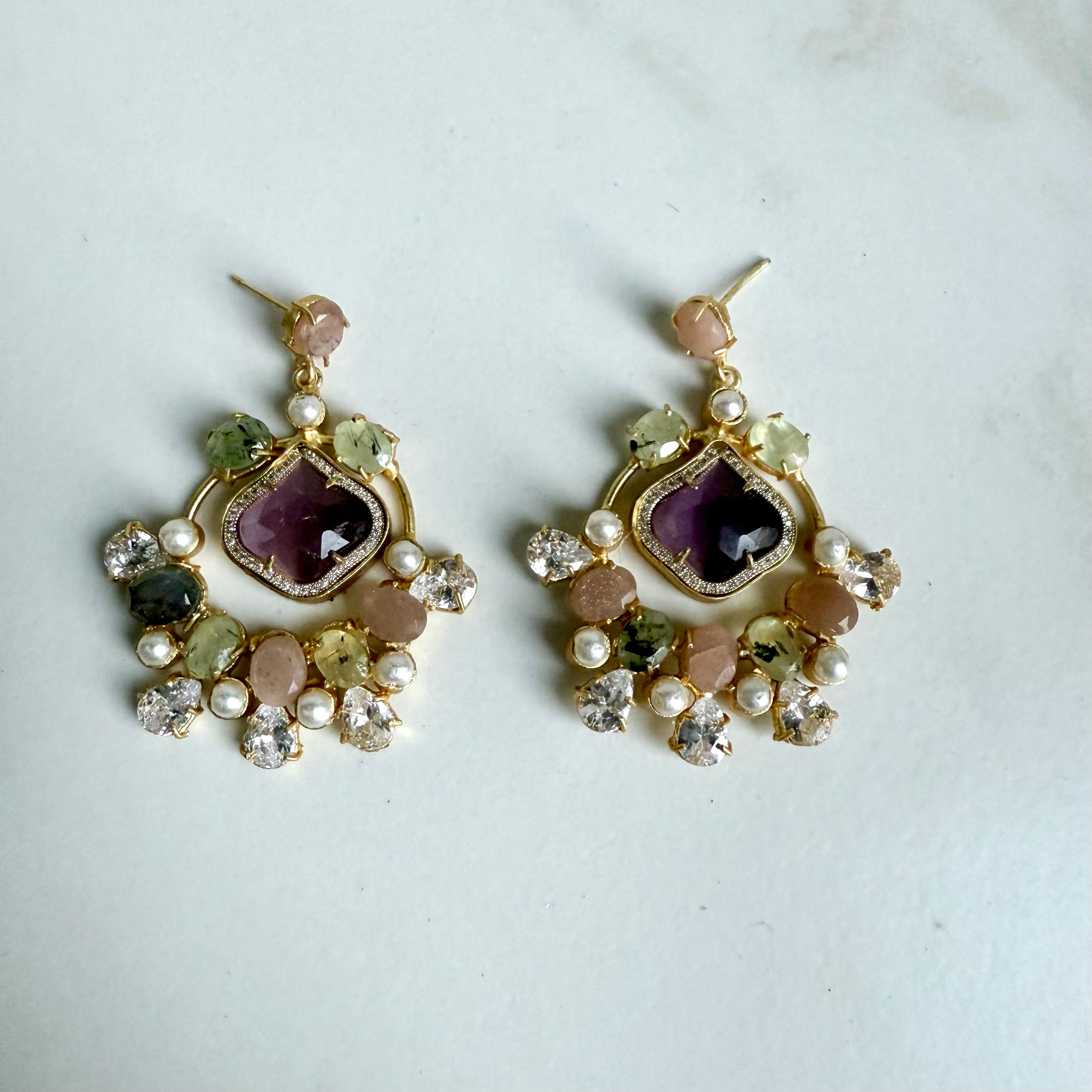 These elegant earrings feature a Dark Purple quartz gemstone at the centre, encased in a delicate halo of sparkling cubic zirconia. Surrounding it are lustrous pearls in varying sizes, accented with crystal clusters for added brilliance. Set in a radiant gold-plated frame, this design exudes femininity and timeless charm, making it perfect for weddings, festive occasions, or elegant evening wear