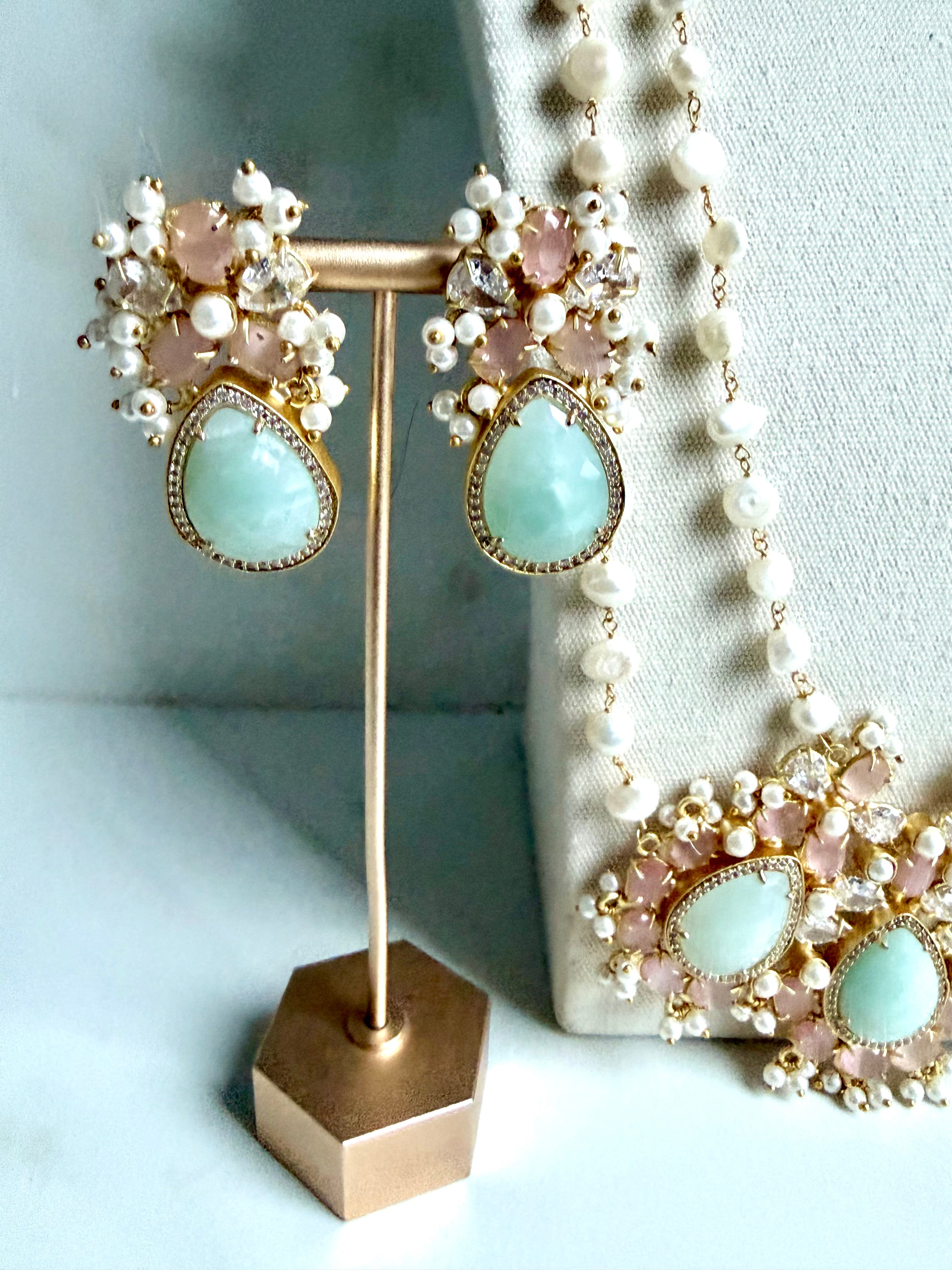 The Amzonite Double Pearl Mala Set features high-quality amzonite beads paired with double pearls with meticulous attention to detail, featuring a unique crust of pink crystals. This aesthetic enhancement not only elevates the visual appeal but also reflects the use of natural elements, promoting mindful meditation and stress relief practices through its soothing color palette.