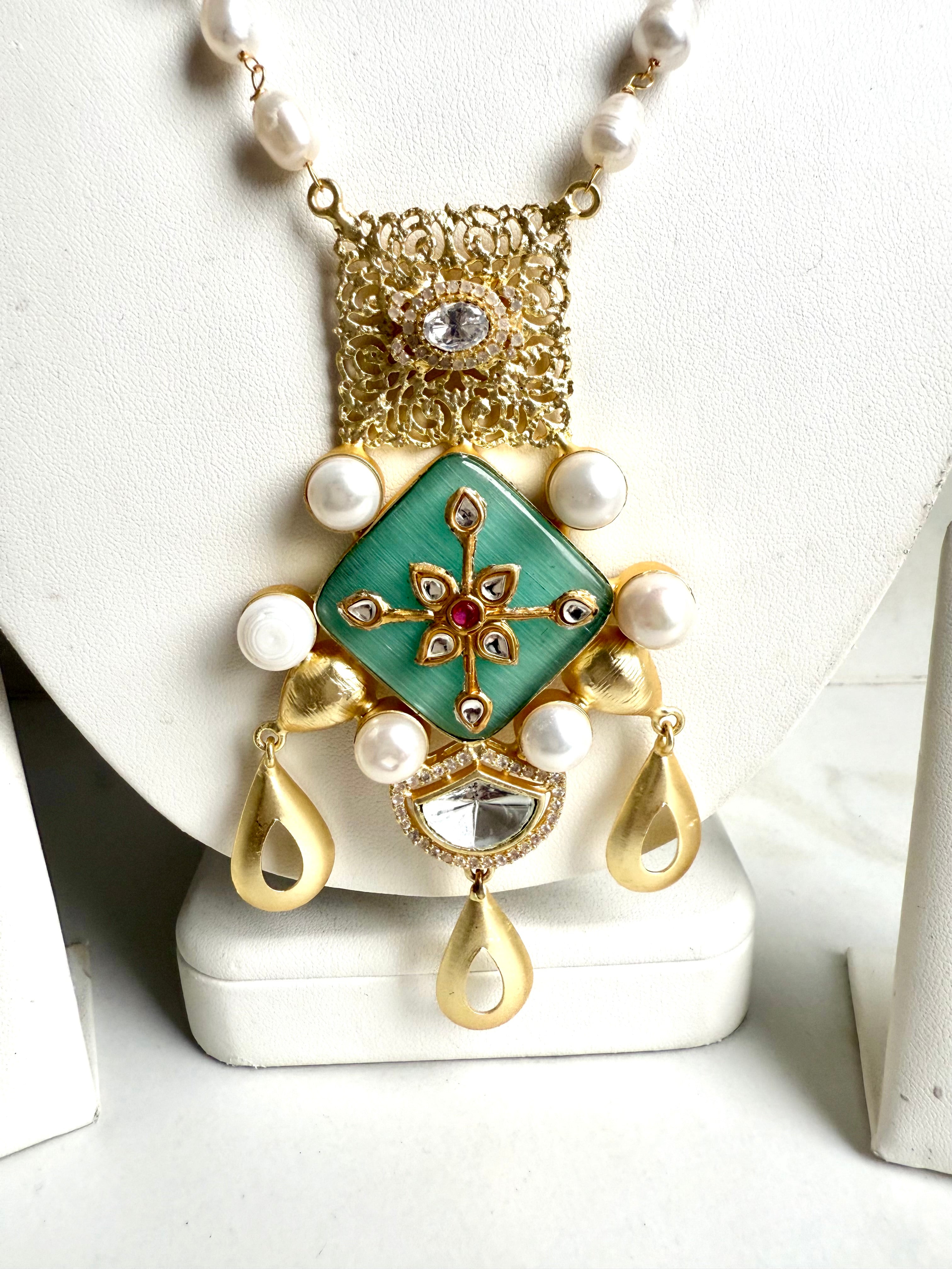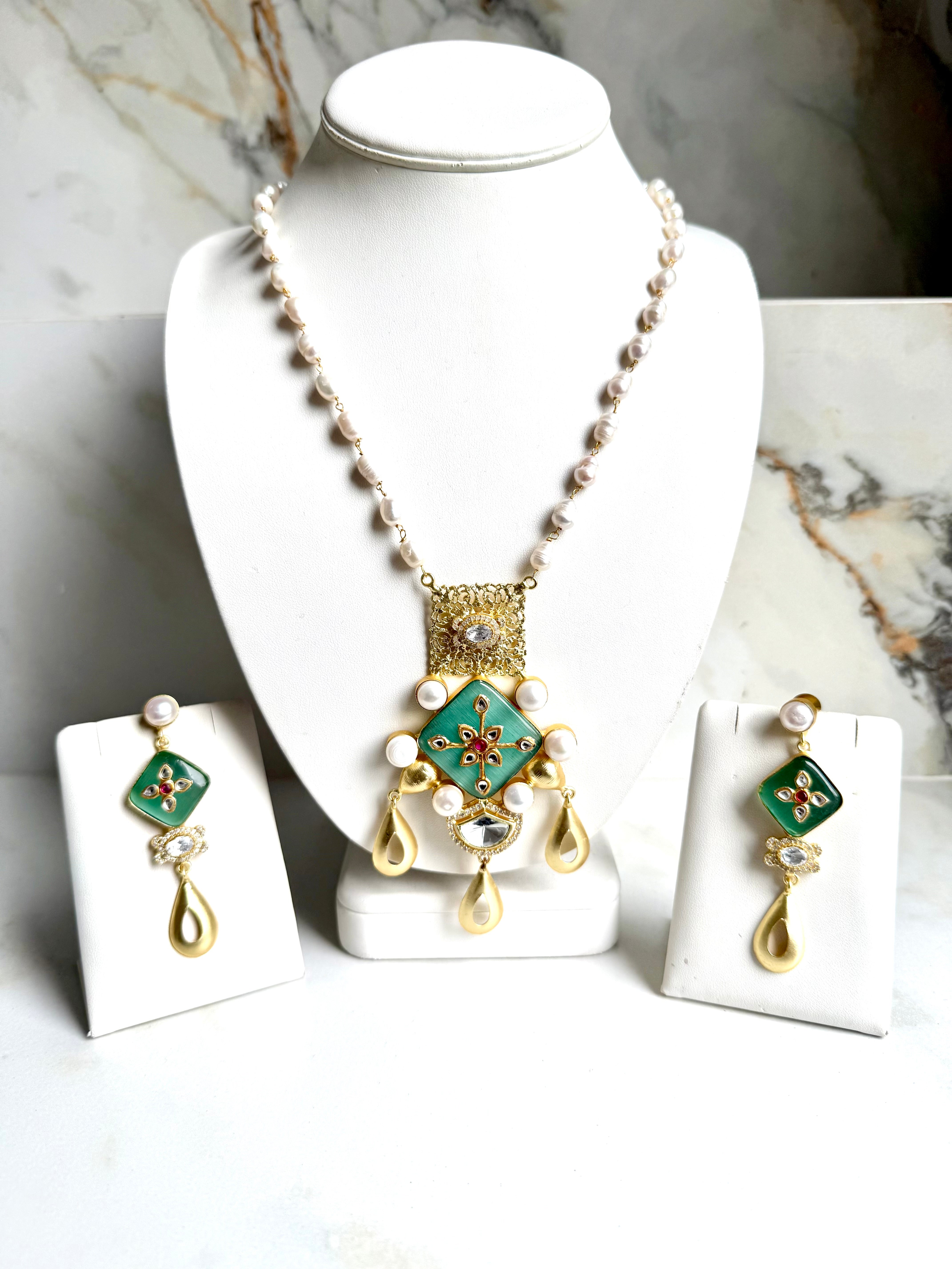 This elegant Filagree Polki Set features a stunning polki filagree mala design. Handcrafted with precision, this set exudes sophistication and timeless beauty. Perfect for special occasions or everyday wear, this set is sure to add a touch of elegance to any outfit. Elevate your jewelry collection with this exquisite Filagree Polki Set.