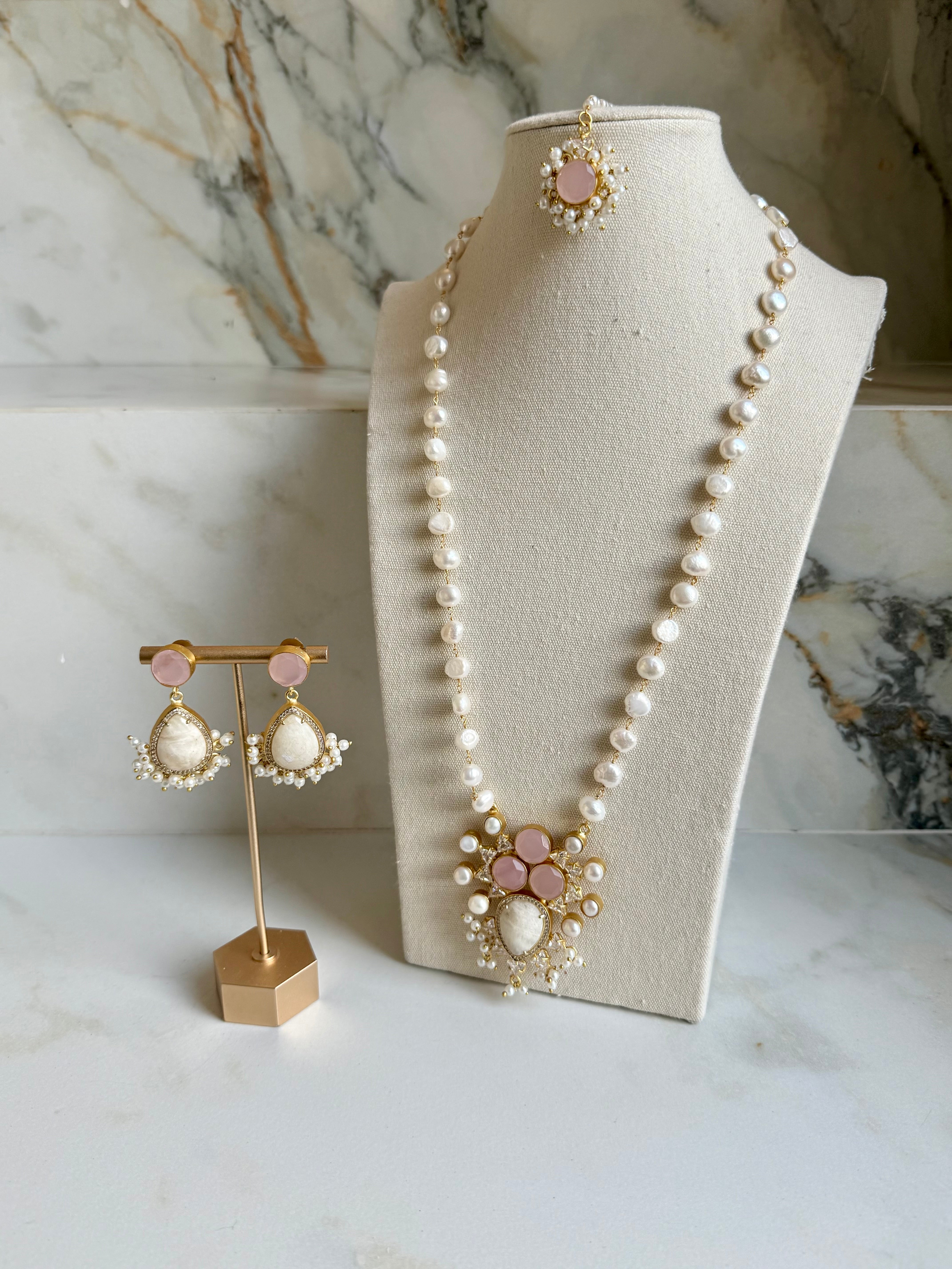 Introducing our stunning Pink Mala Set. Crafted with exquisite detail, this gorgeous set is perfect for any occasion. With its luxurious pink color and intricate design, it is sure to make you stand out. Made with high-quality materials, you'll feel as beautiful as you look. Elevate your style with our Pink Mala Set.