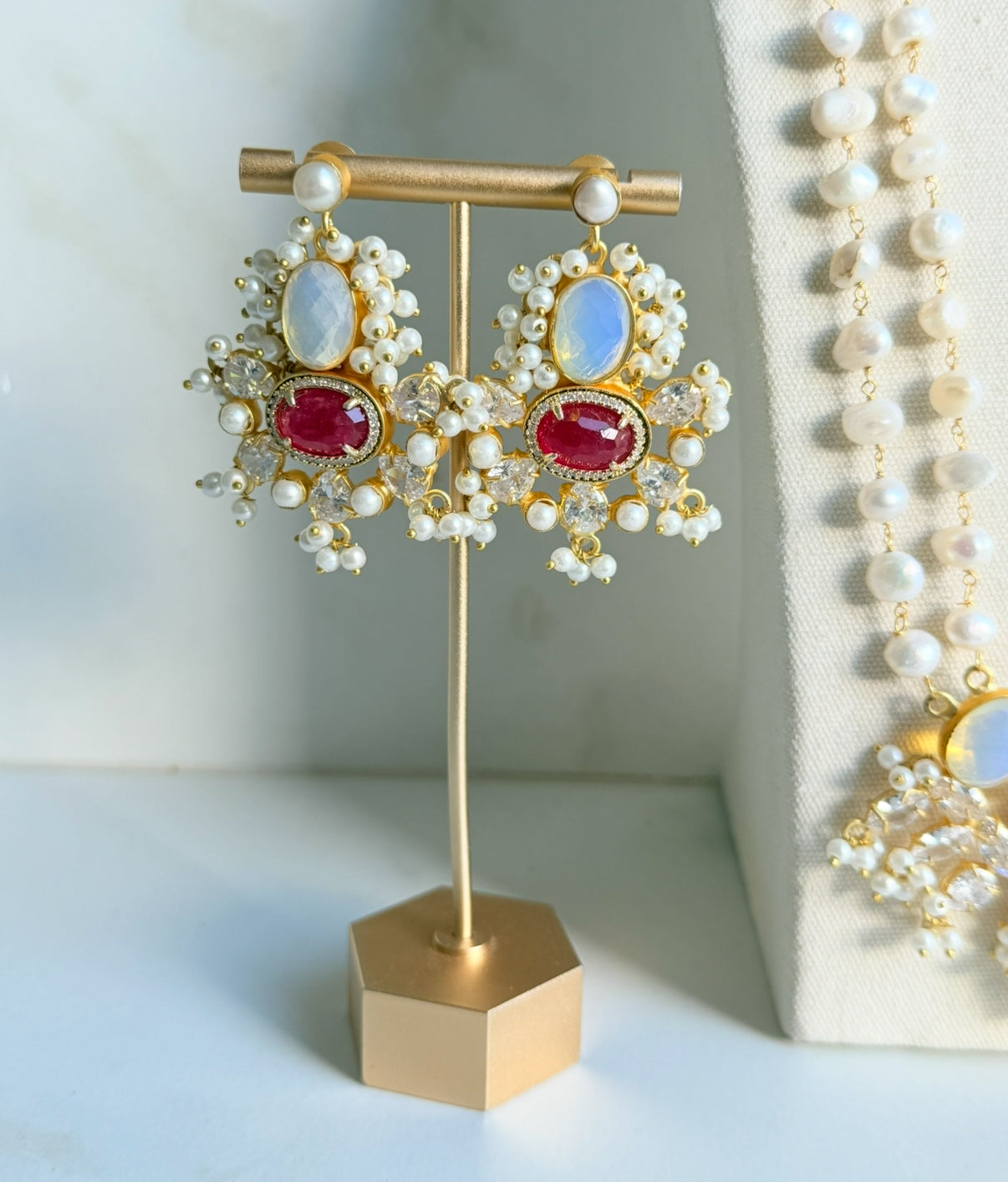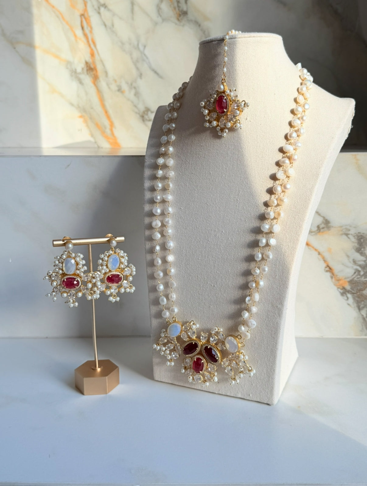 Handcrafted necklace set featuring deep red rubies, green emeralds, sparkling gemstones, and freshwater pearls in a gold-plated setting. Includes a statement necklace, matching earrings, and maang tikka. A luxurious Indian jewelry set perfect for brides, weddings, and festive occasions.