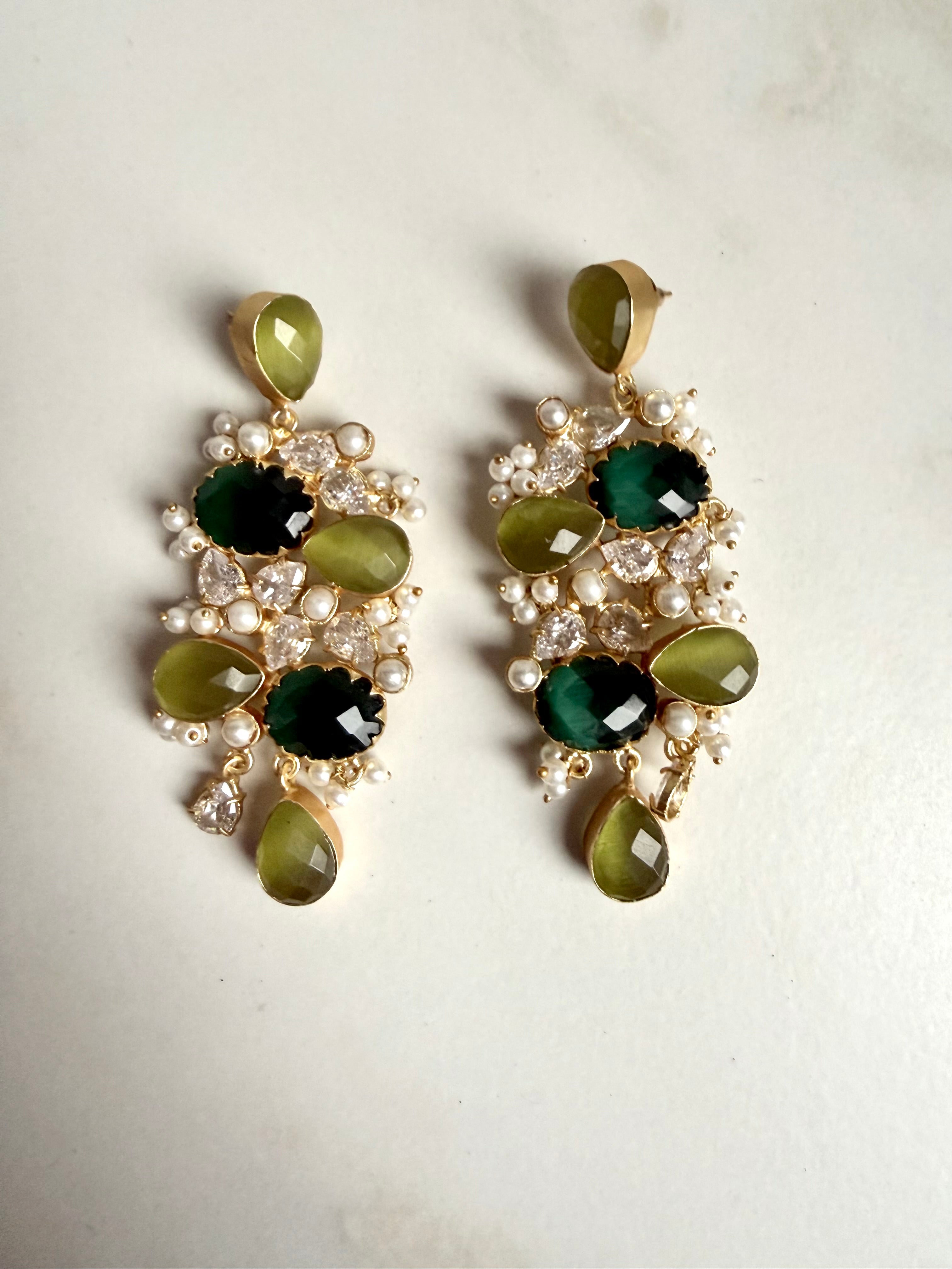 Adorn yourself with the colors of a lush Indian forest. These handcrafted statement earrings feature a sophisticated cluster of deep emerald and translucent olive stones, artfully woven with delicate white seed pearls and shimmering crystal accents.