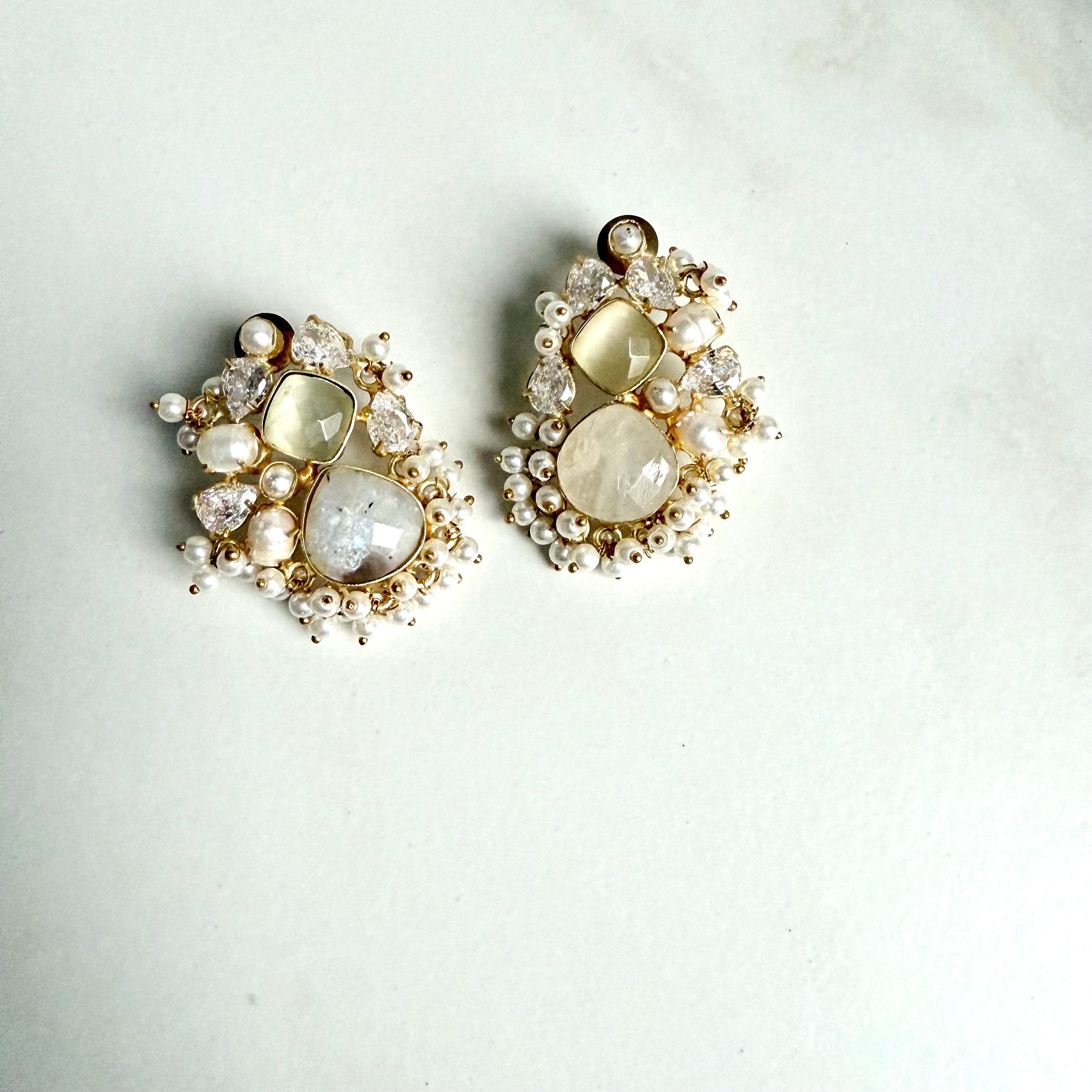 Brighten your look with these stunning White Gemstone Cluster Earrings, handcrafted with a Beautiful Crafted Gemstones. Each earring features a beautiful cluster of faceted gemstones surrounded by delicate handwoven pearls, creating a fresh and playful yet elegant design.