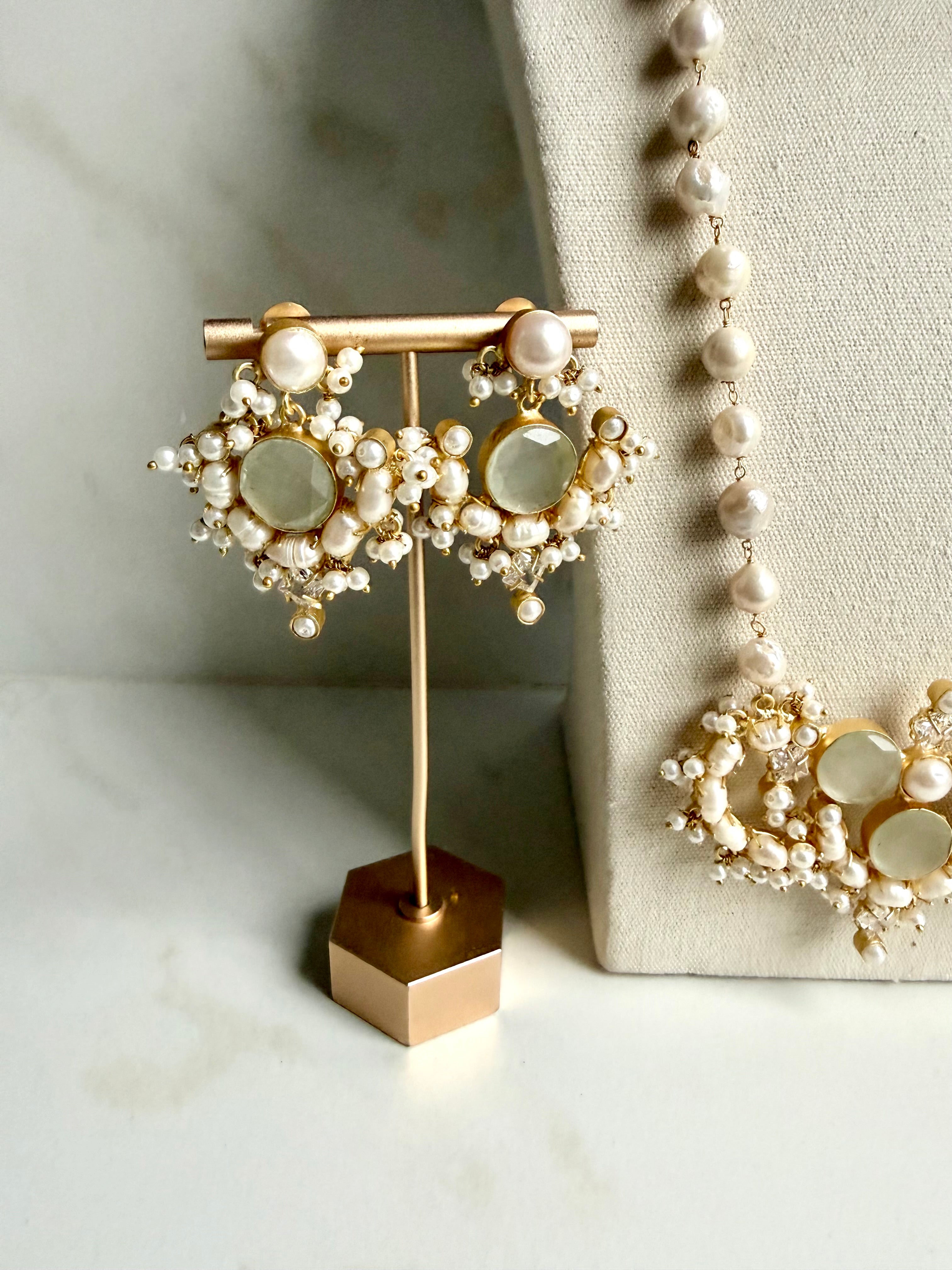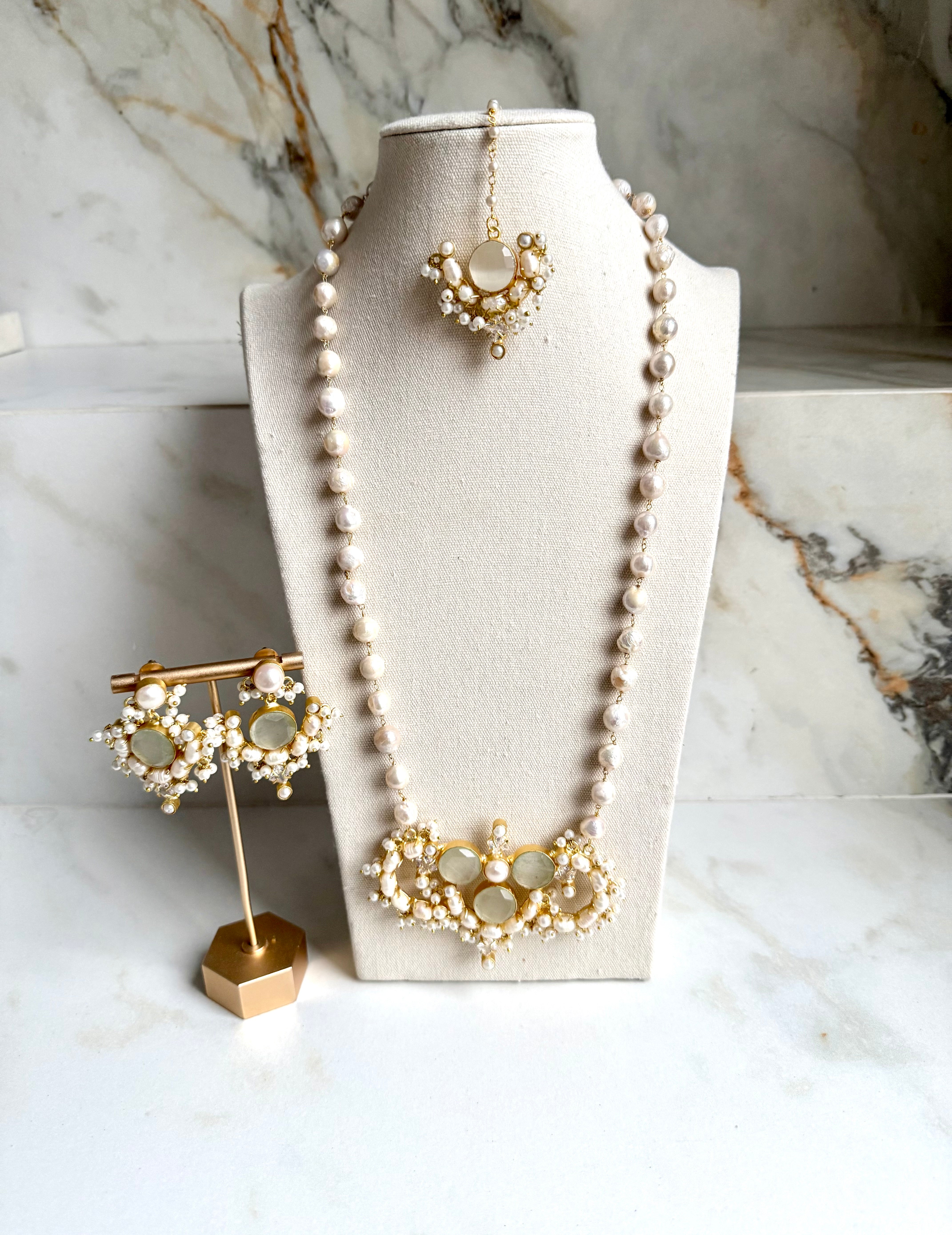 Bring a unique and luxurious finish to any look. The set includes earrings and features stunning, natural pearls with a beautiful luster. Perfect for special occasions, the set looks great with a variety of outfit styles, pair with a choker for a statement look.