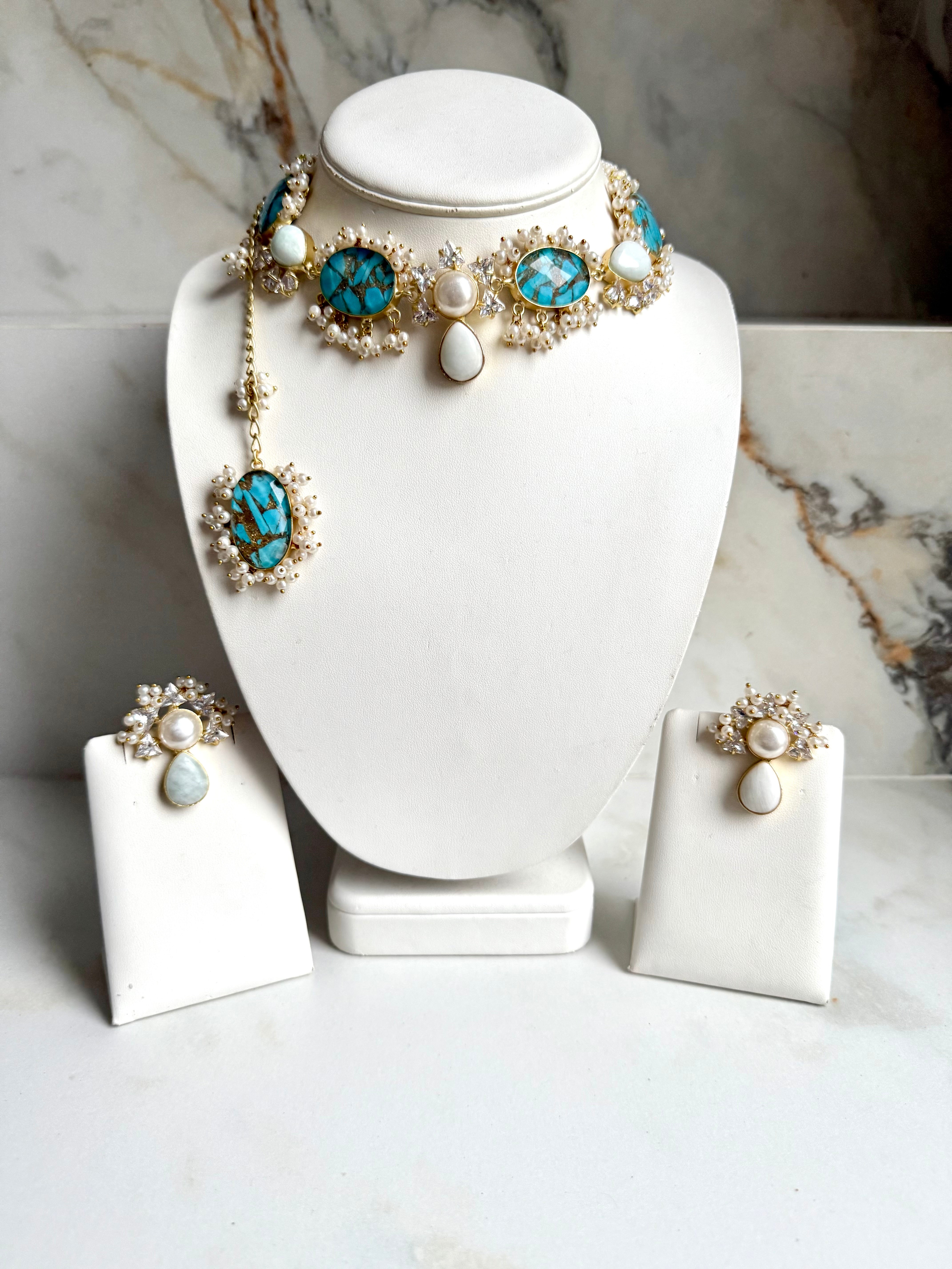 Introducing the Aqua Tara Pearl Choker Set, a serene fusion of aqua turquoise stones, classic pearls, and intricate handcrafted detailing. Each element is thoughtfully designed to create a refined, royal look. The matching earrings complement the choker with pearl-centred elegance, making this set a timeless addition to your jewelry collection