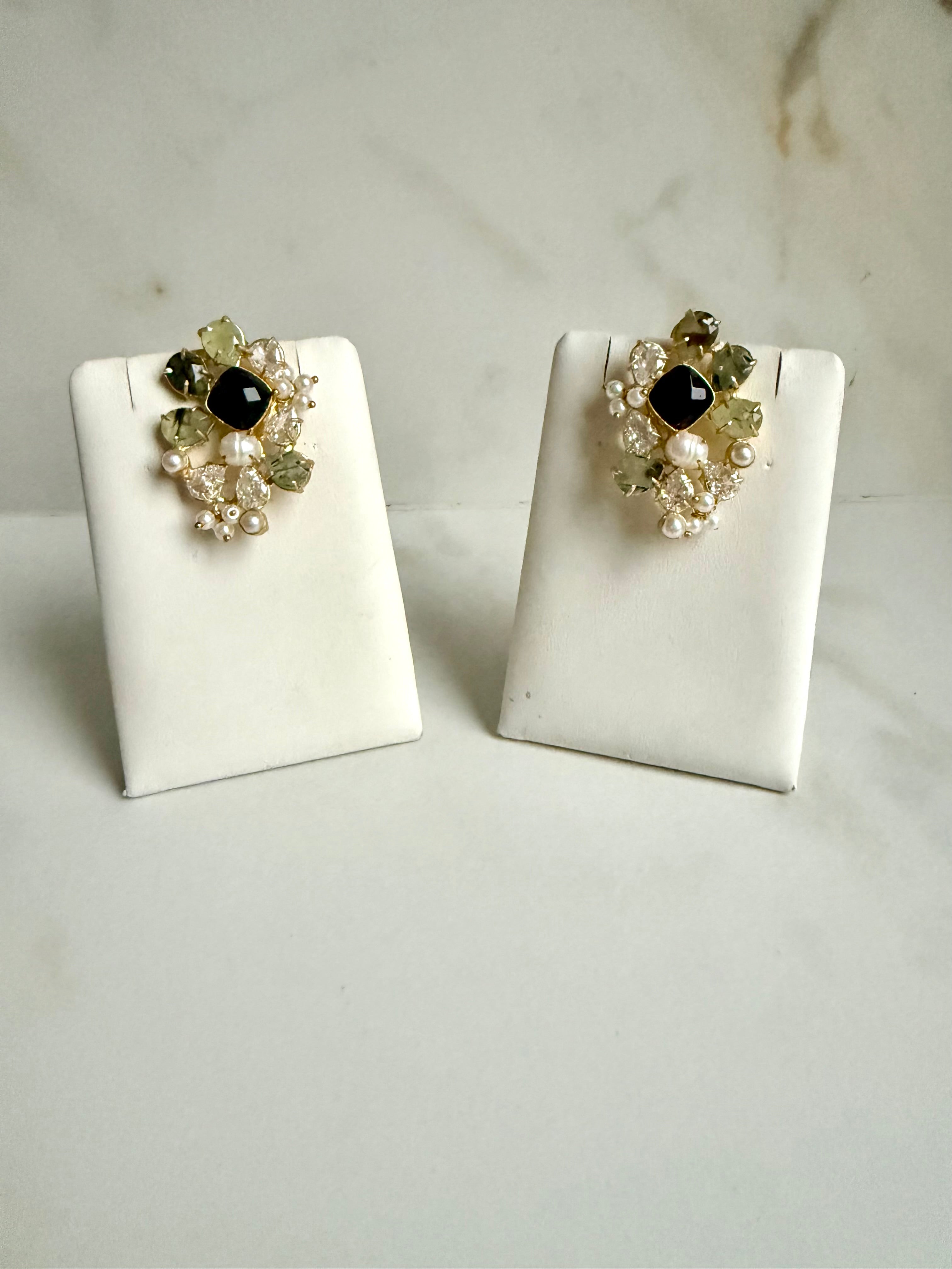Introducing our Black Onyx & Crystal Cluster Stud Earrings, the perfect addition to your elegant jewelry collection. These bold and luxurious handmade earrings feature a jet-black central stone surrounded by shining crystals and pearls, creating a monochrome cluster design that will elevate any evening or formal look. Timeless and classy, these earrings are a must-have for every fashion-forward individual.