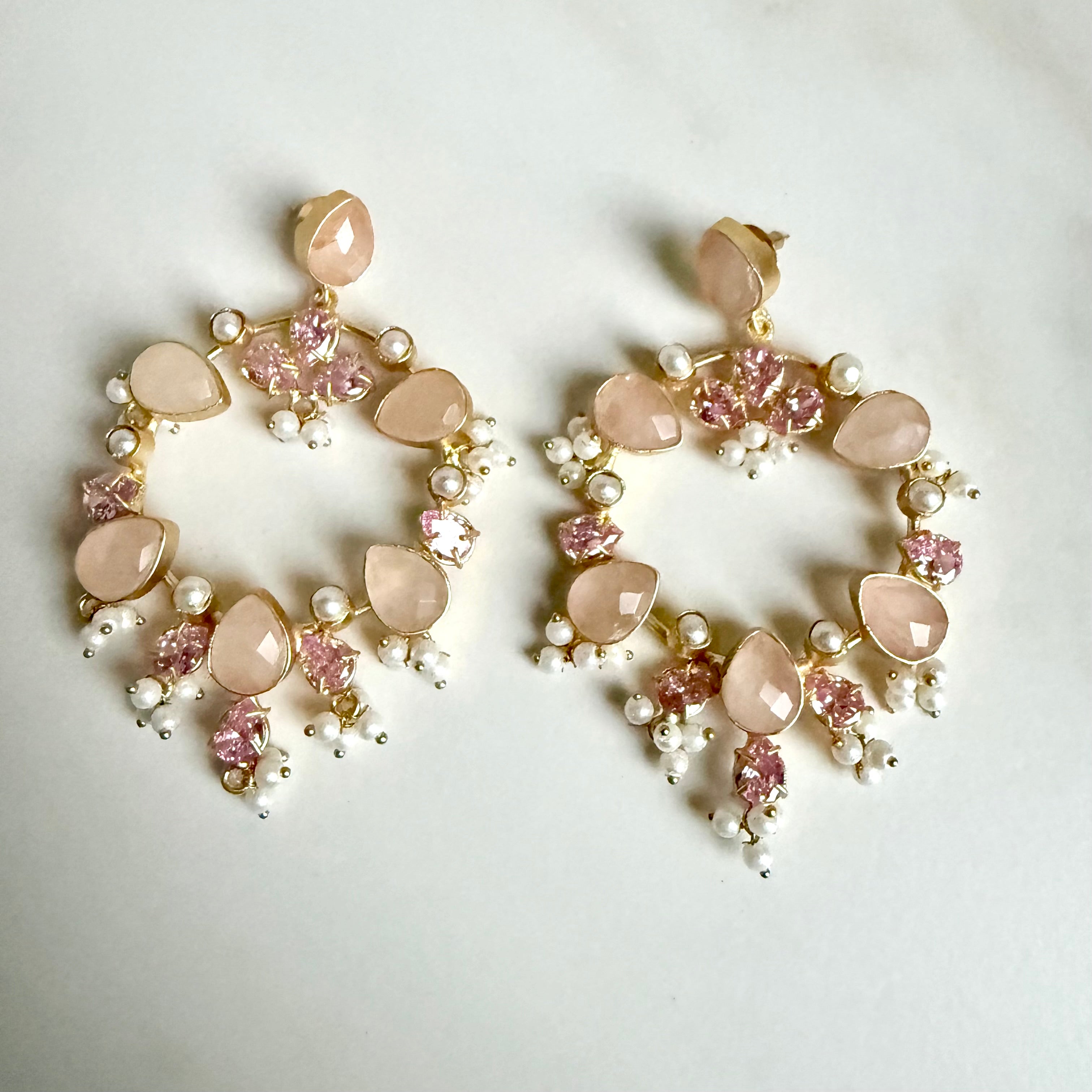 Soft blush pink gemstones paired with shimmering crystals and pearls. Feminine, luxurious, and perfect for special occasions, gifting, or bridal bridesmaids jewellery.