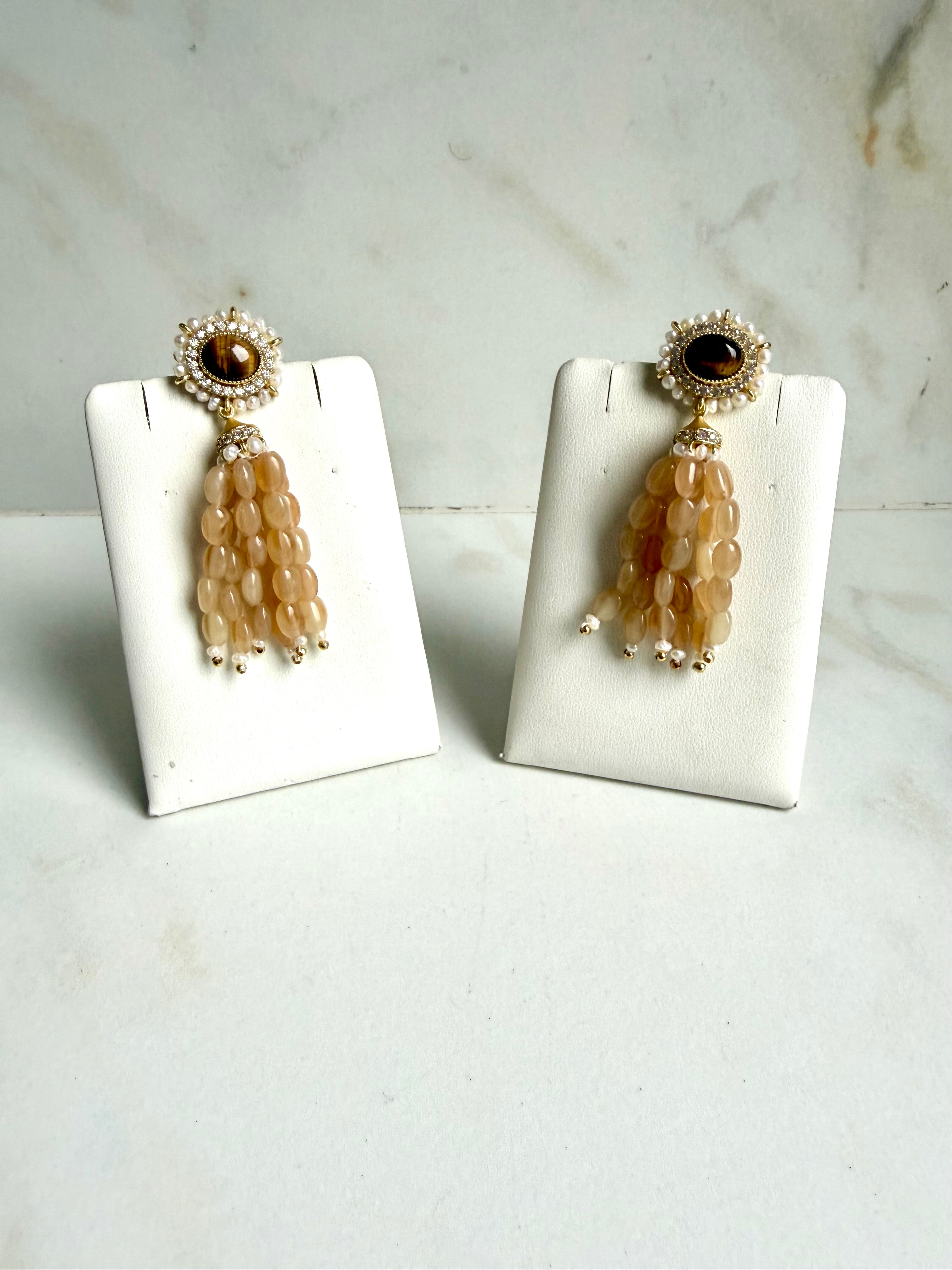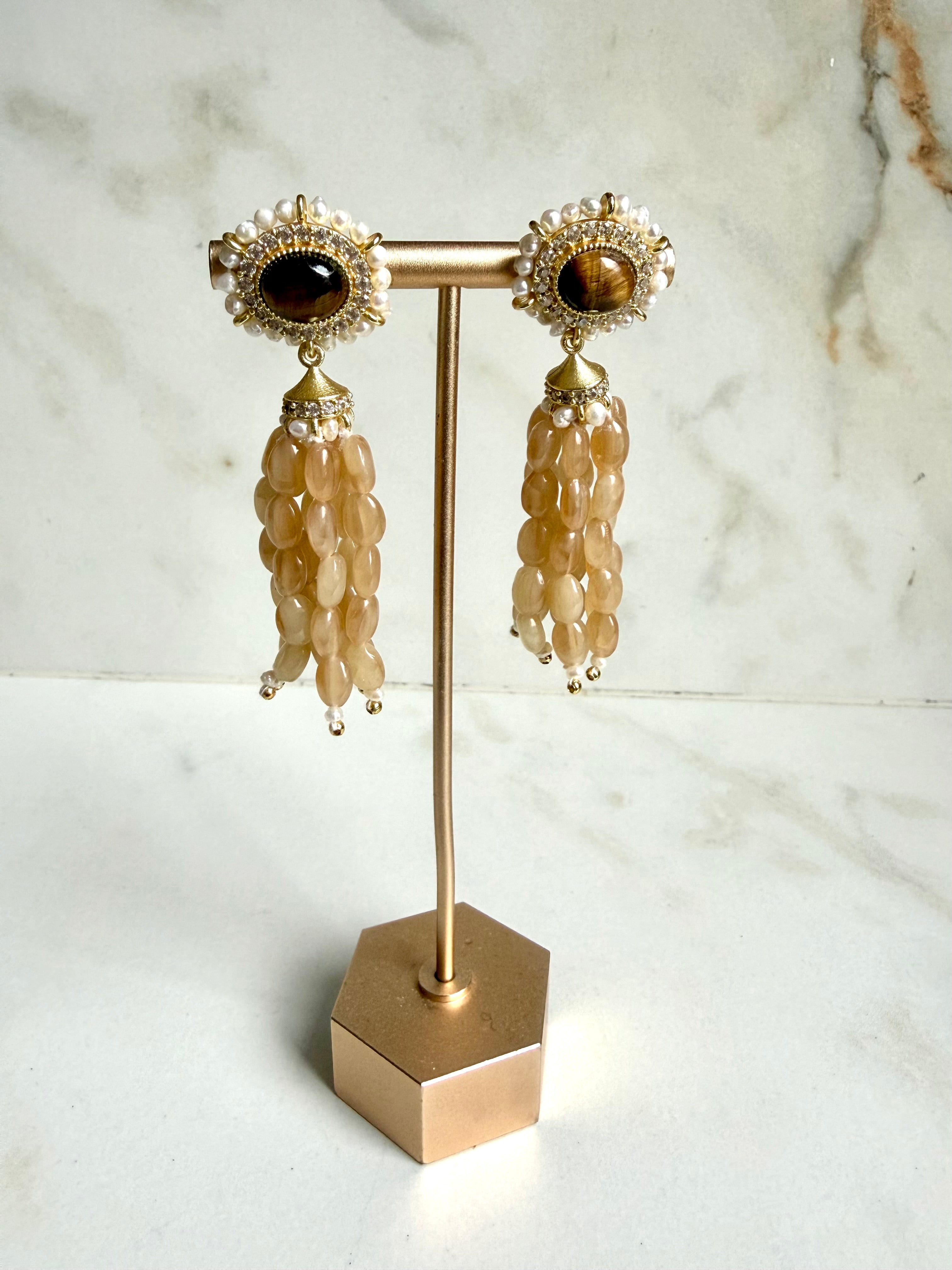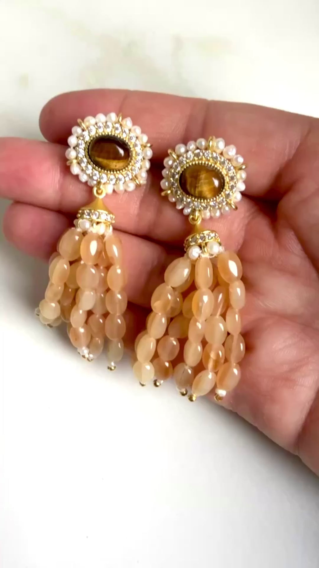 A graceful blend of elegance and playfulness, the Blush Cascade Polki Drops feature a delicate polki-style stud crowned with a soft mint-green stone, encircled by fine pearls. Flowing below is a dreamy cascade of faceted bead drops that add movement, charm, and a hint of romance to every look.