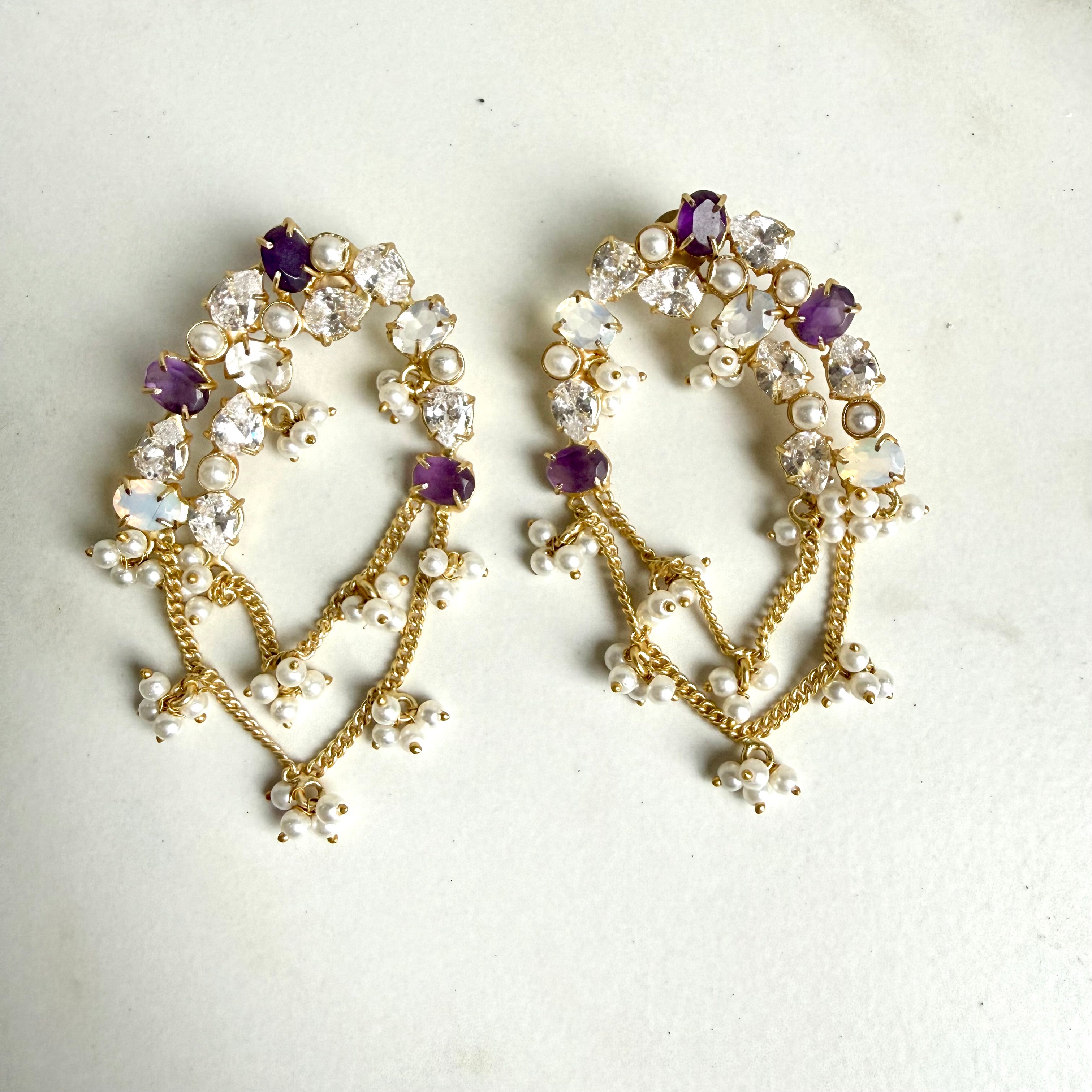 Elegant and contemporary, these statement earrings feature a delicate crescent-shaped arrangement of sparkling crystals, soft green stones, and luminous pearls set in a gold-tone base. The design is elevated with graceful cascading chains adorned with tiny pearl clusters, creating gentle movement and a luxurious finish. Perfect for weddings, festive occasions, or evening events, these earrings blend modern glamour with classic pearl detailing for a sophisticated look.