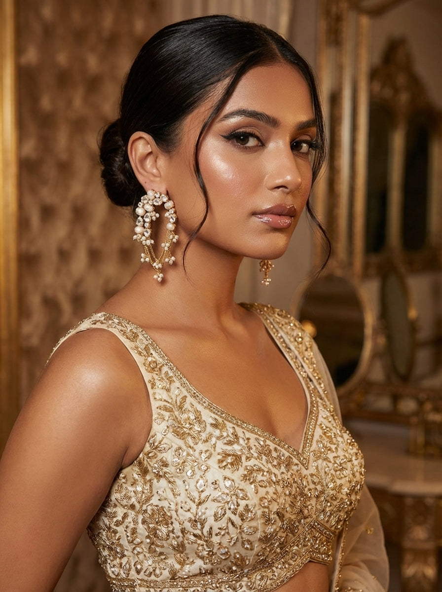 Elegant and contemporary, these statement earrings feature a delicate crescent-shaped arrangement of sparkling crystals, soft green stones, and luminous pearls set in a gold-tone base. The design is elevated with graceful cascading chains adorned with tiny pearl clusters, creating gentle movement and a luxurious finish. Perfect for weddings, festive occasions, or evening events, these earrings blend modern glamour with classic pearl detailing for a sophisticated look.