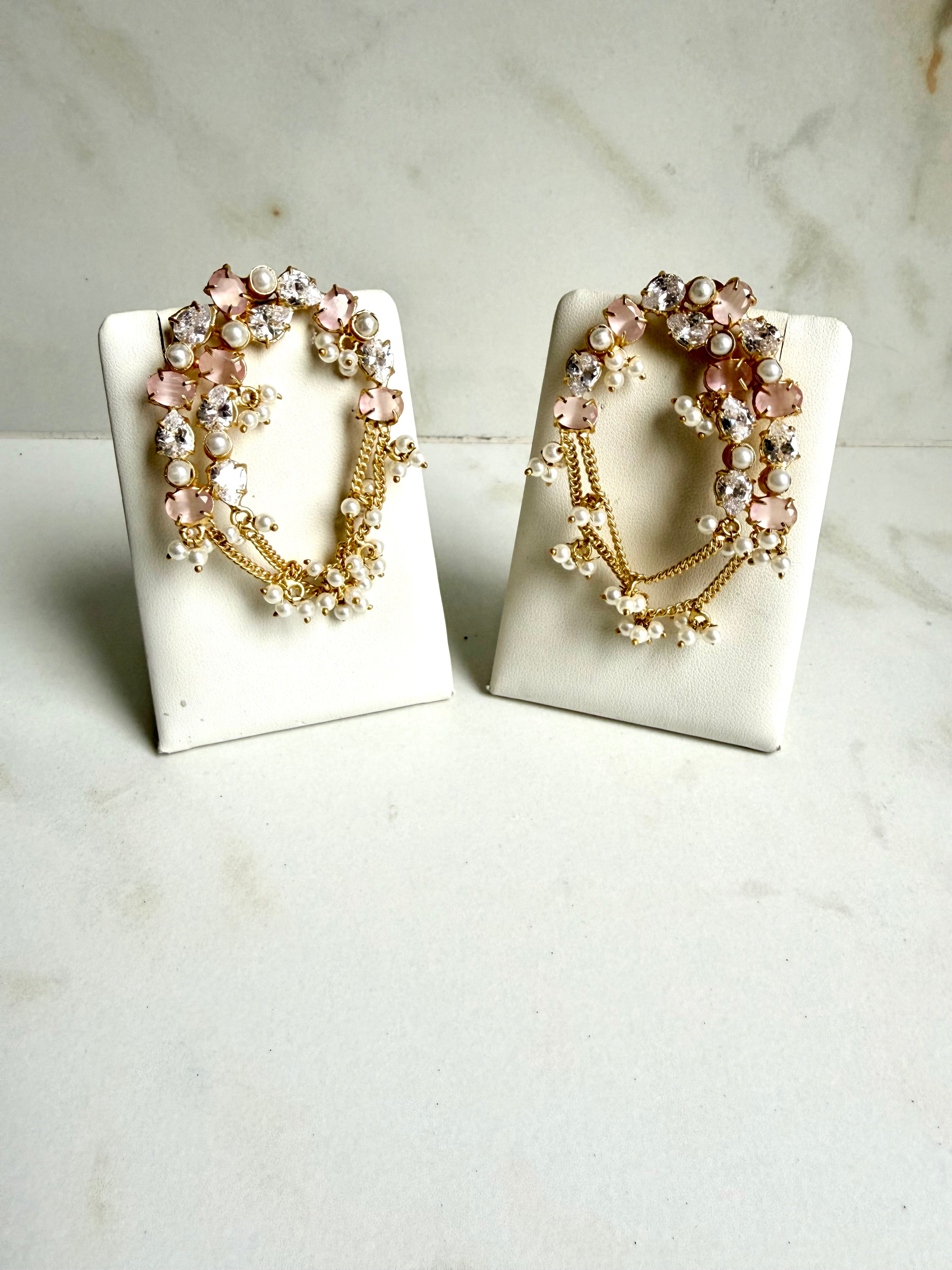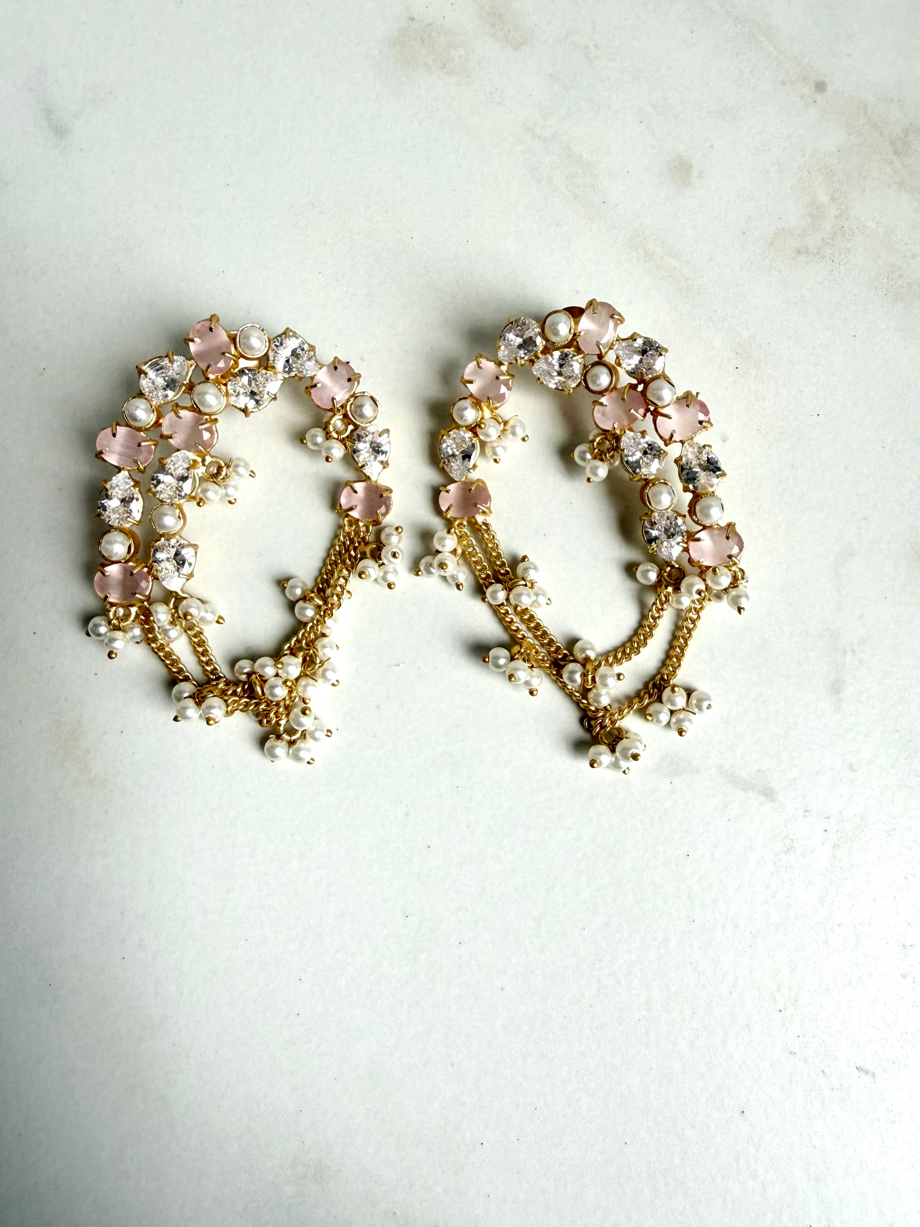 Elegant and contemporary, these statement earrings feature a delicate crescent-shaped arrangement of sparkling crystals, soft green stones, and luminous pearls set in a gold-tone base. The design is elevated with graceful cascading chains adorned with tiny pearl clusters, creating gentle movement and a luxurious finish. Perfect for weddings, festive occasions, or evening events, these earrings blend modern glamour with classic pearl detailing for a sophisticated look.