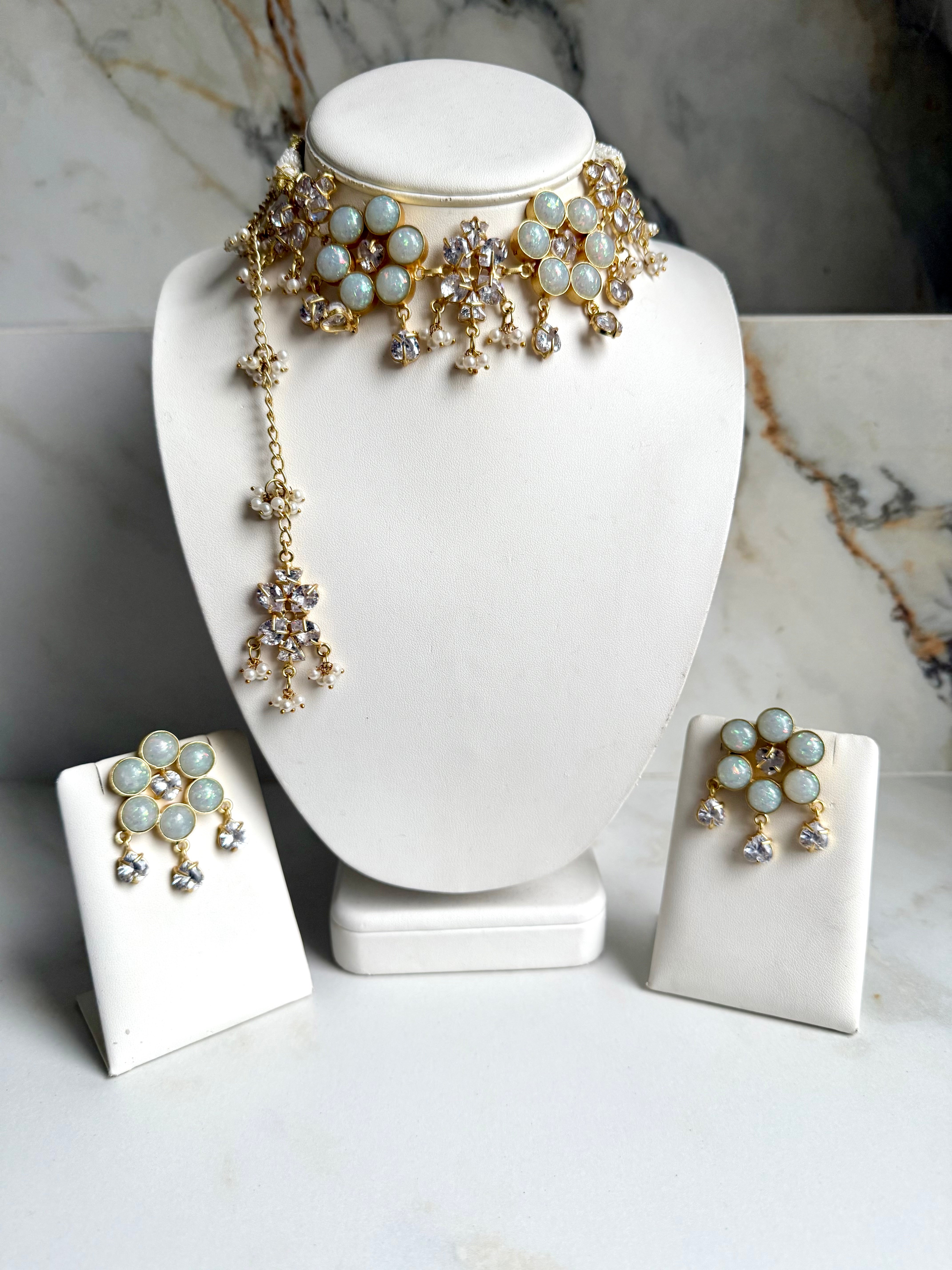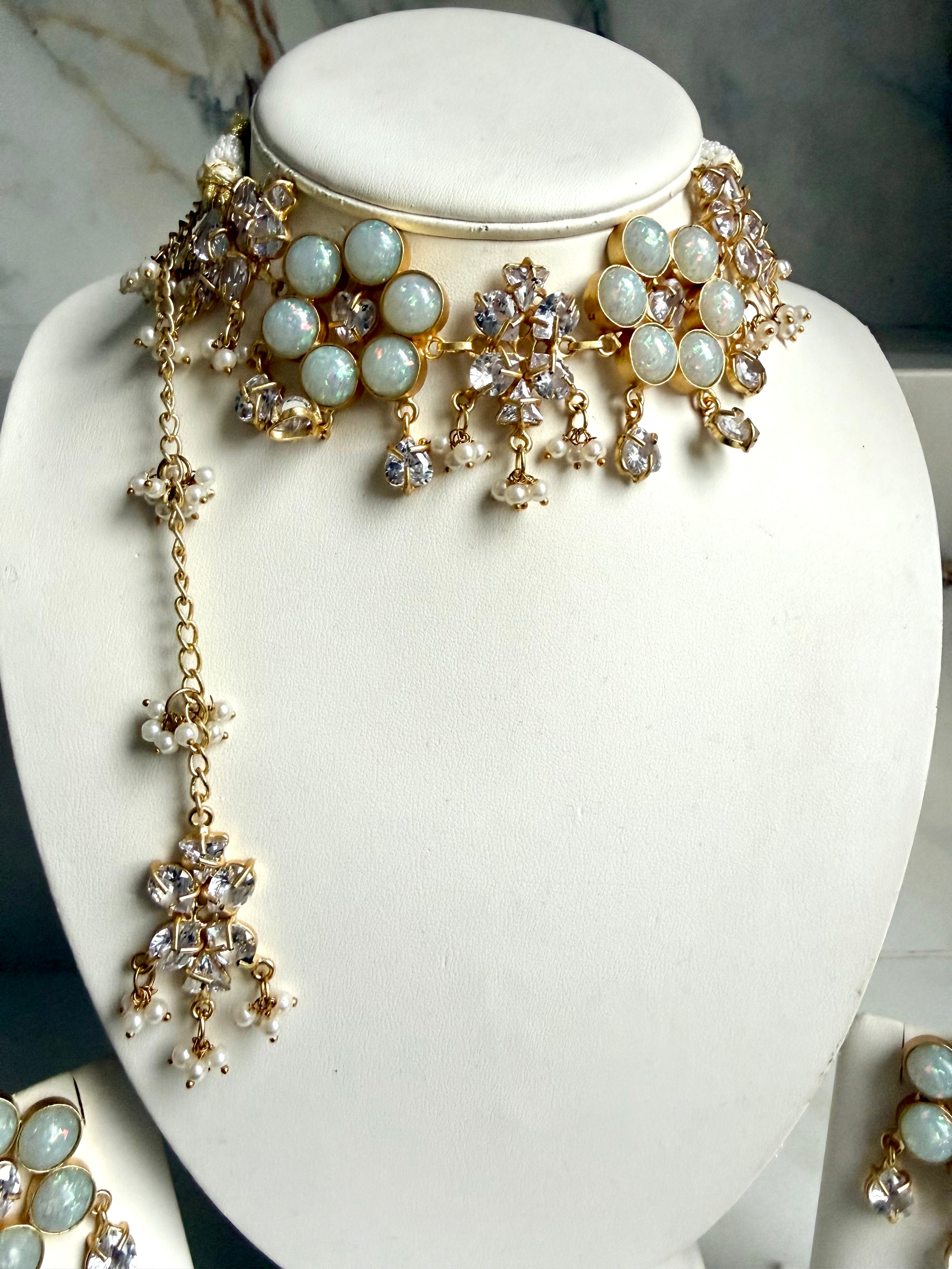 delicate celebration of femininity, the Gulnaar Pink Blossom Choker Set features soft mint stones arranged,framed with sparkling kundan accents and finished with dainty pearl drops. The handcrafted choker sits gracefully on the neckline, paired with matching floral earrings and a coordinated side tassel for a traditional yet refined look.