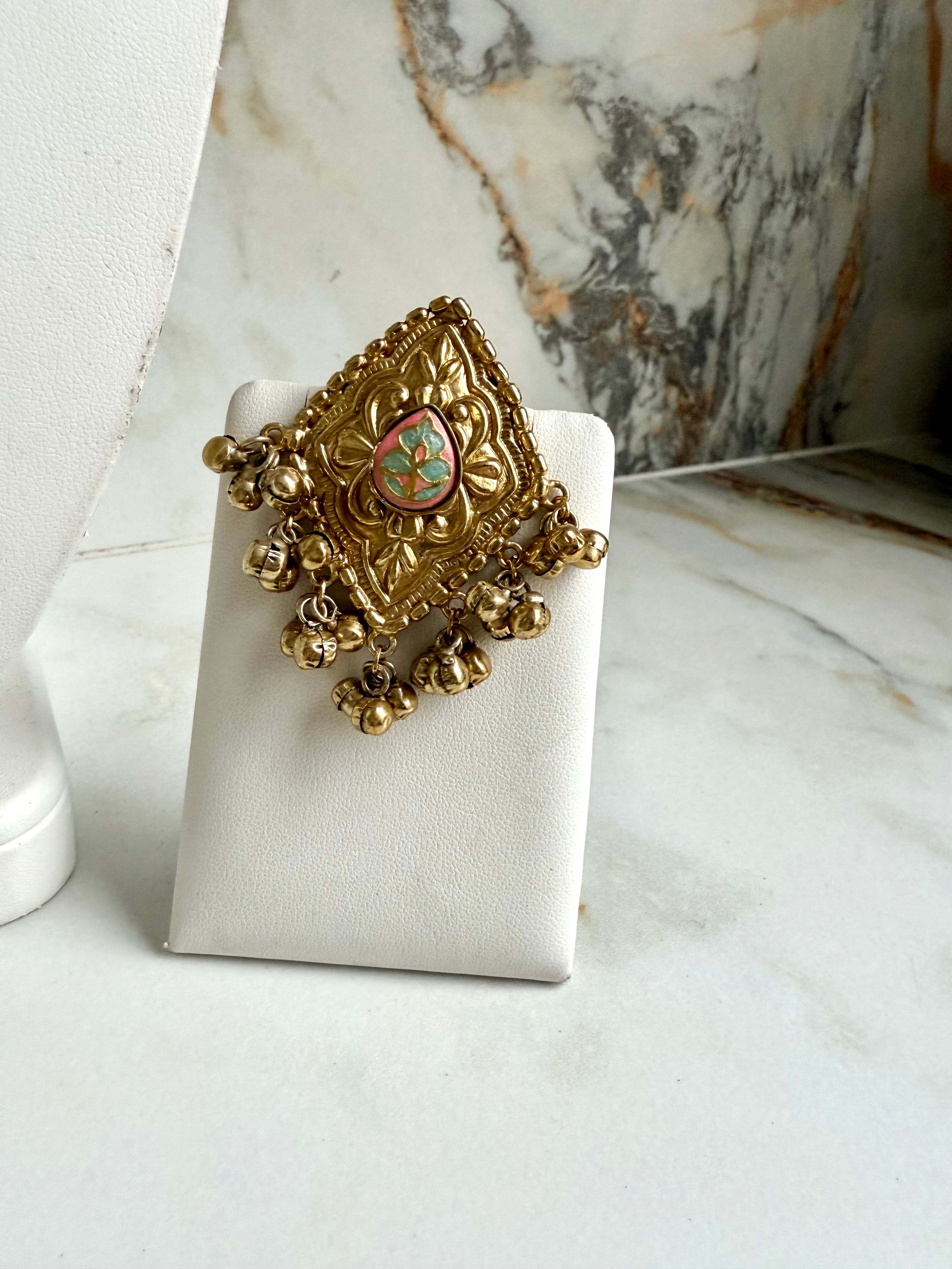 Experience luxury with the Heera Green Set. This regal set boasts stunning gold beads that create a beautiful ring with movement. Elevate any outfit with this elegant and timeless piece.
