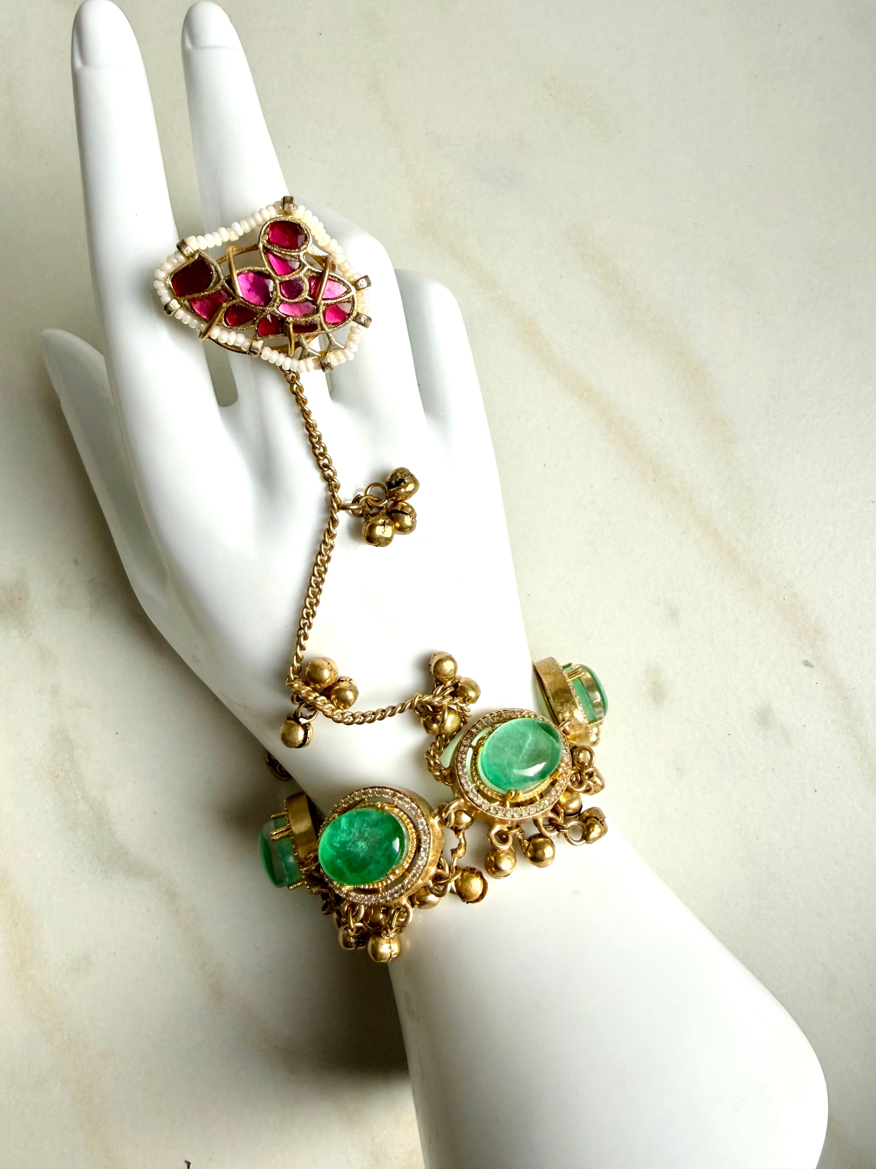 Heera Haathpool showcases intricate designs complemented by small bells, enhancing both aesthetic appeal and auditory charm. The delicate craftsmanship adds elegance to any ensemble, making it a versatile accessory for various occasions. The bells contribute a subtle sound,