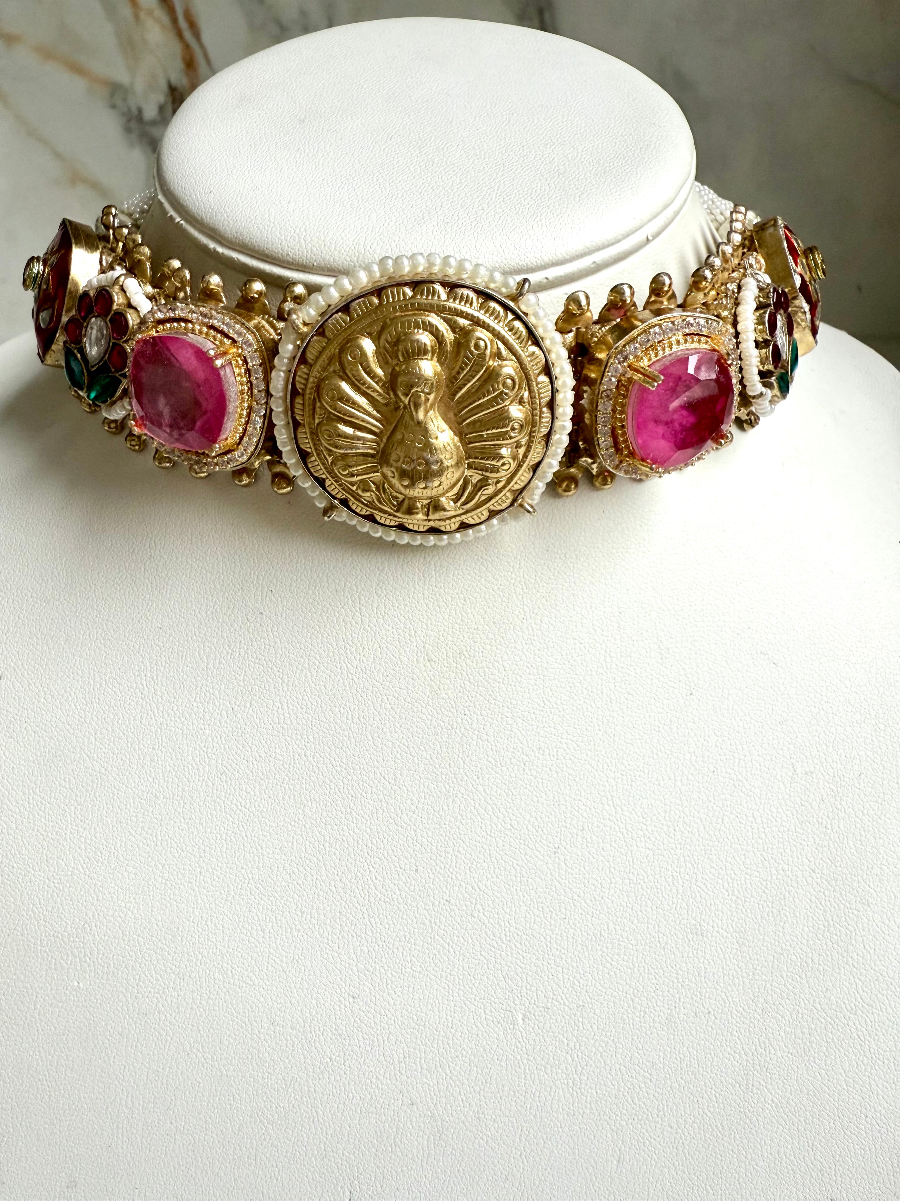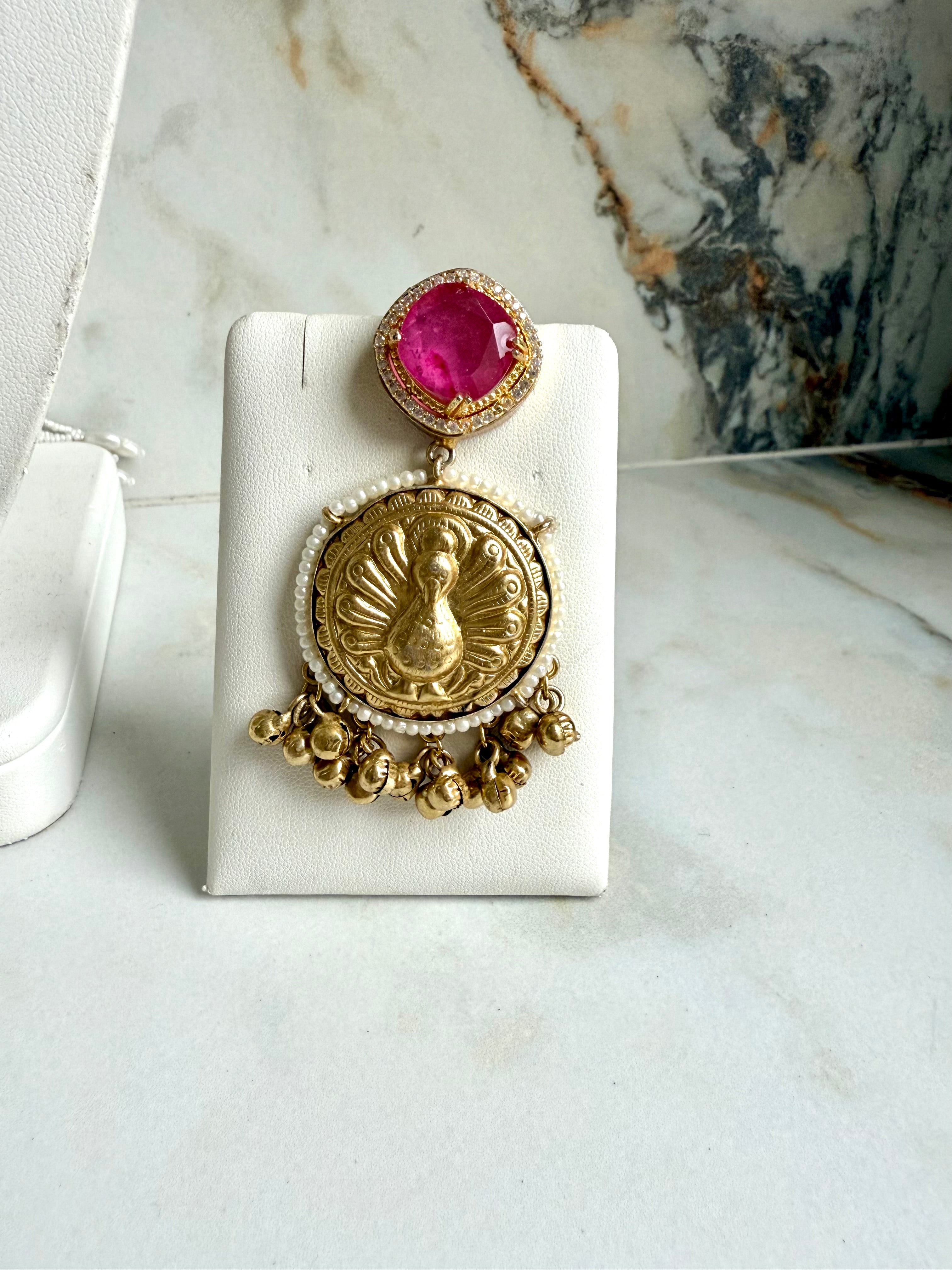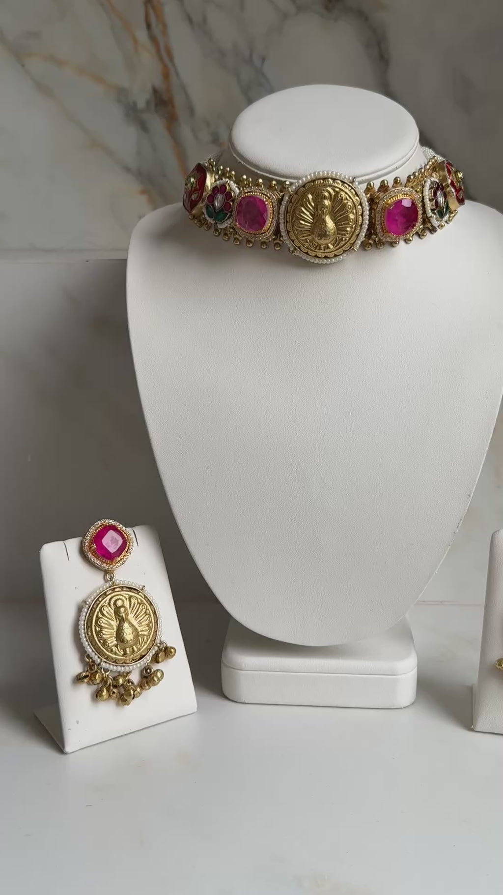 Experience luxury with the Heera Hot Pink Set. This regal set boasts stunning gold beads that create a beautiful ring with movement. Elevate any outfit with this elegant and timeless piece.