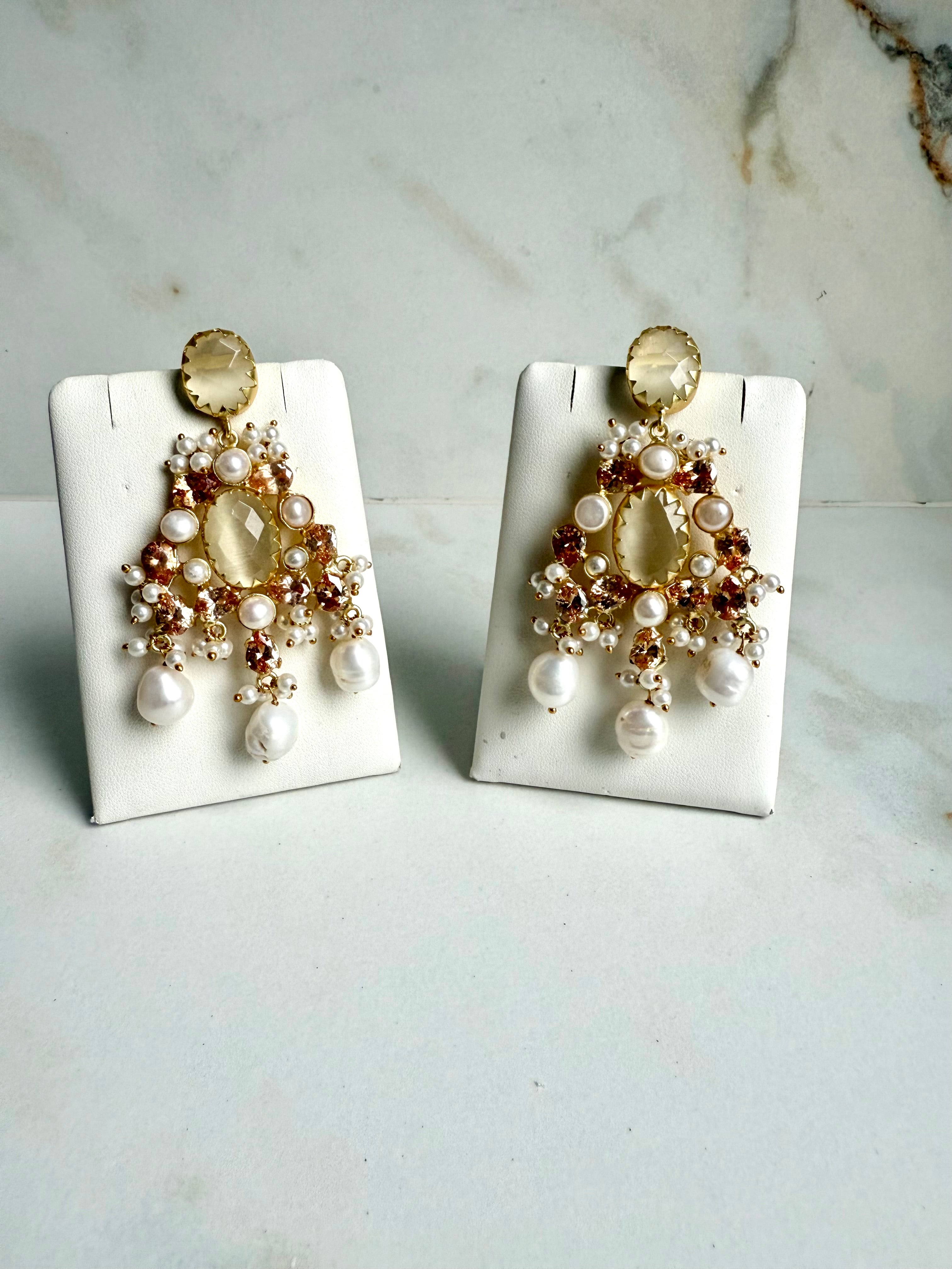 Designed with soft lemon quartz and honey-toned crystals, finished with freshwater pearls. These earrings bring a bright, refreshing glow and work beautifully with summer weddings, pastel outfits, and daytime events.