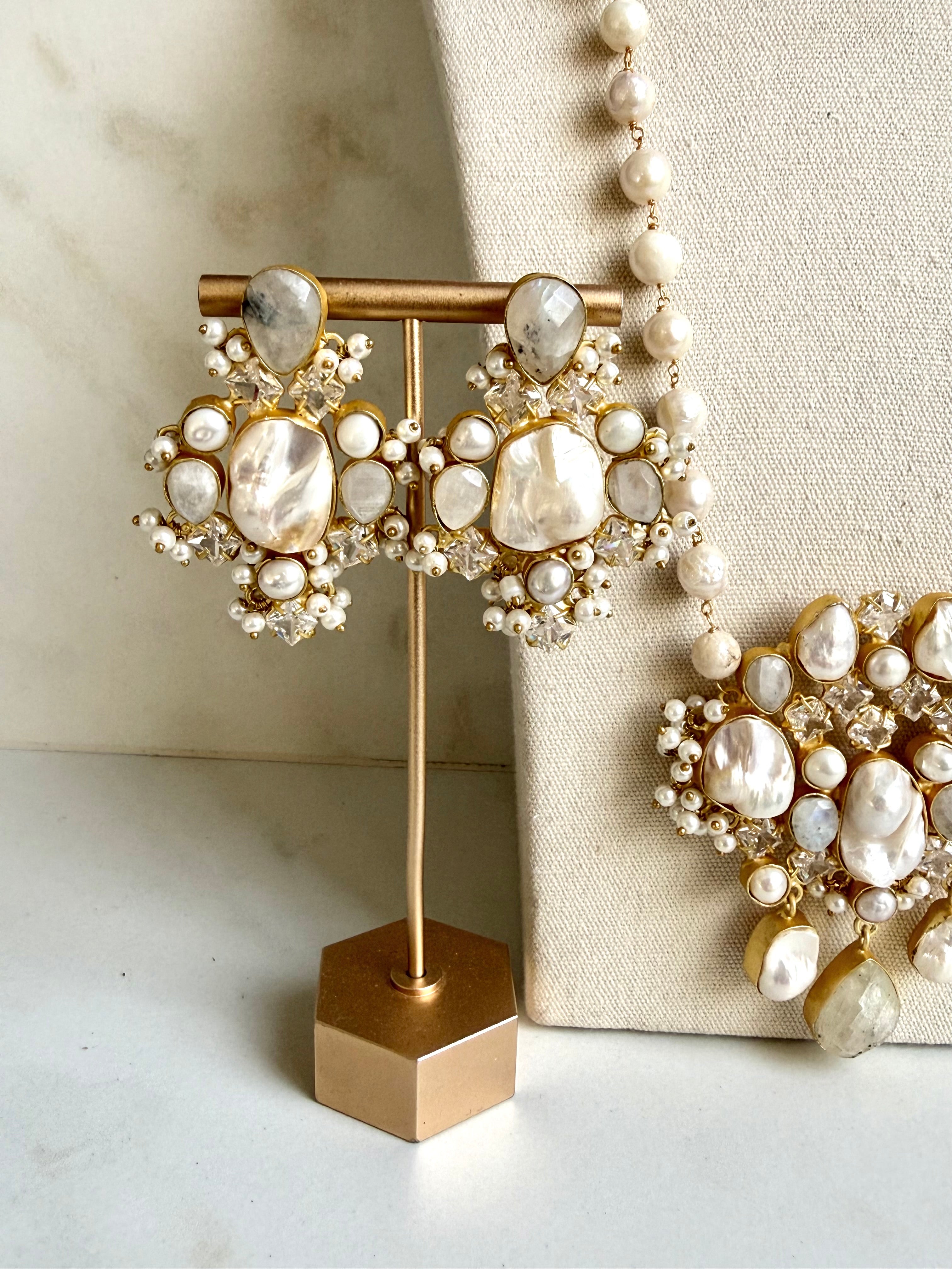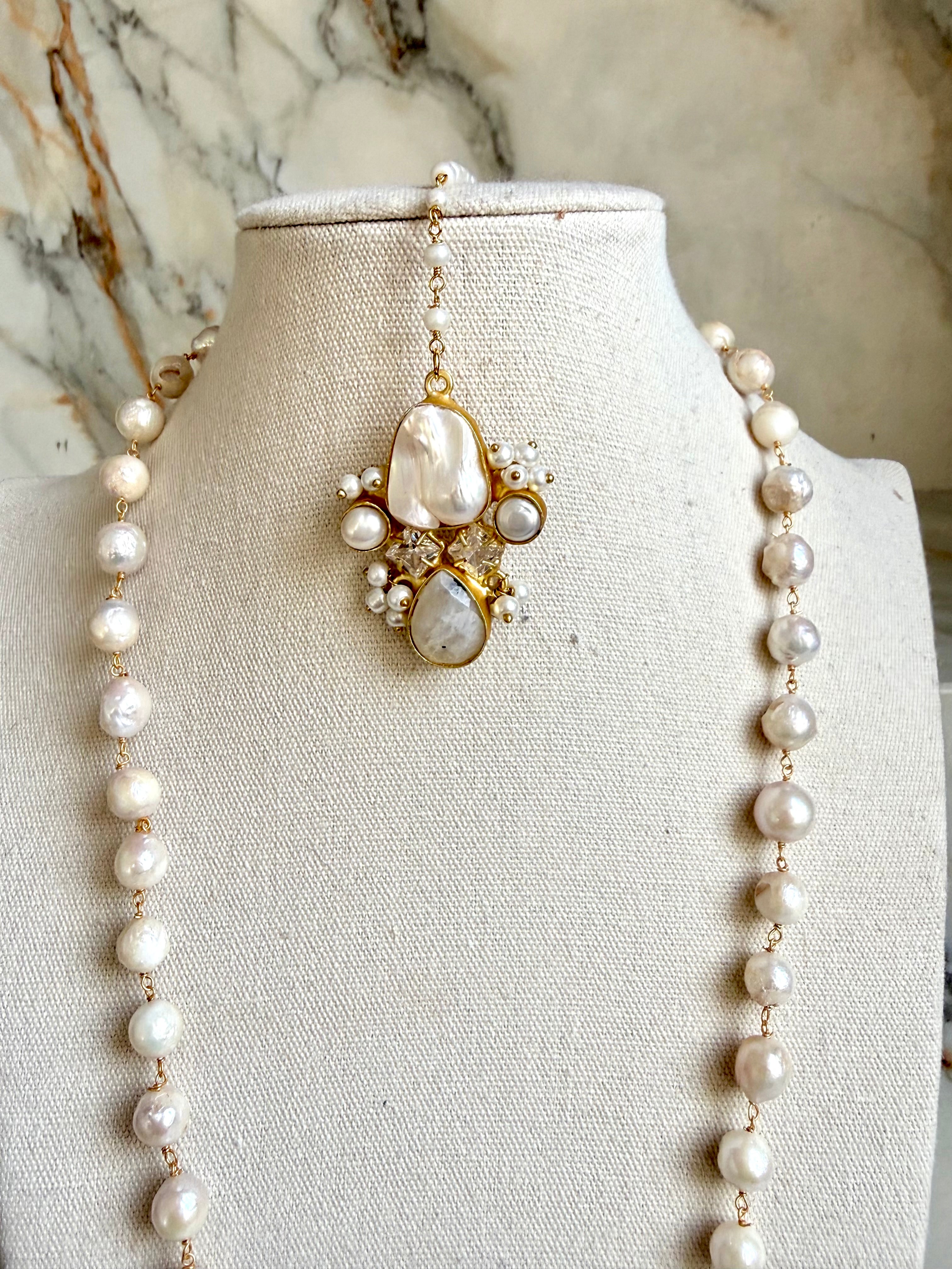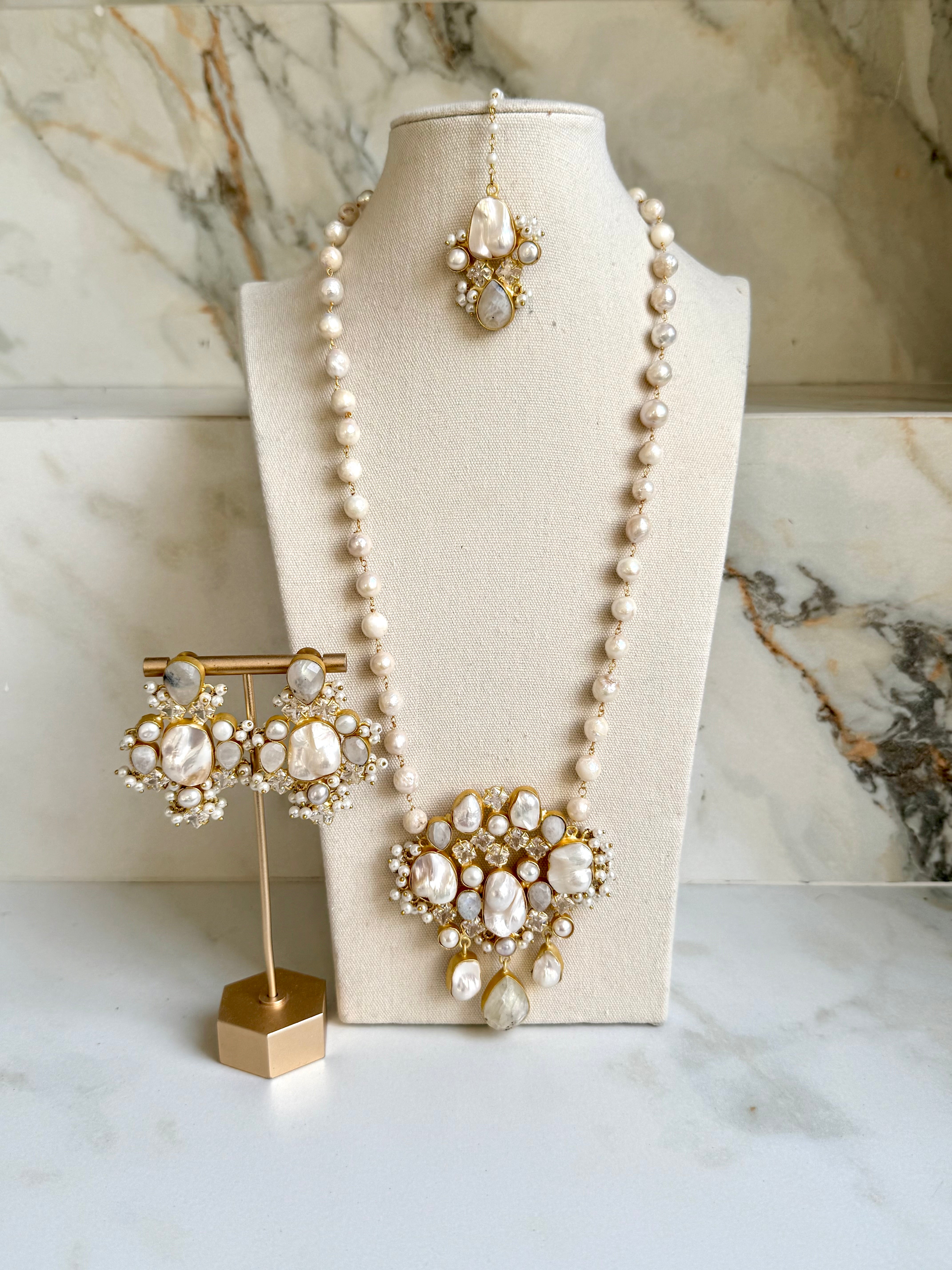 Introducing the Mala Set, a stunning and contemporary pearl necklace and bracelet set. Made with high-quality pearls, this set exudes elegance and sophistication. Elevate any outfit with this gorgeous accessory.