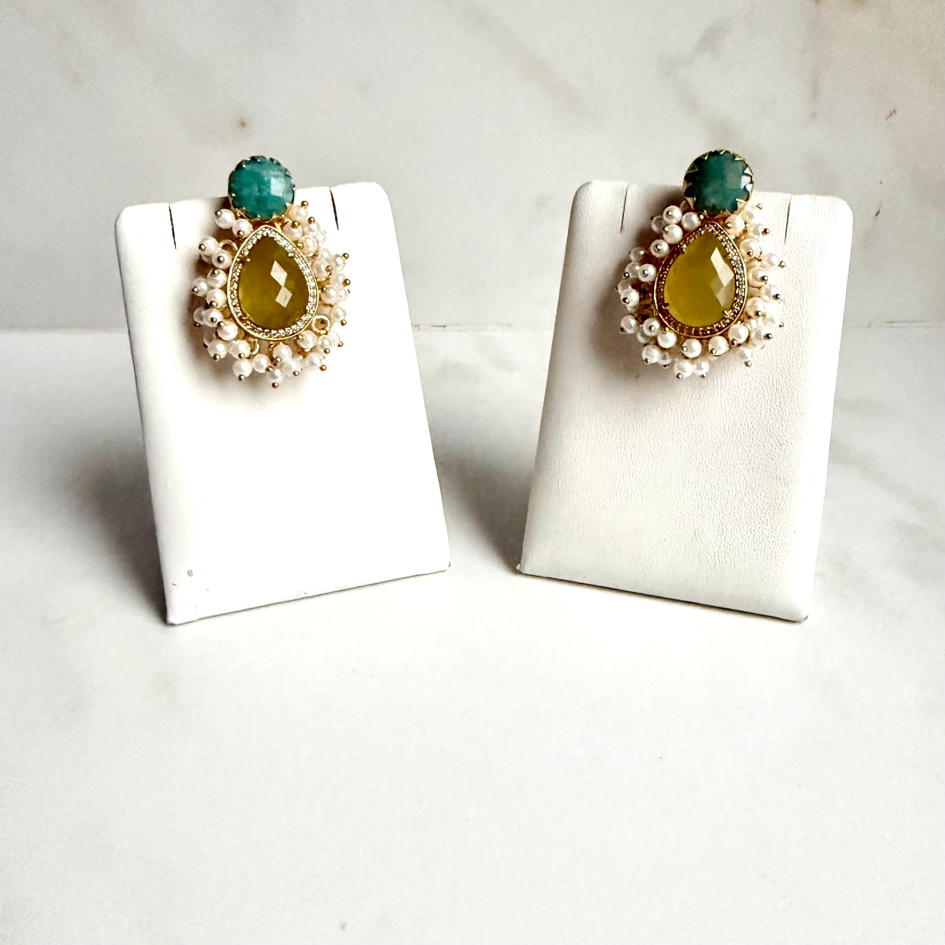 These Mint and Yellow Gemstone Pearl Cluster Earrings combine a bright yellow teardrop gemstone with CZ accents and fine pearl beading, paired with a fresh mint-green stud top. Ideal for haldi ceremonies, daytime events, summer weddings, and light festive outfits.