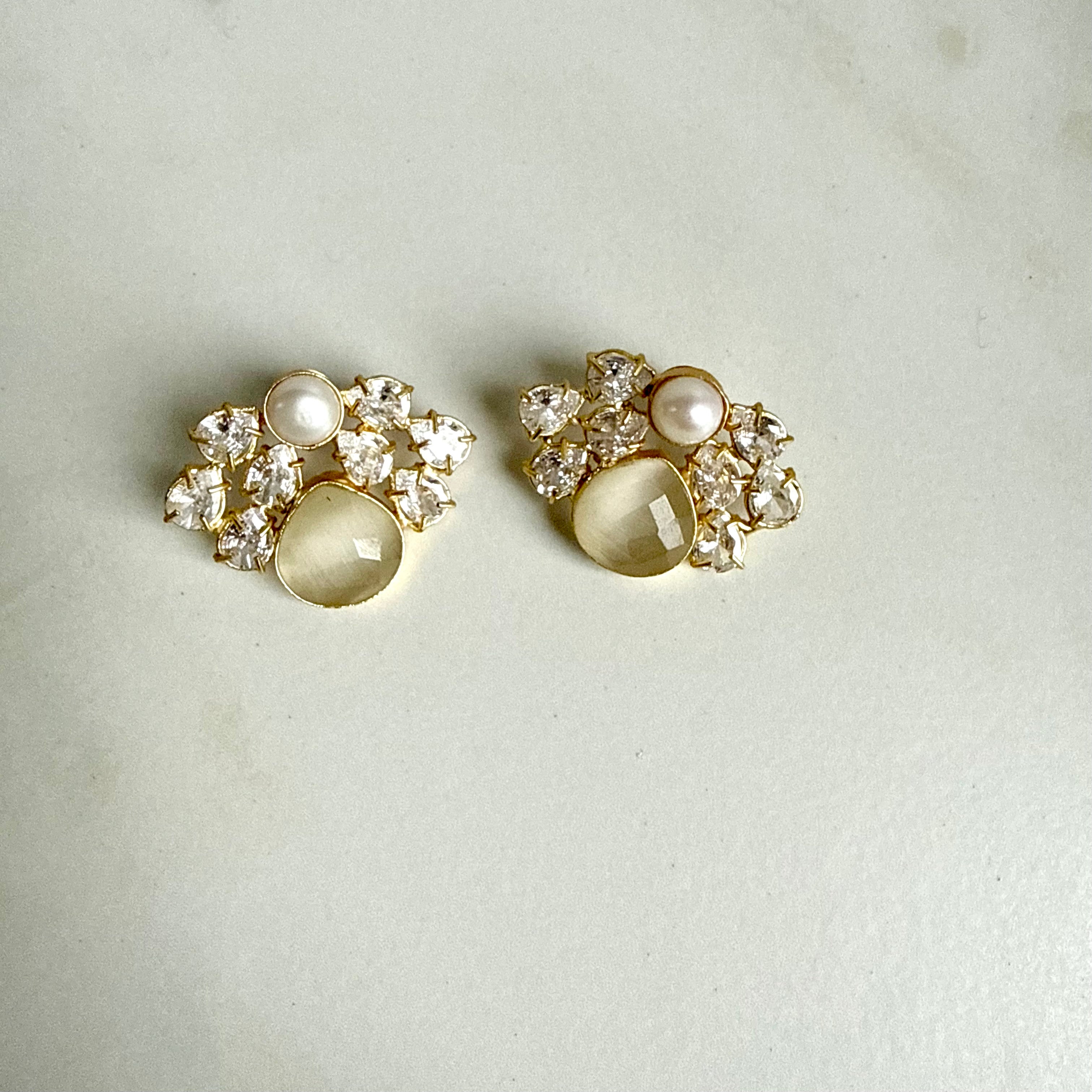 Elegant and timeless, these cluster stud earrings feature a beautifully faceted colored stone paired with a luminous pearl accent. Surrounded by sparkling crystal-like stones and set in a warm gold-tone finish, the design blends classic charm with modern sophistication.