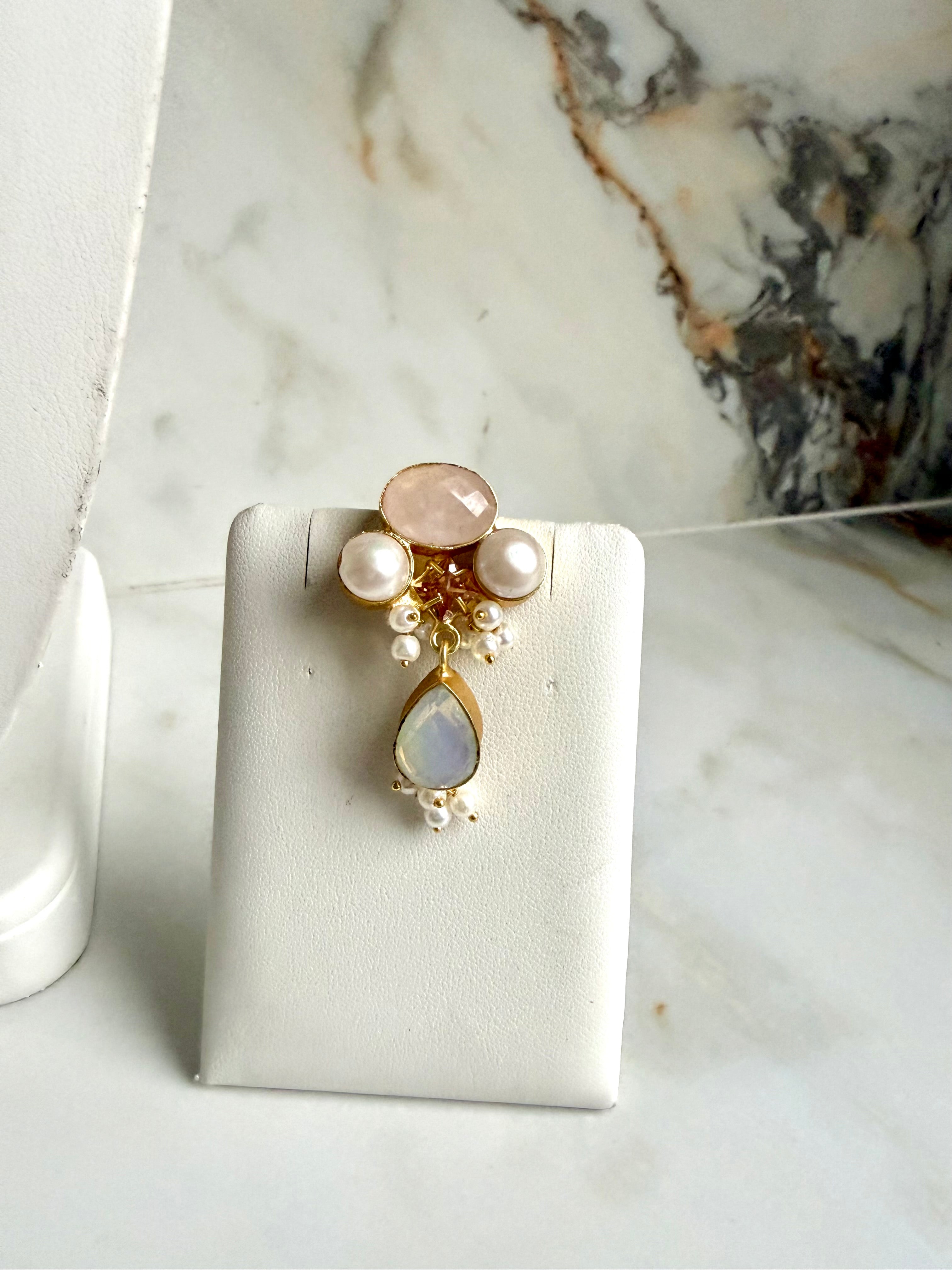 Noor-e-Dhūmra is a statement quartz choker set that blends royal depth with soft luminosity. Handcrafted with quartz stones, opalescent drops, and delicate freshwater pearls, this heritage-inspired design sits gracefully along the neckline, exuding vintage bridal elegance. Finished in a warm gold tone, the set is paired with matching earrings, making it perfect for day weddings, engagement ceremonies, and ivory or pastel bridal ensembles. A timeless piece that reflects quiet luxury and regal charm.