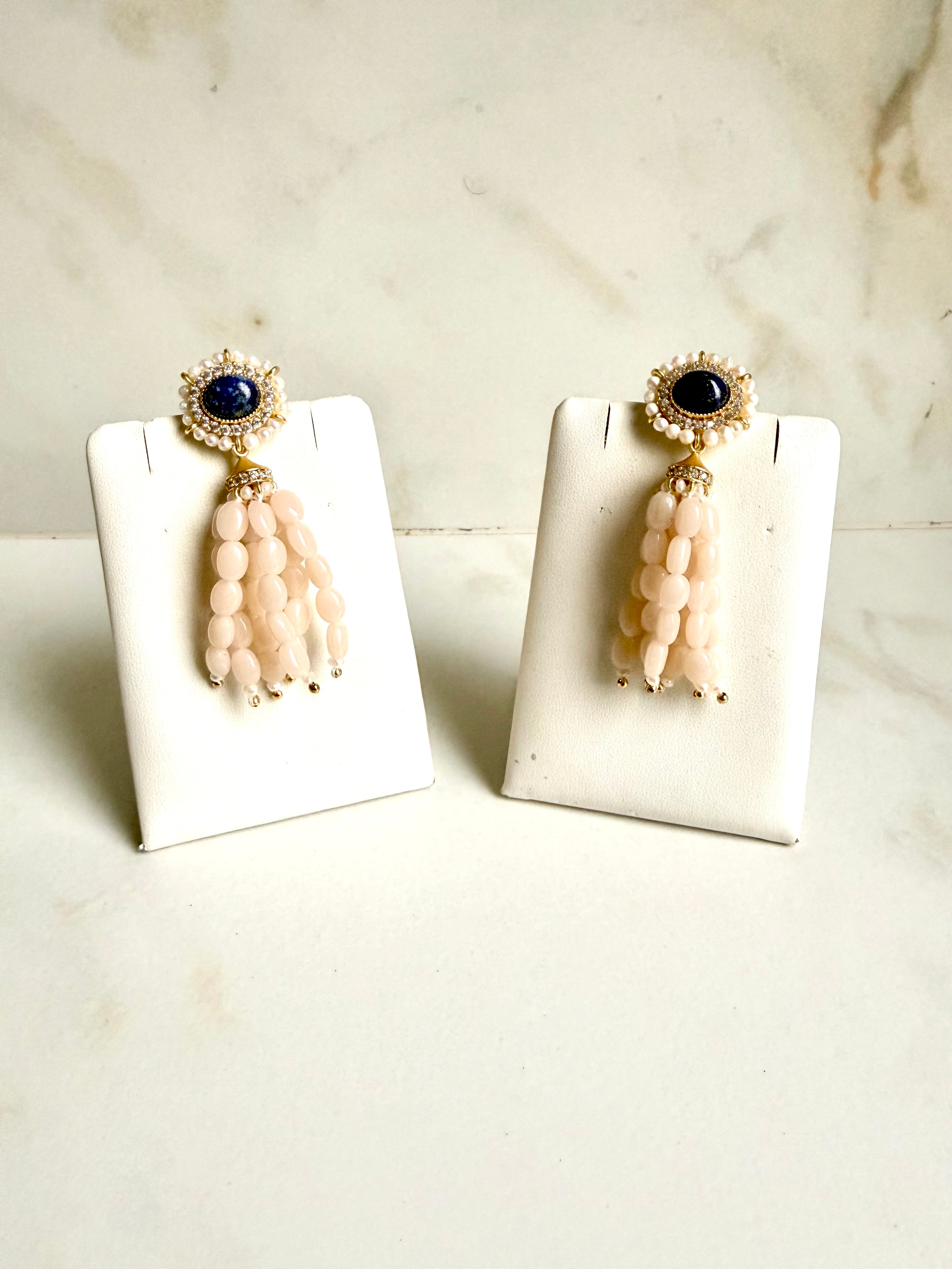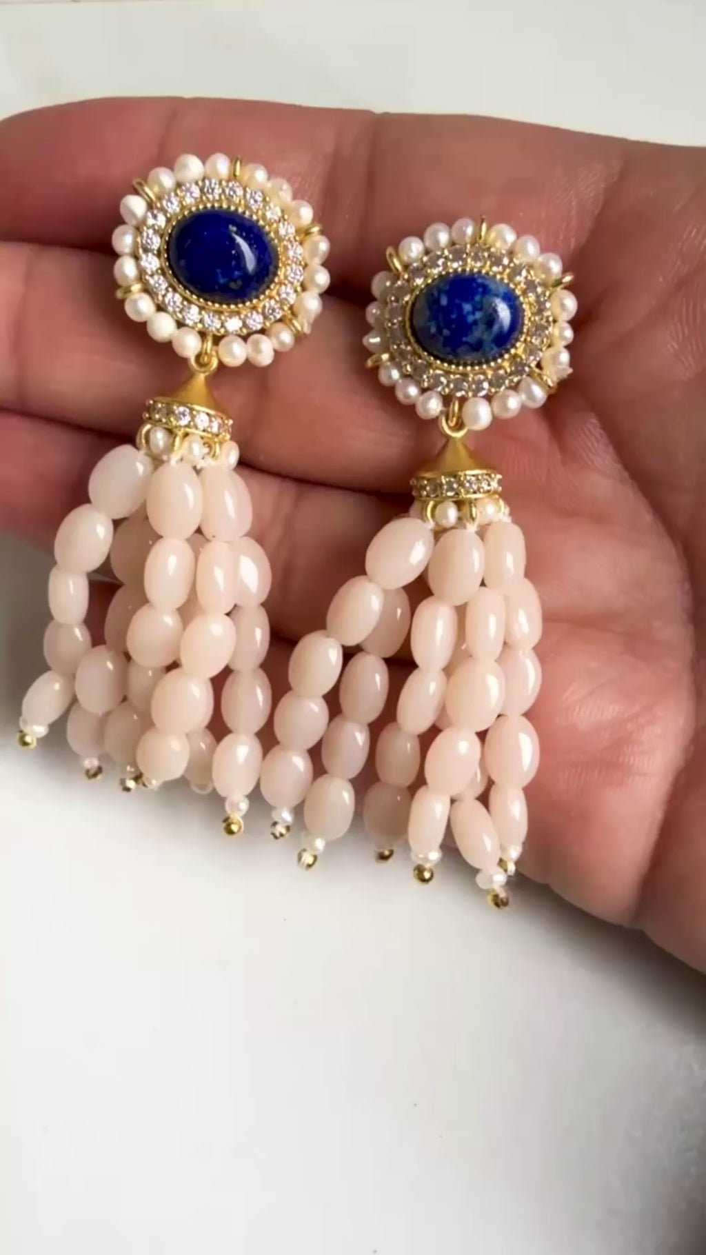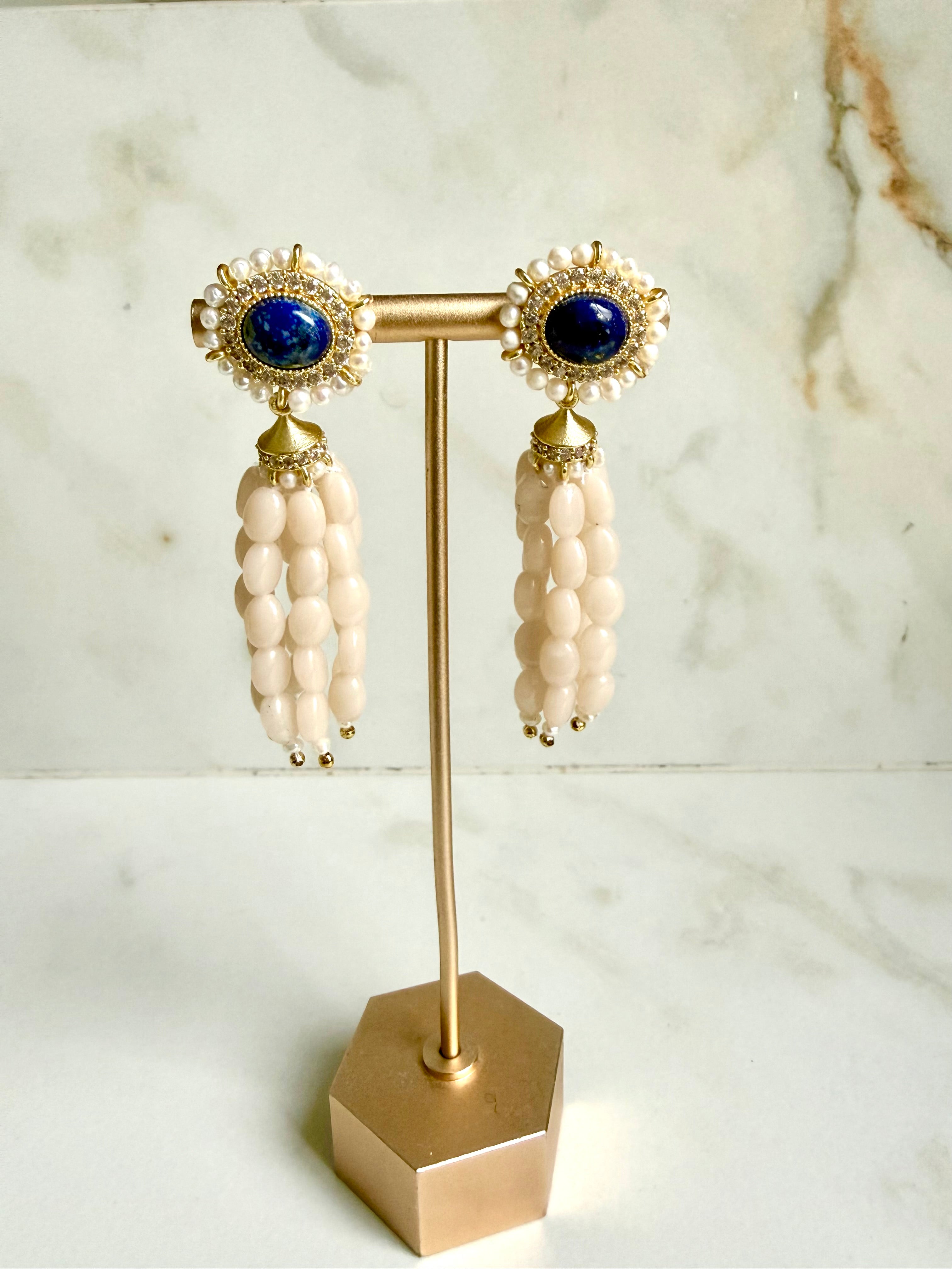 A graceful blend of elegance and playfulness, the lapis Cascade Polki Drops feature a delicate polki-style stud crowned with a Navy tone, encircled by fine pearls. Flowing below is a dreamy cascade of faceted bead drops that add movement, charm, and a hint of romance to every look.