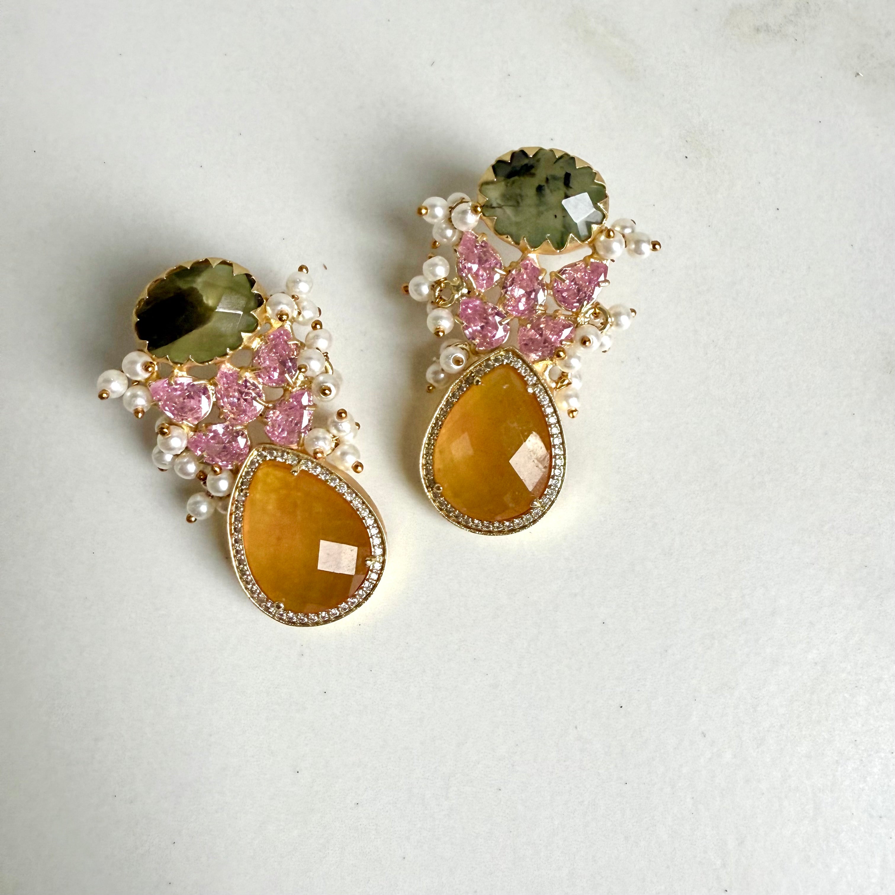 The Neel Tara Earrings bring together the serene beauty of gemstones with the elegance of Indian craftsmanship. A vibrant orange stone crowns the design, followed by a cascade of marquise-cut crystals and delicate hand-set pearls. The look is completed with a striking aqua teardrop gem, edged in fine zircon for added brilliance.