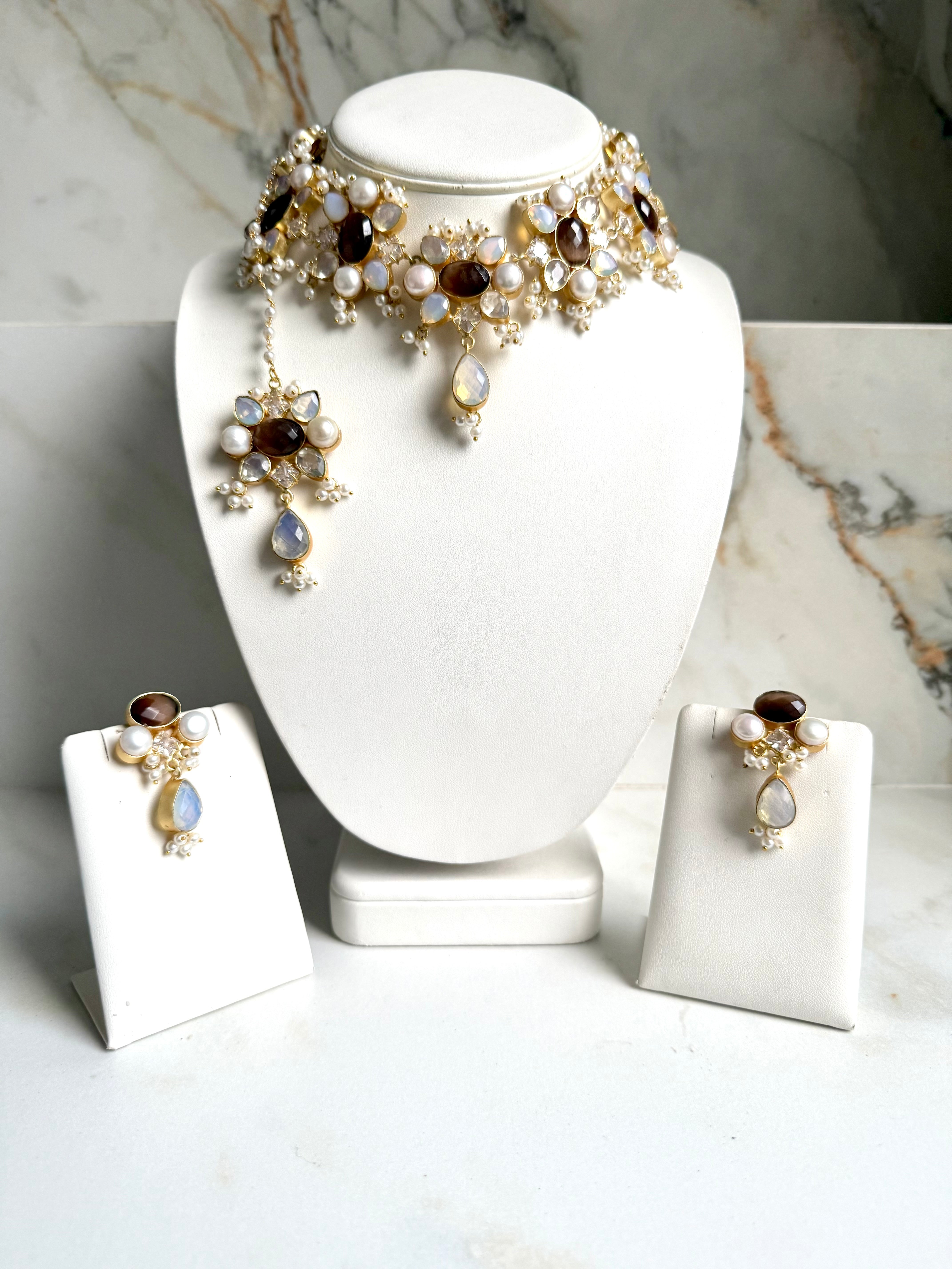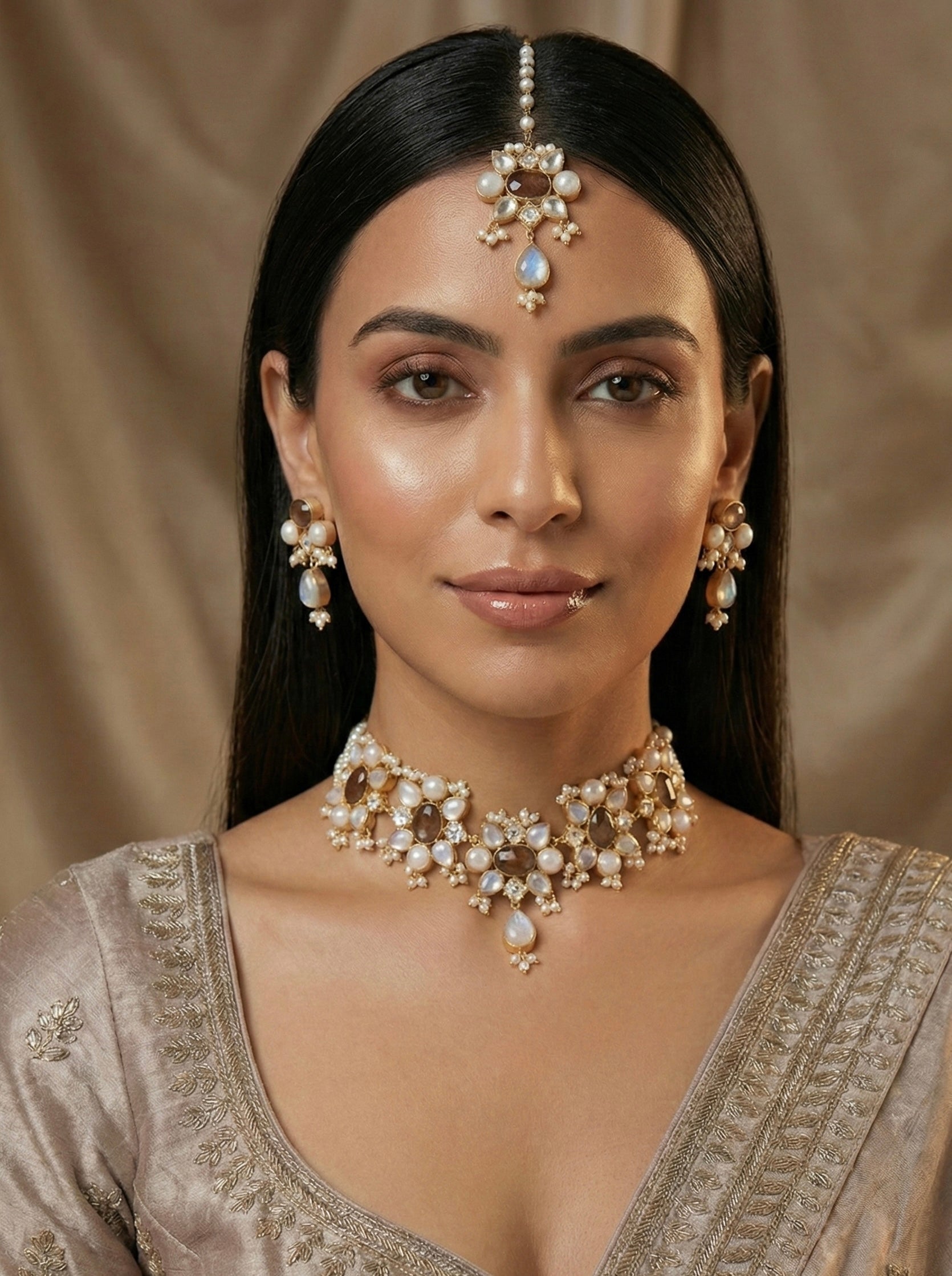 Noor-e-Dhūmra is a statement smoky quartz choker set that blends royal depth with soft luminosity. Handcrafted with quartz stones, opalescent drops, and delicate freshwater pearls, this heritage-inspired design sits gracefully along the neckline, exuding vintage bridal elegance. Finished in a warm gold tone, the set is paired with matching earrings, making it perfect for day weddings, engagement ceremonies, and ivory or pastel bridal ensembles. A timeless piece that reflects quiet luxury and regal charm.