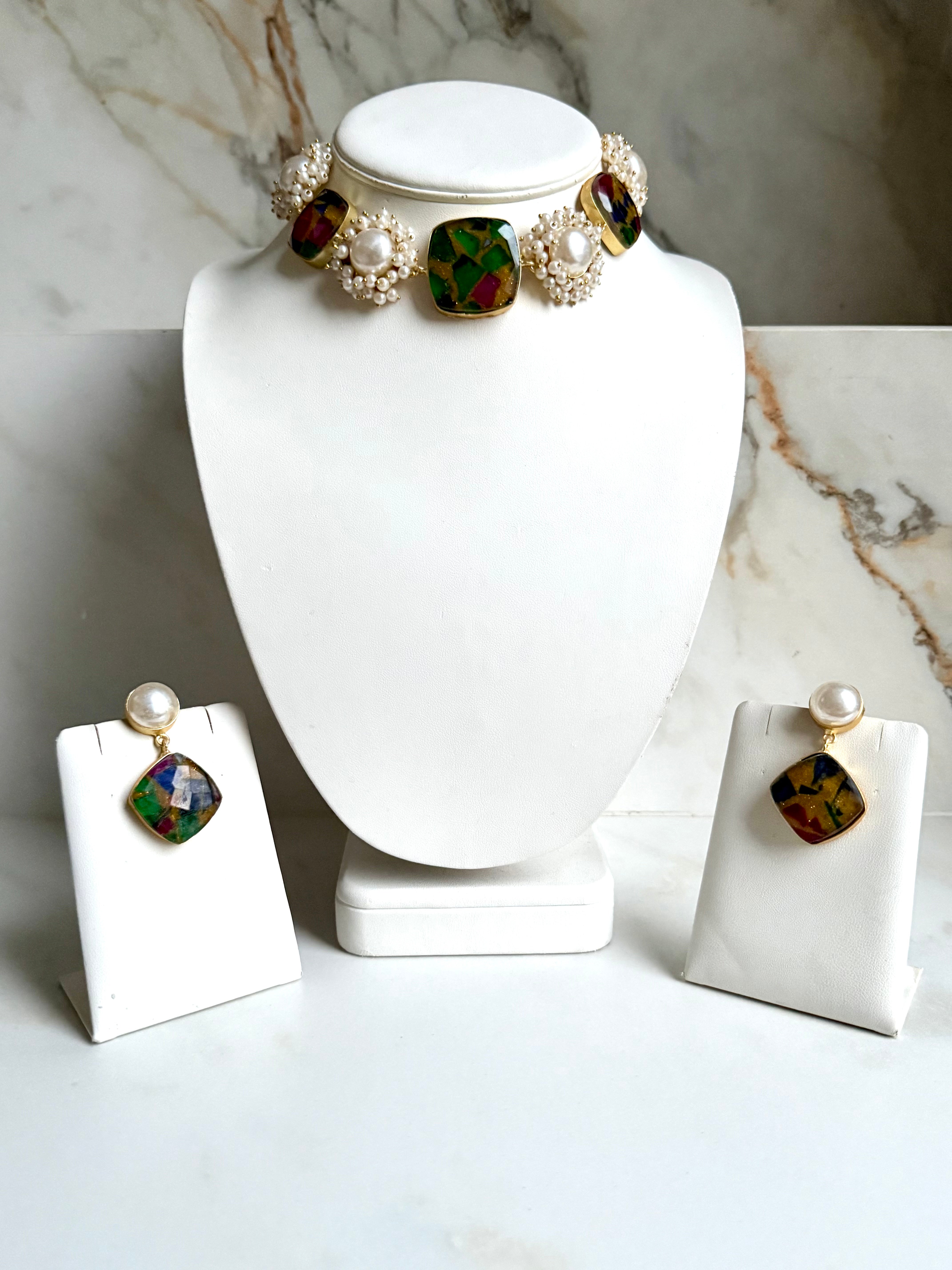 Set radiates timeless elegance through vibrant hand-crafted enamel work set in gold tones, accented with lustrous pearls. Perfect for festive occasions and wedding celebrations, this choker-style necklace with matching earrings beautifully blends traditional charm and modern grace.