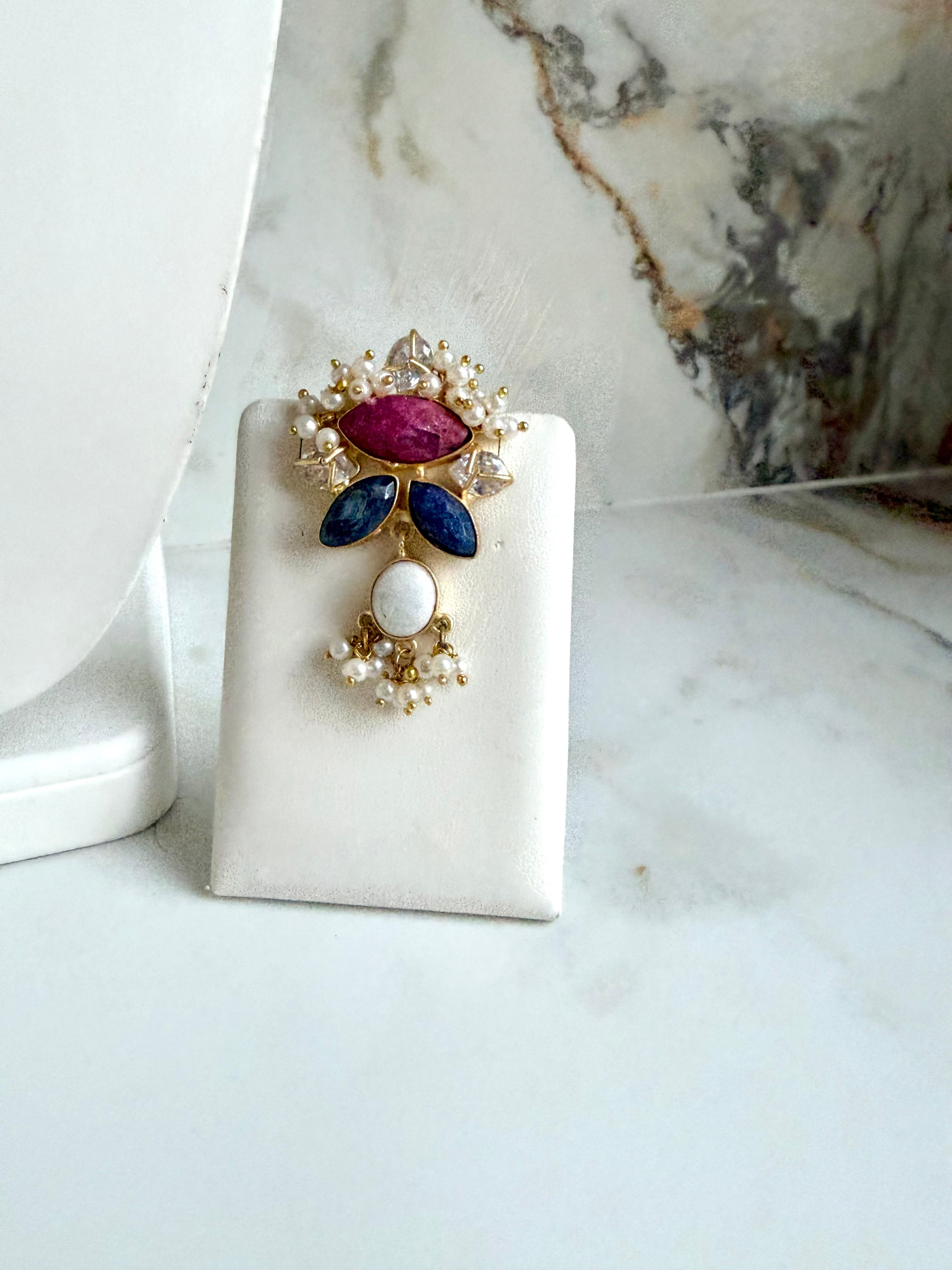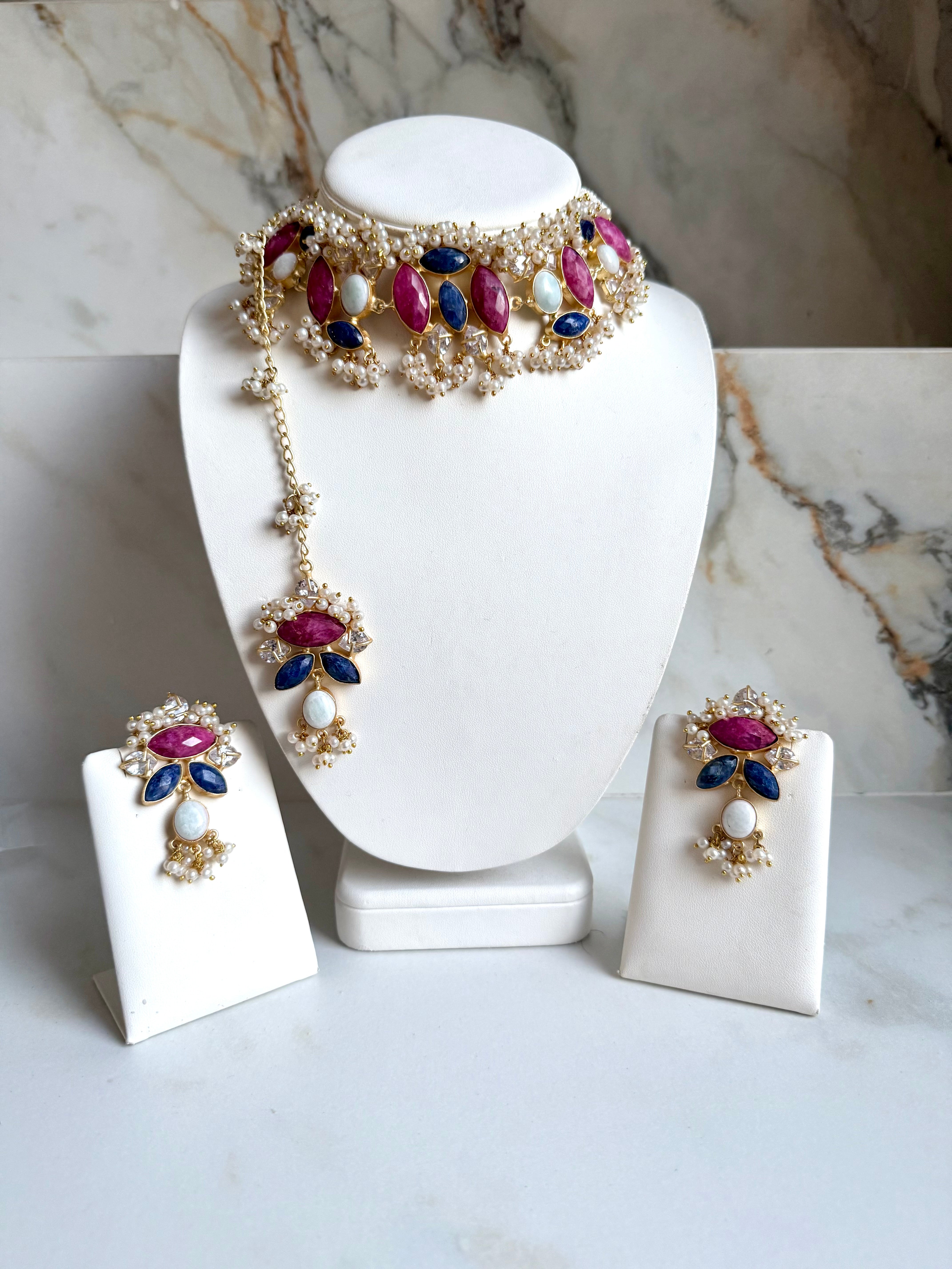 This stunning Pink & Navy Set features a harmonious combination of gorgeous pink stones and elegant navy stones, adorned with sparkling crystals. Perfect for adding a touch of sophistication to any outfit. Don't miss out on this must-have accessory.