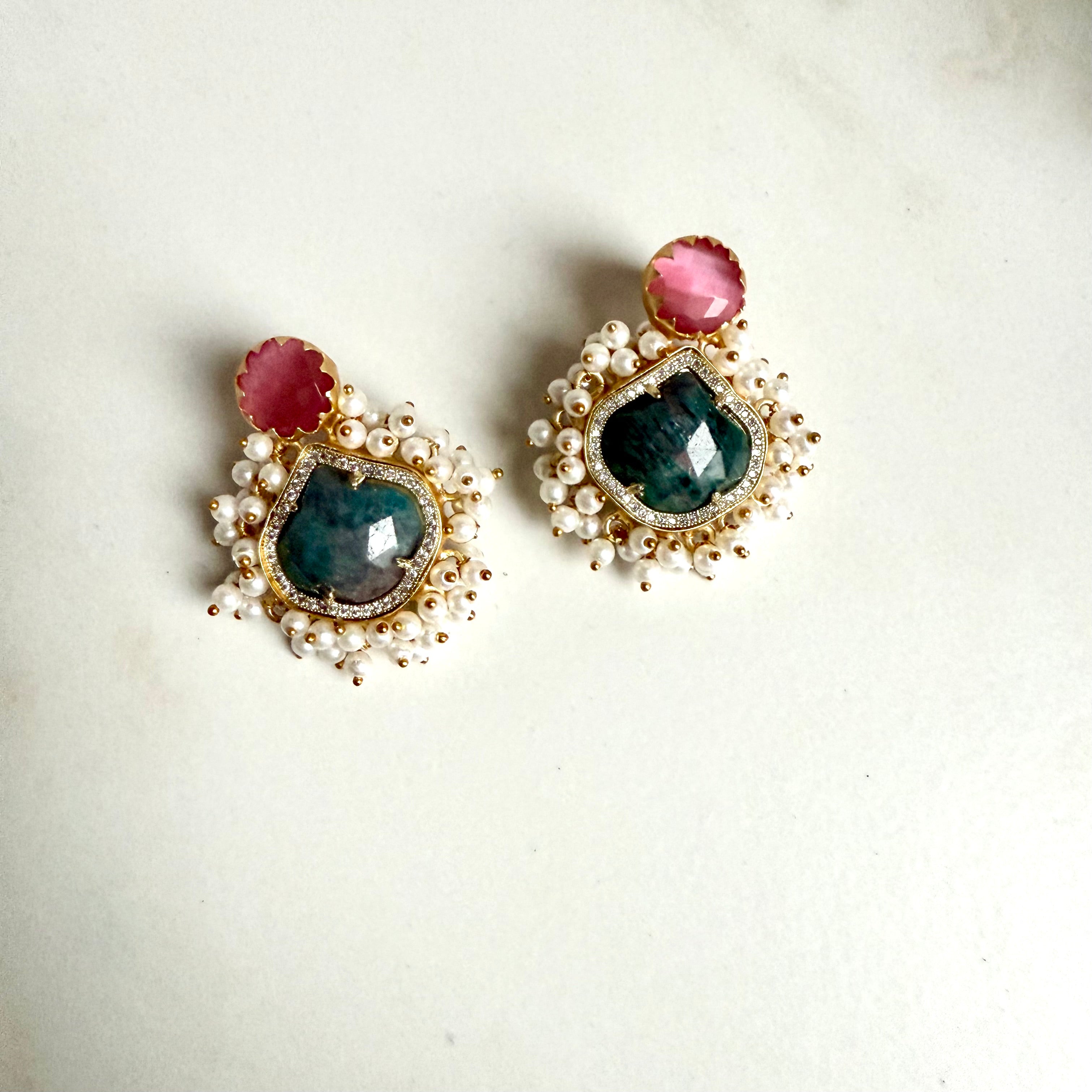 These Pink and Teal Gemstone Pearl Cluster Earrings combine a faceted teal centre stone with CZ edging and hand-beaded pearls, topped with a soft pink stud. This colour combination is perfect for mehndi functions, pastel Indian outfits, festive jewellery styling, and statement traditional looks.