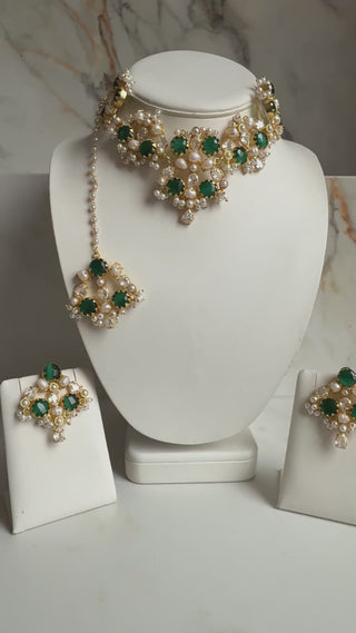 Perfect for weddings, receptions, sangeet, and festive occasions, this handcrafted Indian jewelry set blends traditional elegance with modern sophistication. The pearl detailing adds a graceful touch, while the green stones enhance the richness of the overall design, making it ideal for brides and festive wear lovers alike.