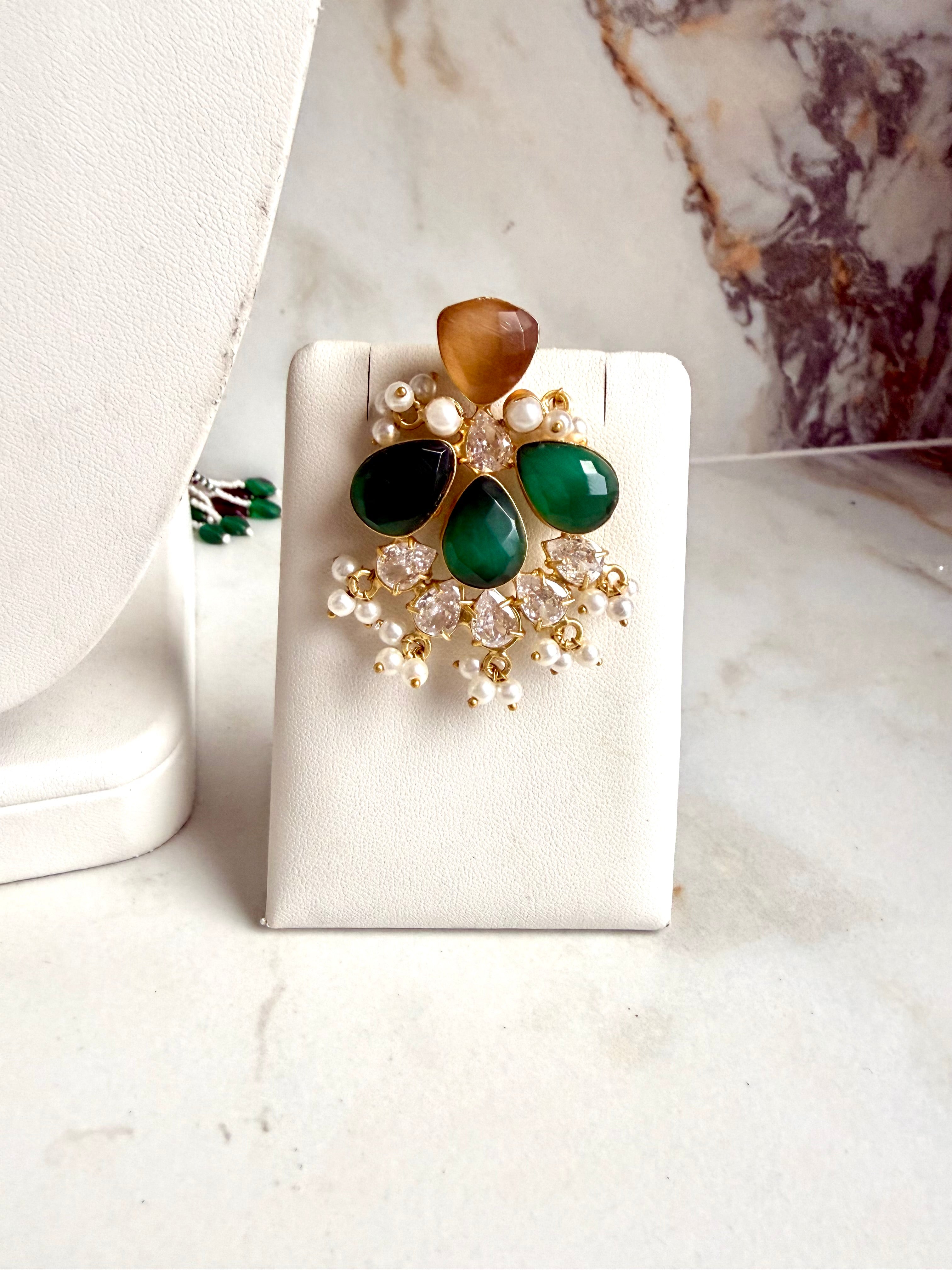 A timeless floral masterpiece handcrafted in rich gold tones, the Pushpa Ratna Set features striking emerald stones paired with mustard hues, delicately encircled by natural pearl clusters. Inspired by blooming flowers and traditional artistry, this statement choker with matching earrings is designed to elevate bridal, festive, and heirloom looks with effortless grace.