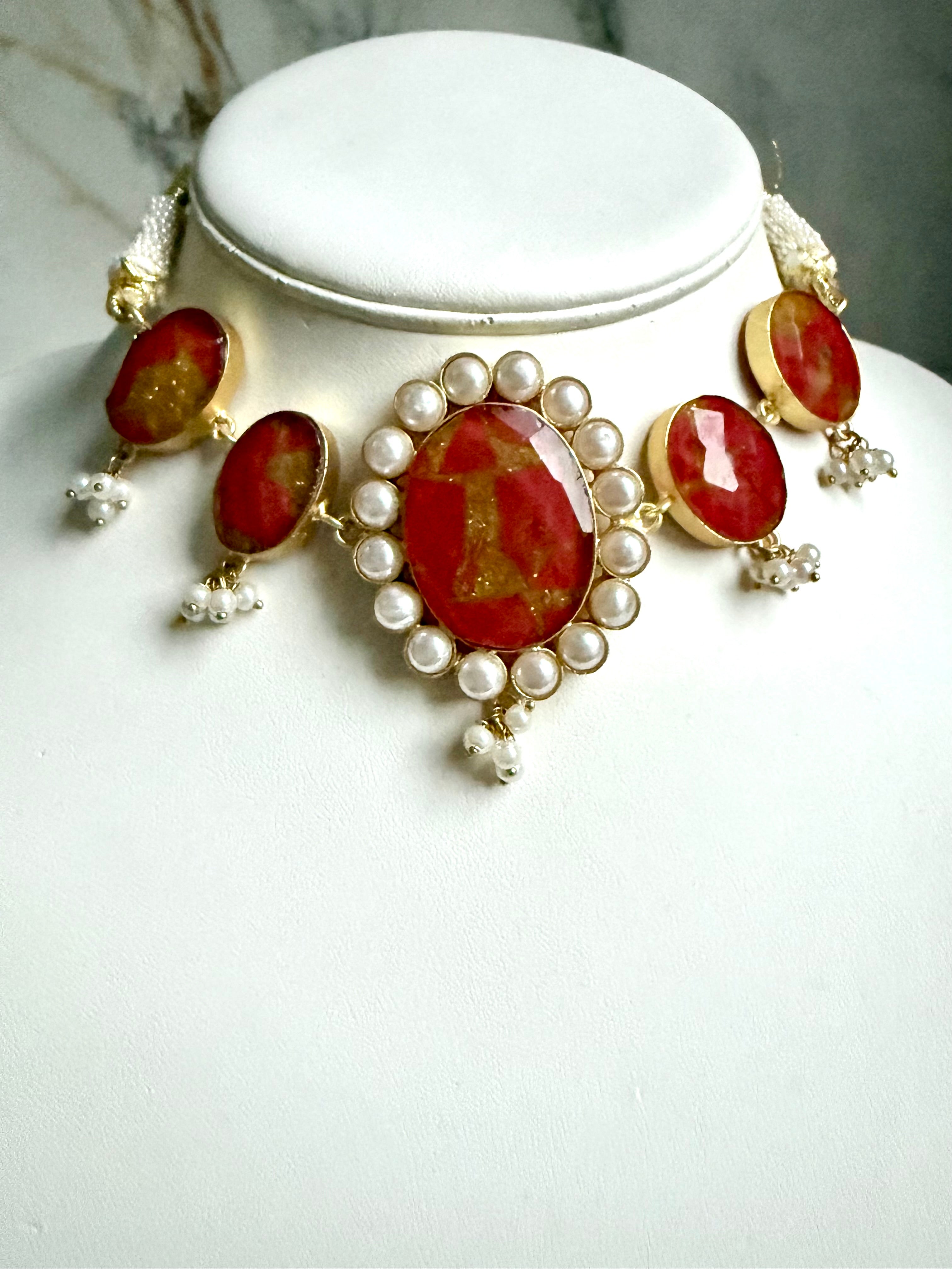 Set radiates timeless elegance through vibrant hand-crafted enamel work set in gold tones, accented with lustrous pearls. Perfect for festive occasions and wedding celebrations, this choker-style necklace with matching earrings beautifully blends traditional charm and modern grace.