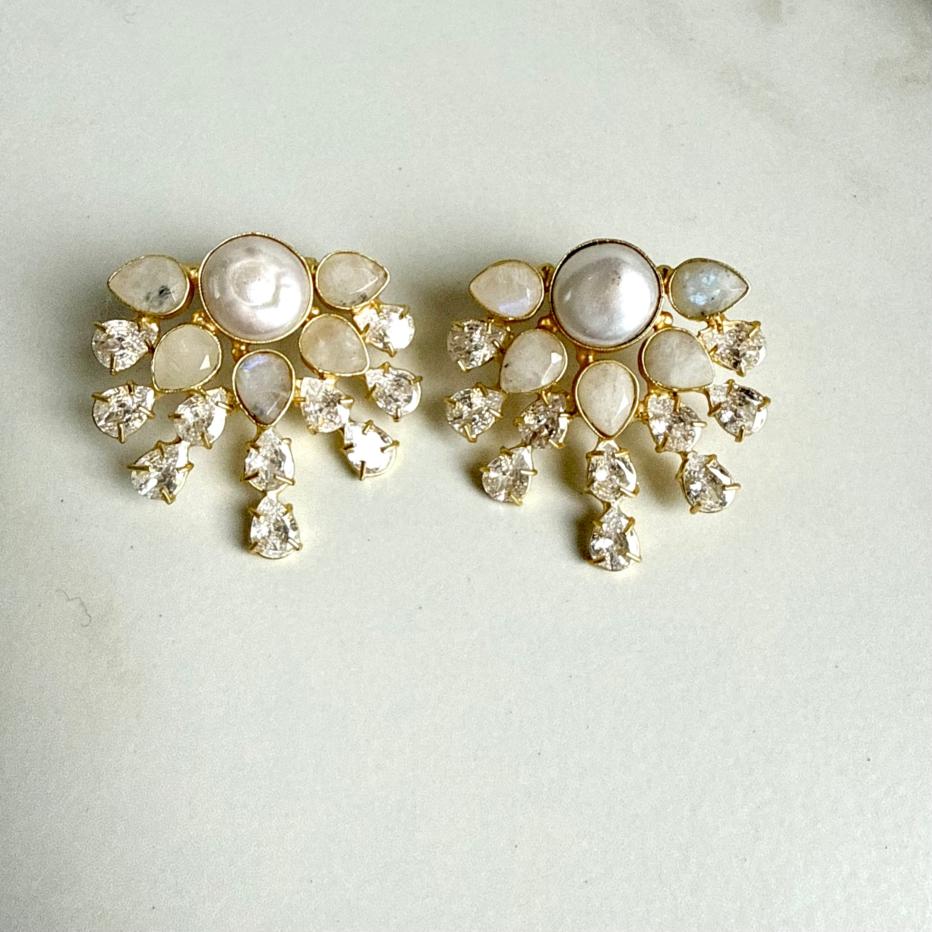 Elegant and radiant, the Aurora Bloom Pearl Earrings are designed to capture the beauty of delicate floral forms. Featuring a luminous round pearl centerpiece surrounded by petal-shaped gemstones and sparkling crystal drops, these earrings create a graceful cascading silhouette that catches the light with every movement.