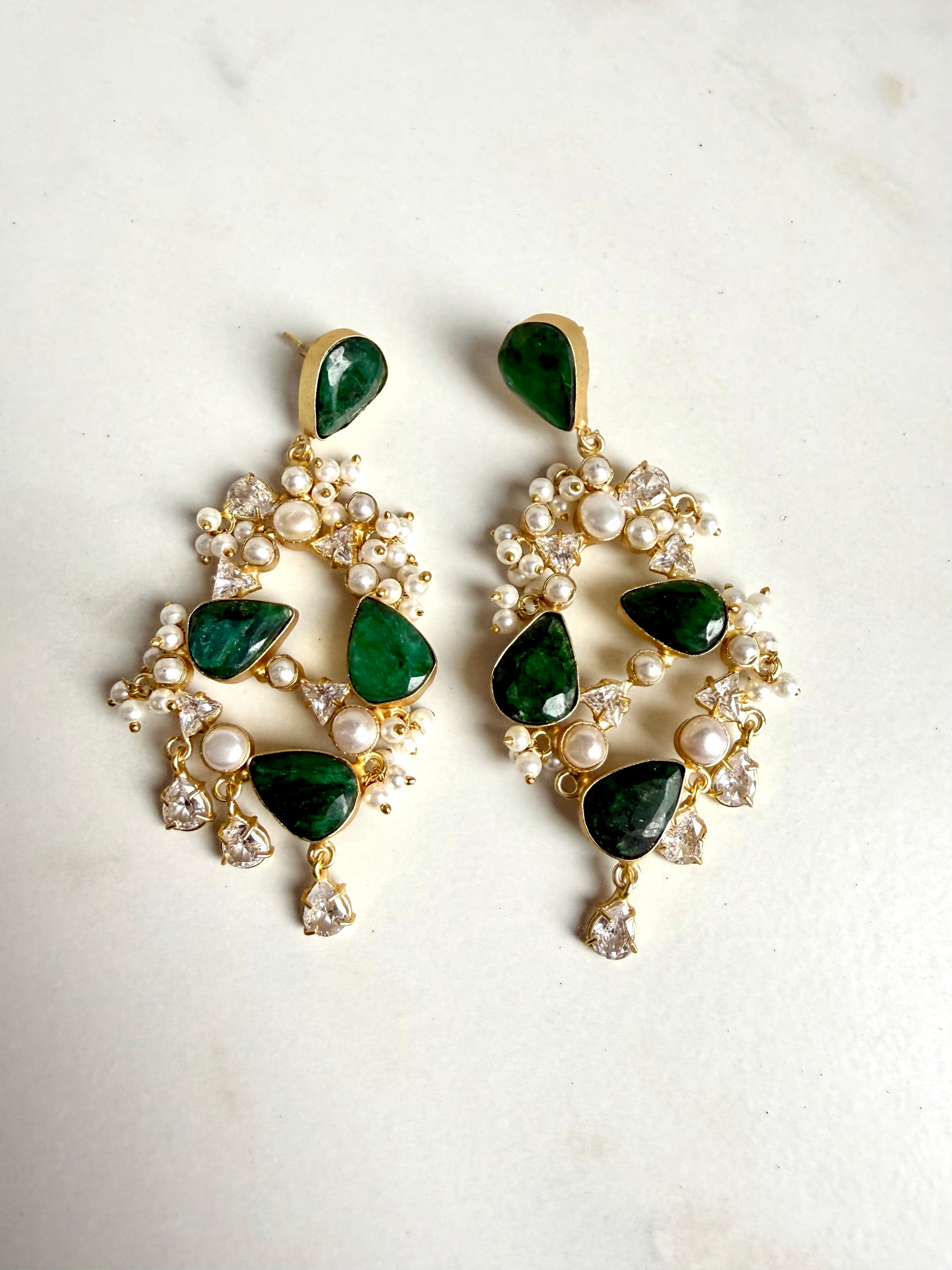 Elevate your festive and bridal look with our handcrafted pearl and gemstone chandelier earrings, designed to exude timeless elegance and royal charm. Featuring beautifully cut teardrop gemstones set in premium gold-finish metal, these statement earrings are adorned with delicate pearl clusters and sparkling crystal accents for a luxurious finish.