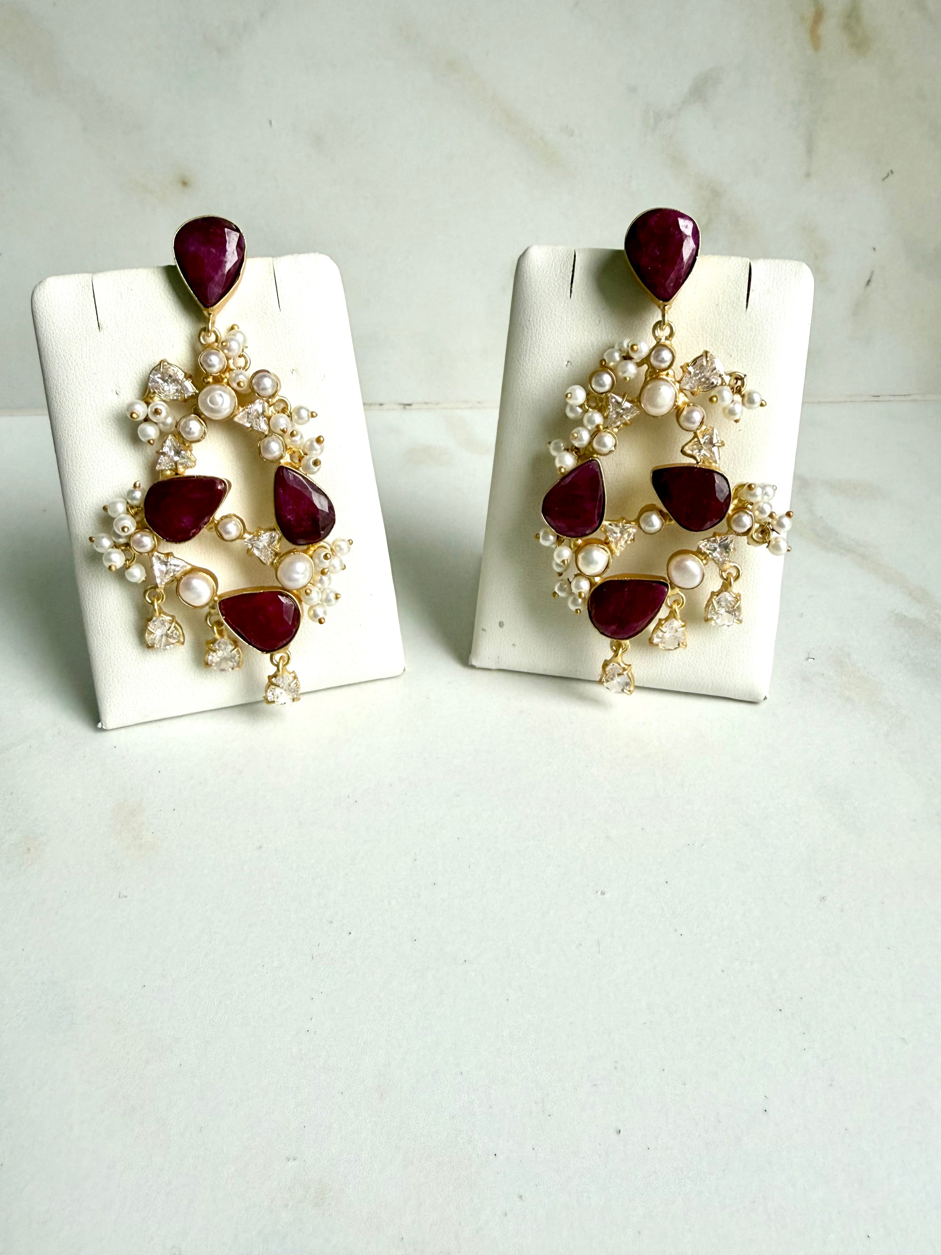 Elevate your festive and bridal look with our handcrafted pearl and gemstone chandelier earrings, designed to exude timeless elegance and royal charm. Featuring beautifully cut teardrop gemstones set in premium gold-finish metal, these statement earrings are adorned with delicate pearl clusters and sparkling crystal accents for a luxurious finish.