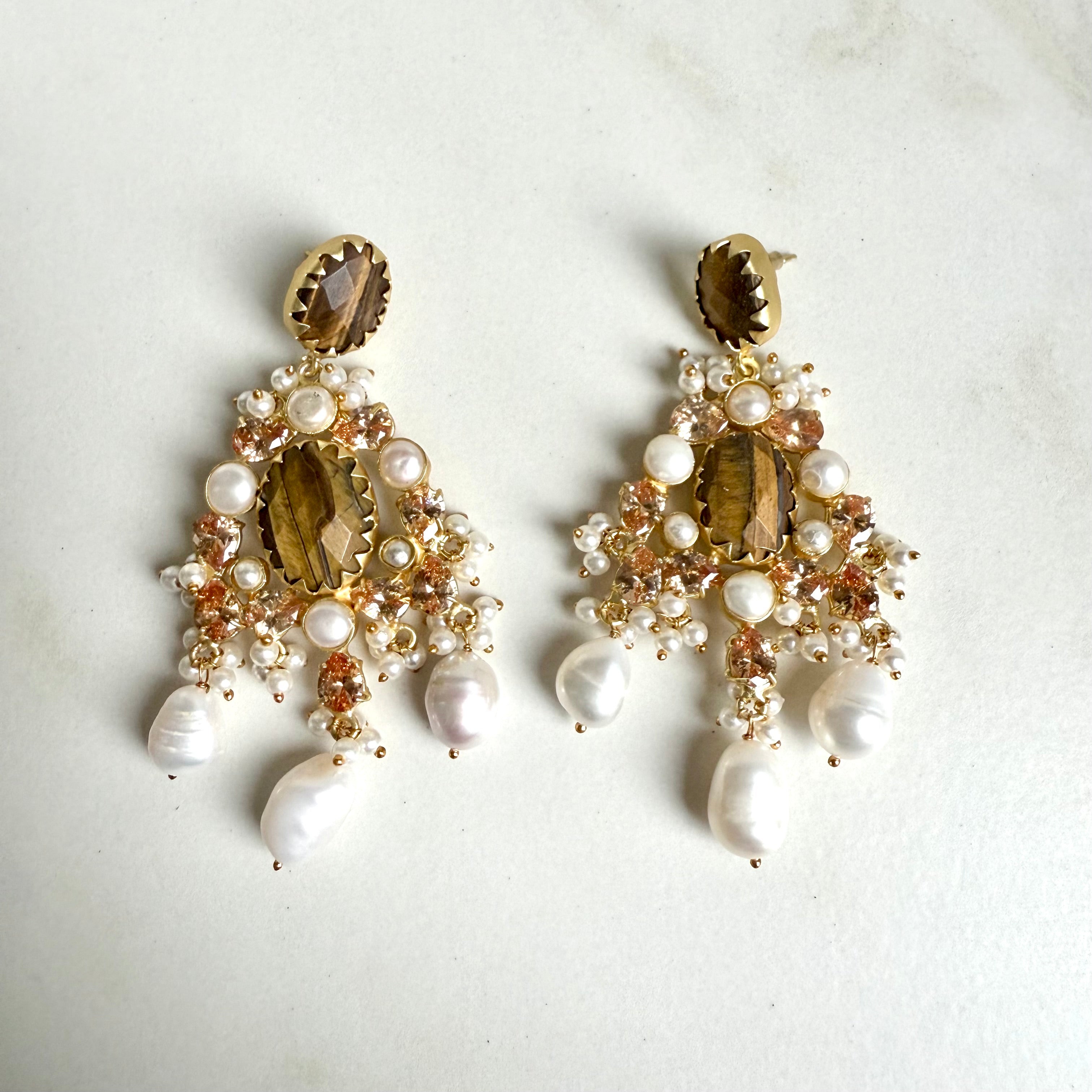 Featuring smoky topaz stones with carved leaf centers, complemented by warm crystals and pearls. These earrings offer an antique, earthy aesthetic suited for traditional outfits and intimate wedding functions.