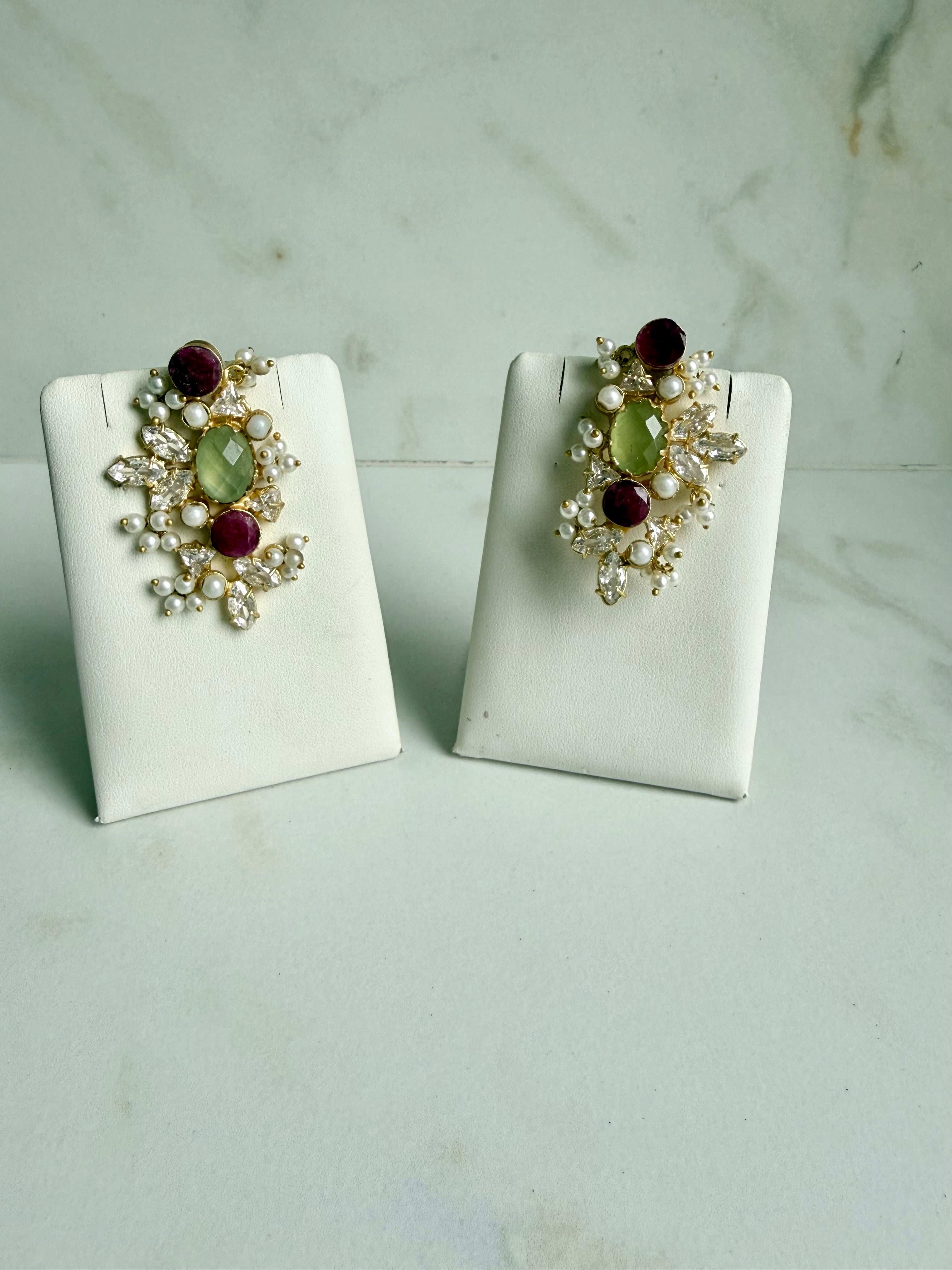 The intricate floral-inspired cluster design creates dimension and sparkle from every angle, making them perfect for weddings, festive occasions, or elevating a contemporary outfit. The contrast of soft pastels with bold jewel tones adds a regal yet modern charm.