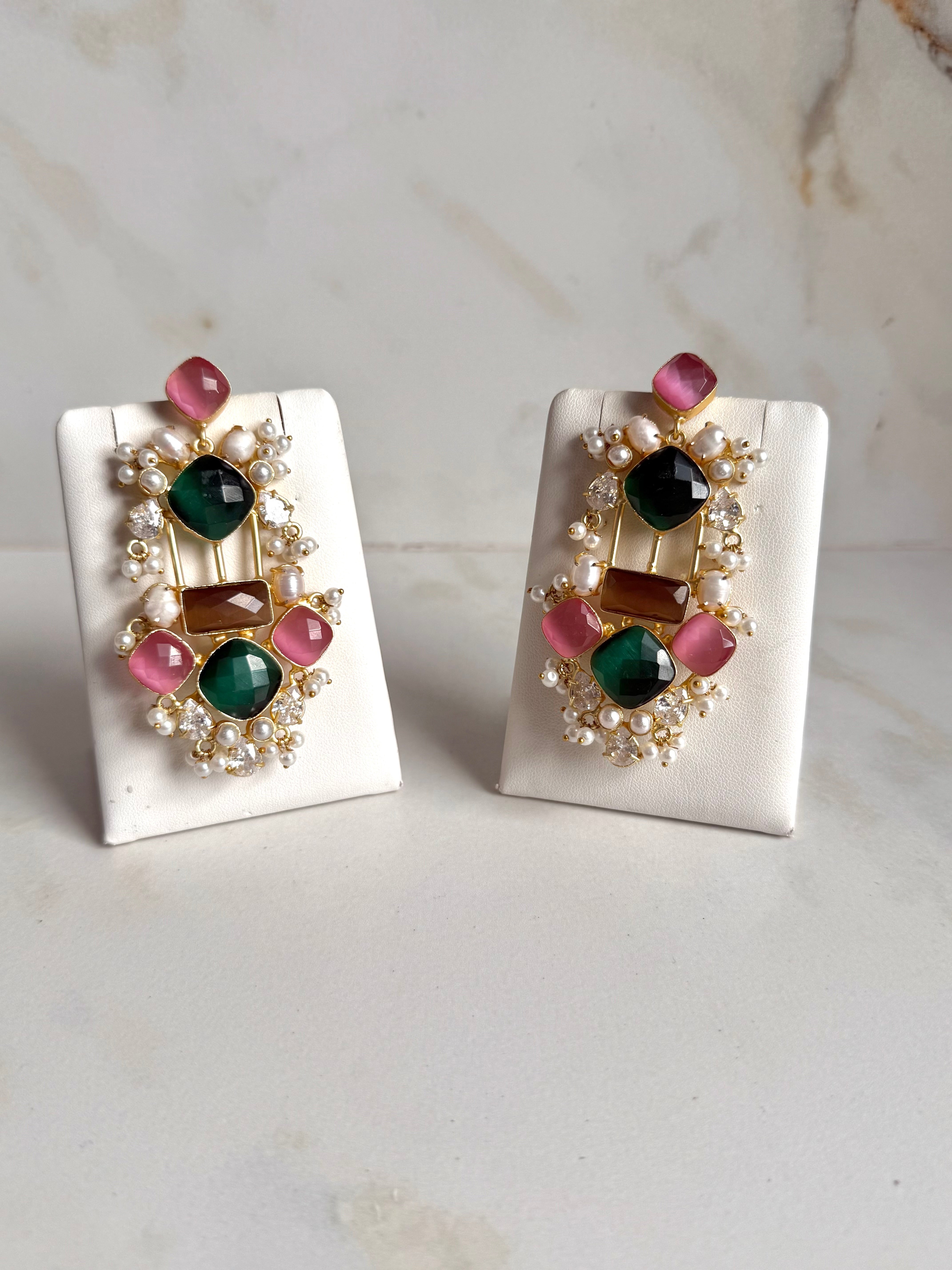 Elevate your bridal elegance with our Zanaat Earrings, a masterpiece of timeless Indian craftsmanship. Adorned with lush green stones, soft pink gems, and delicate pearls set in gold, these earrings exude regal charm. Perfect for weddings and festive occasions, they embody grace, tradition, and modern sophistication — a true statement piece for the modern bride.