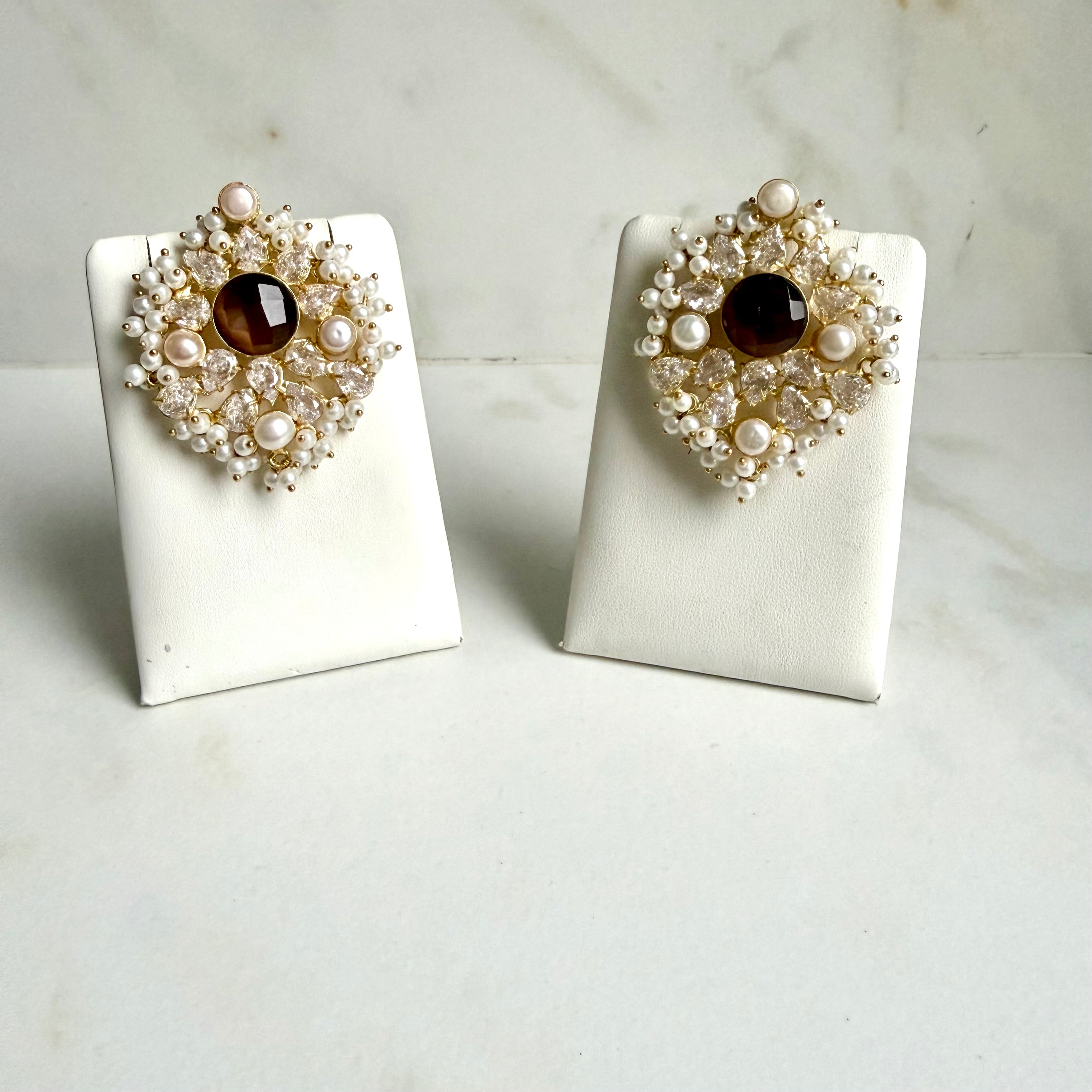 These handcrafted kundan earrings feature a Brown gemstone center, framed by luminous freshwater pearls and sparkling uncut-style stones set in a rich gold-tone base. Designed to balance tradition with modern elegance, they elevate both festive and contemporary looks effortlessly.