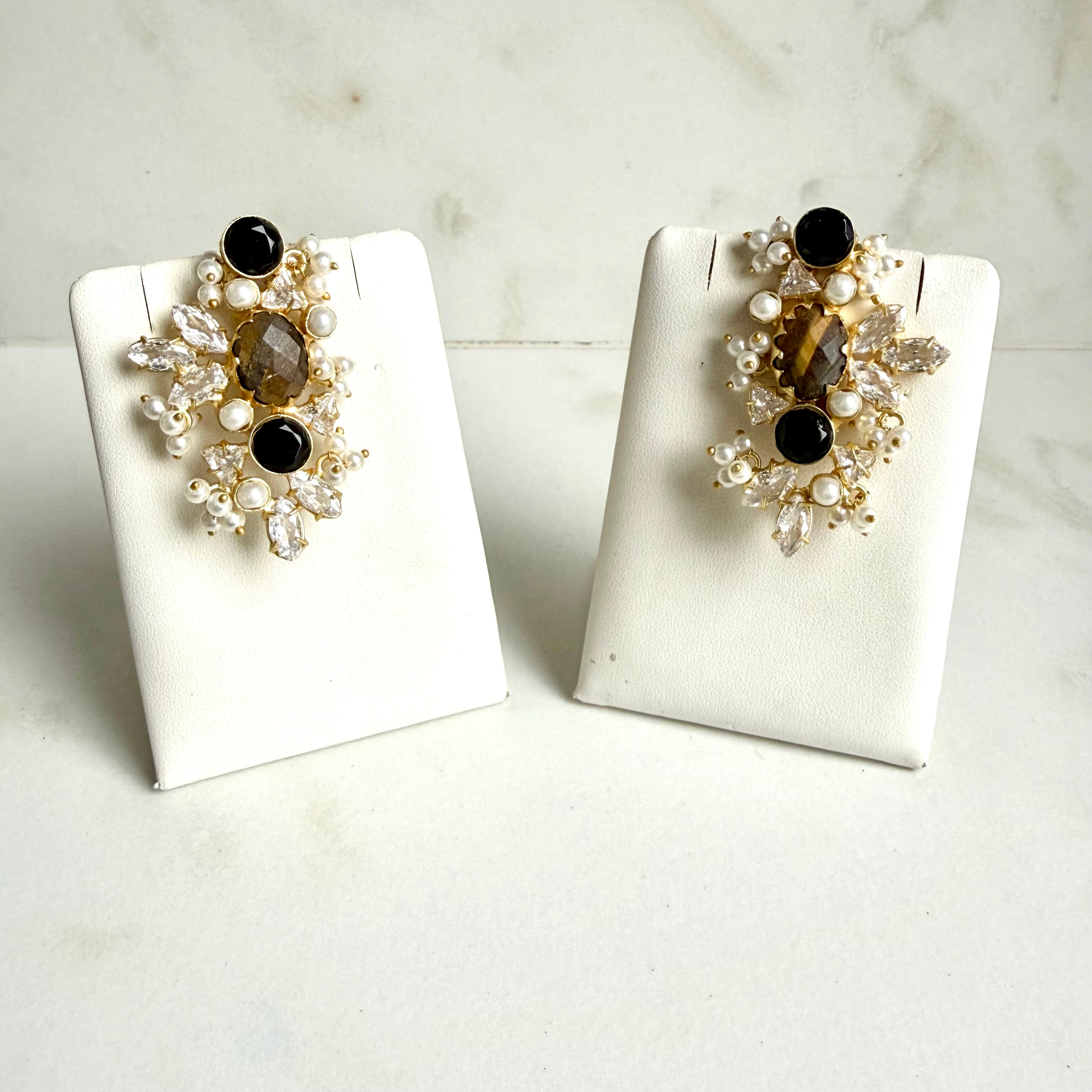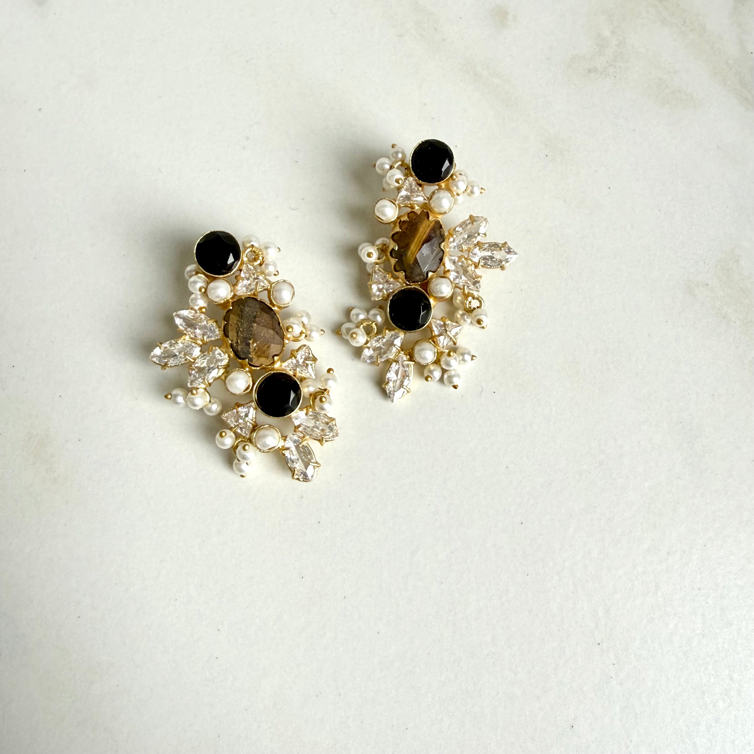 A celebration of colour and craftsmanship, these statement earrings feature a captivating blend of gemstones set in a rich gold-tone frame. At the center lies a serene aqua-hued stone, beautifully complemented by deep amethyst tones, luminous pearls, and brilliant marquise-cut crystals.